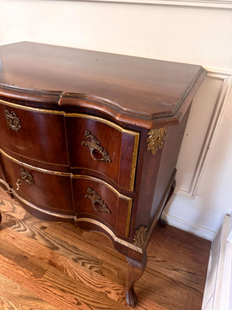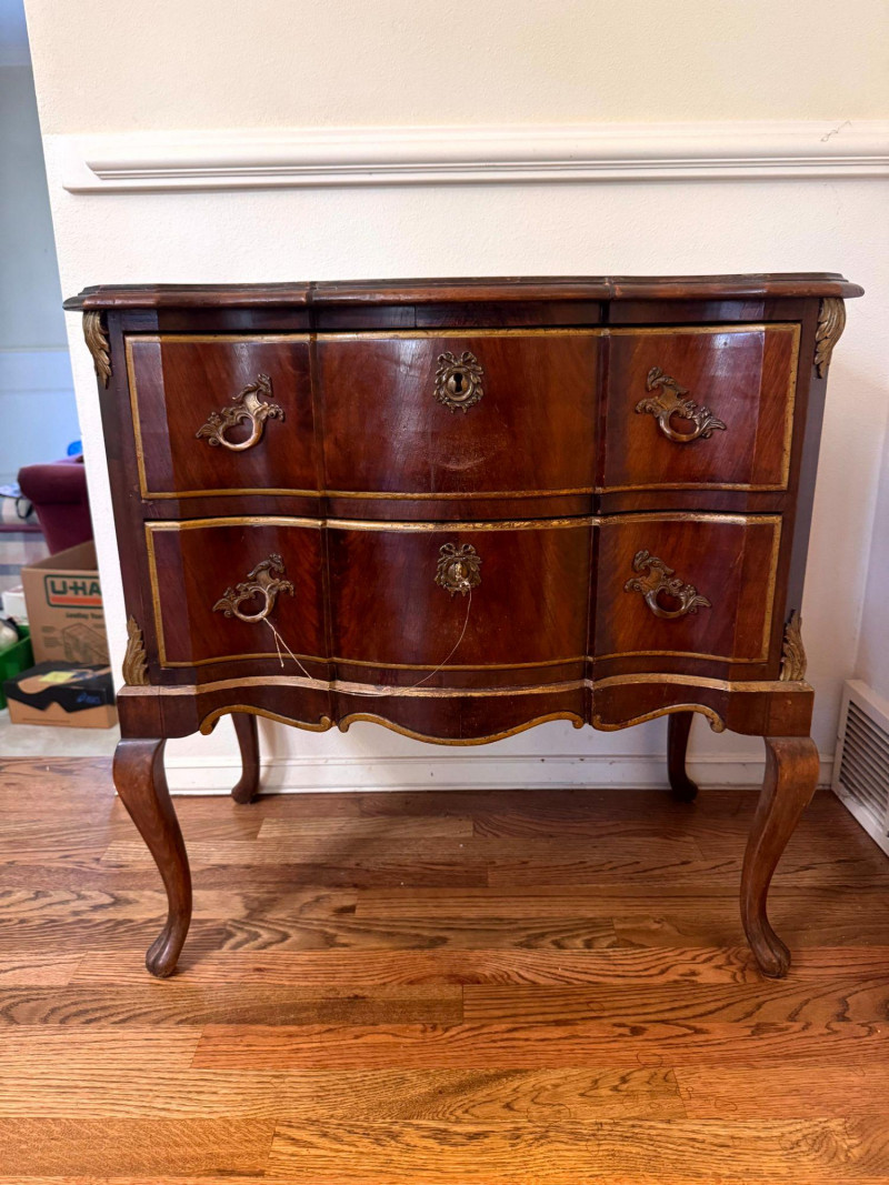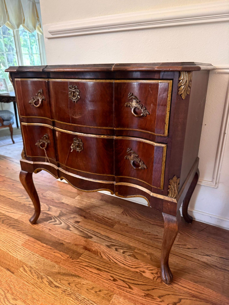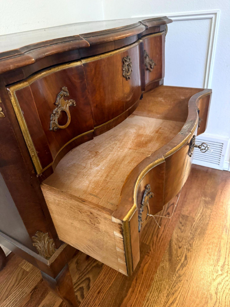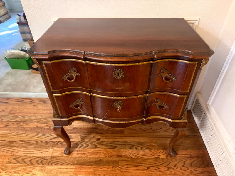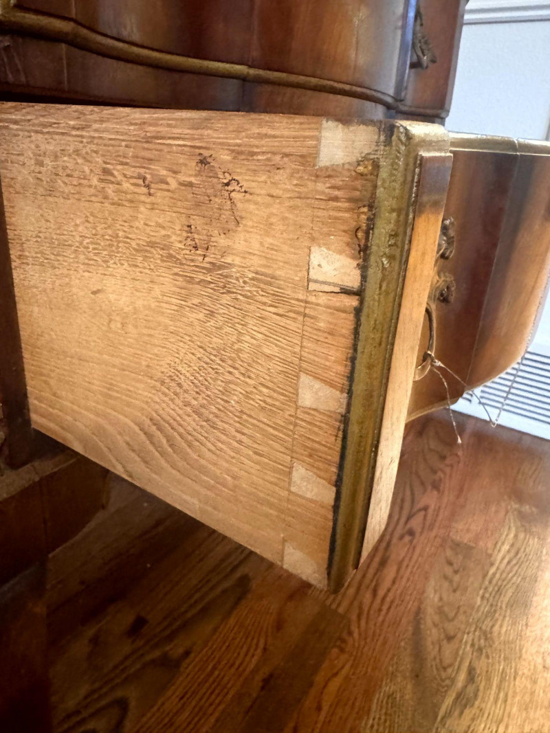 Antique Wood Chest w/ Curved Front Dovetail Drawers & Key.