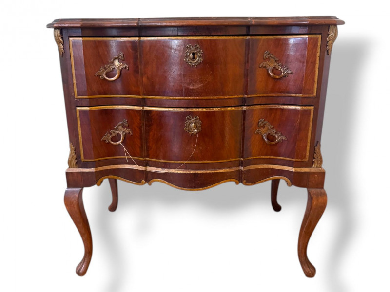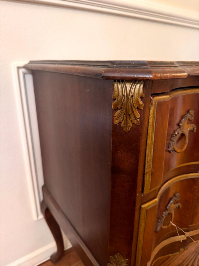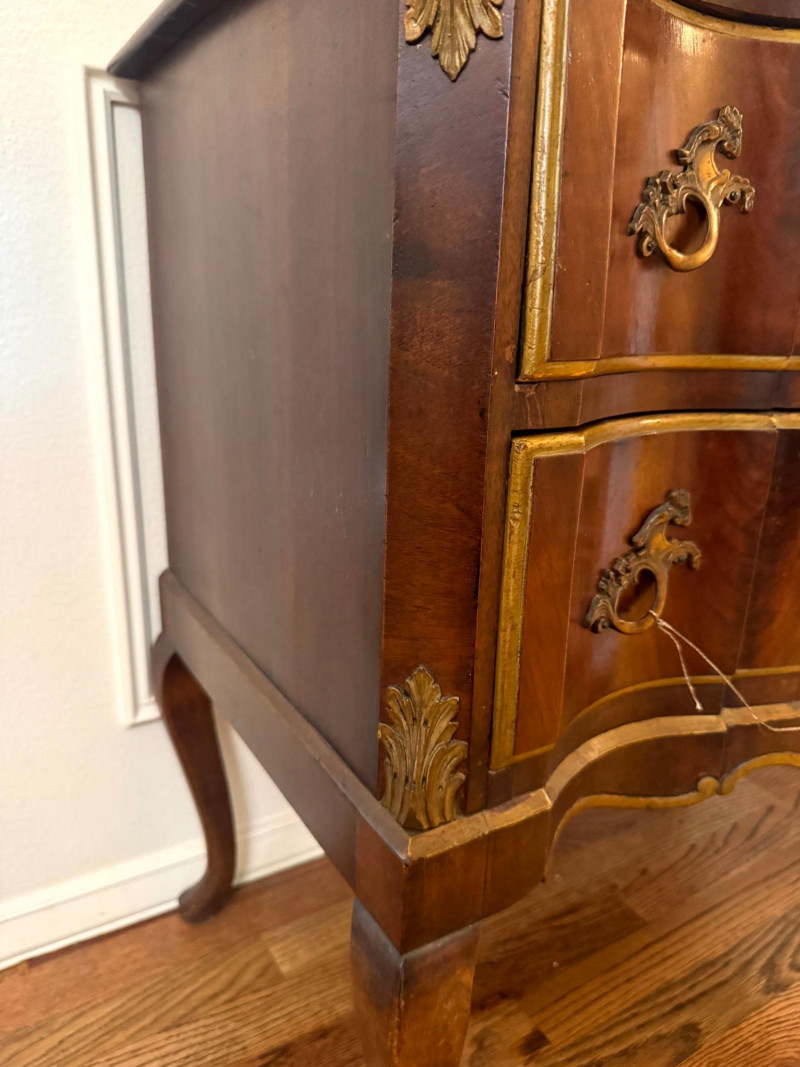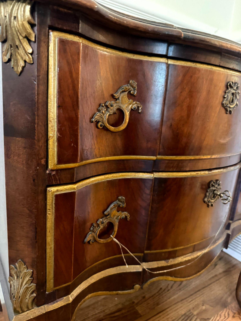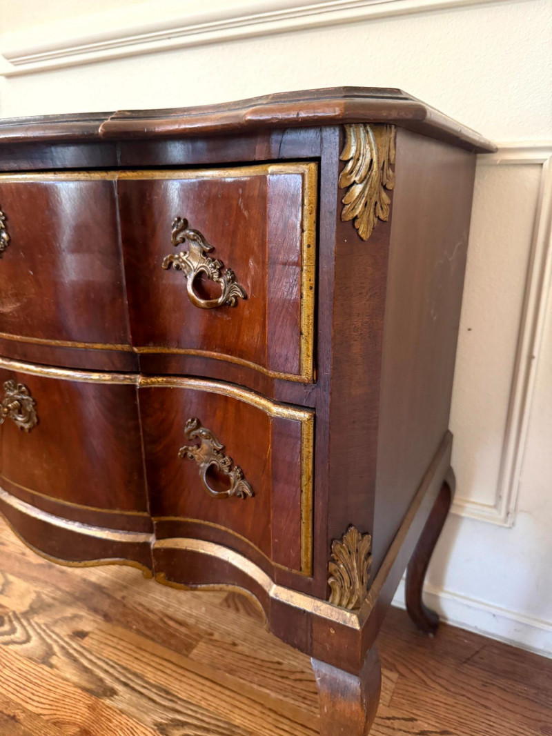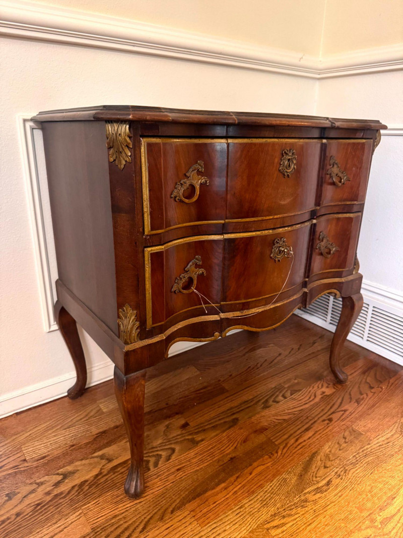 Antique Wood Chest w/ Curved Front Dovetail Drawers & Key.