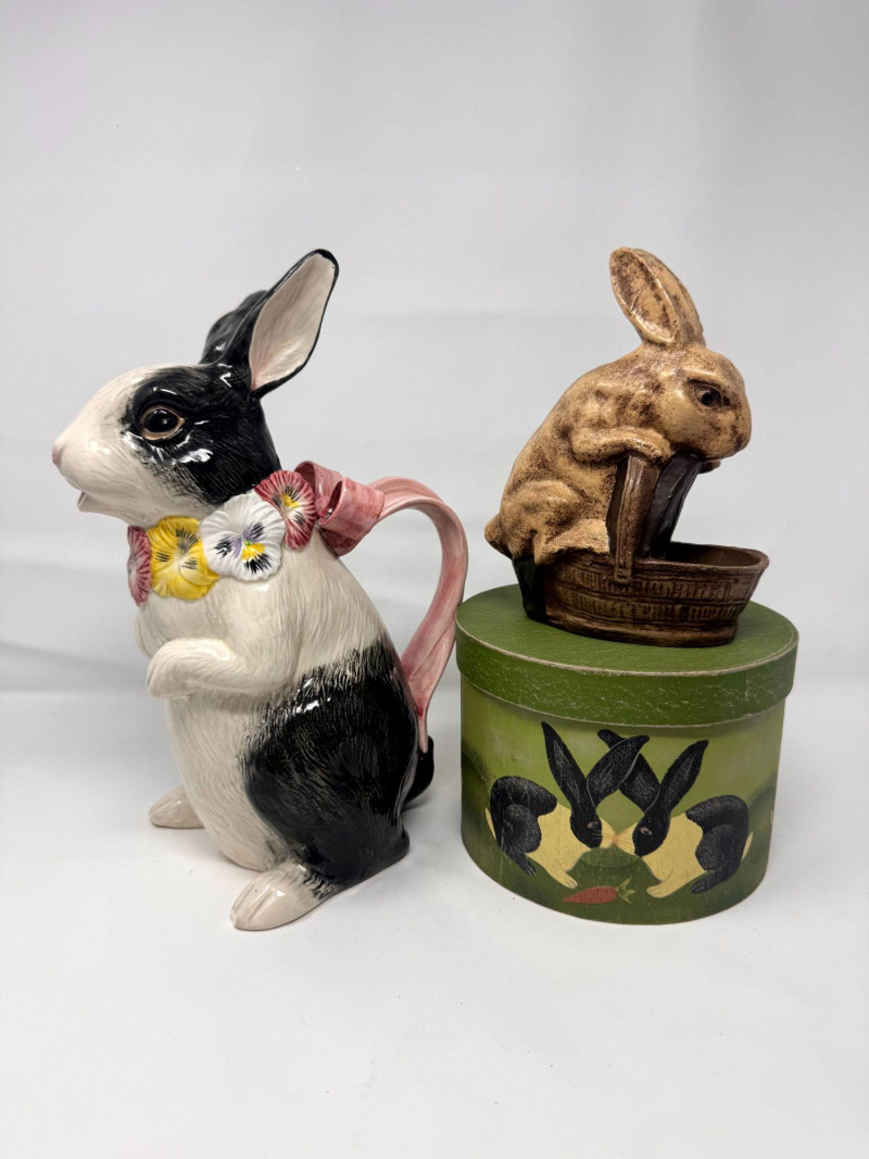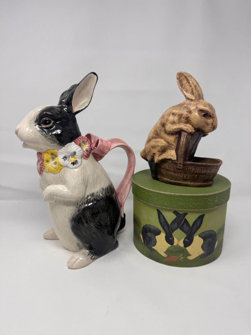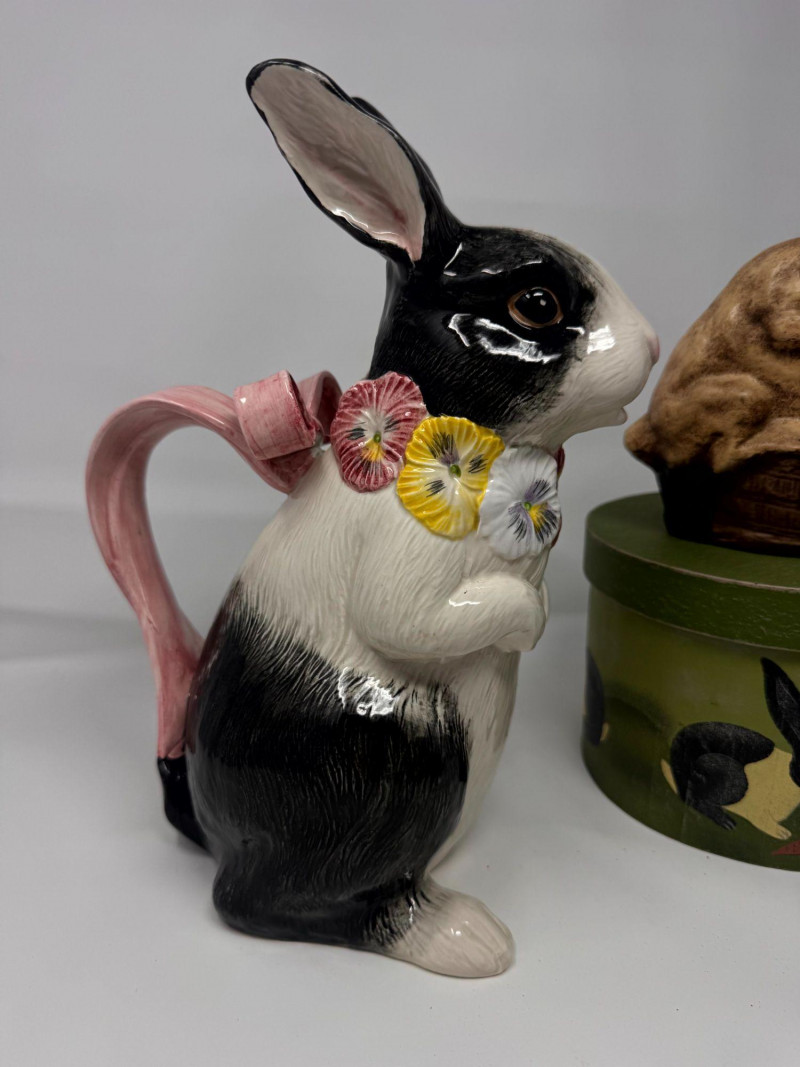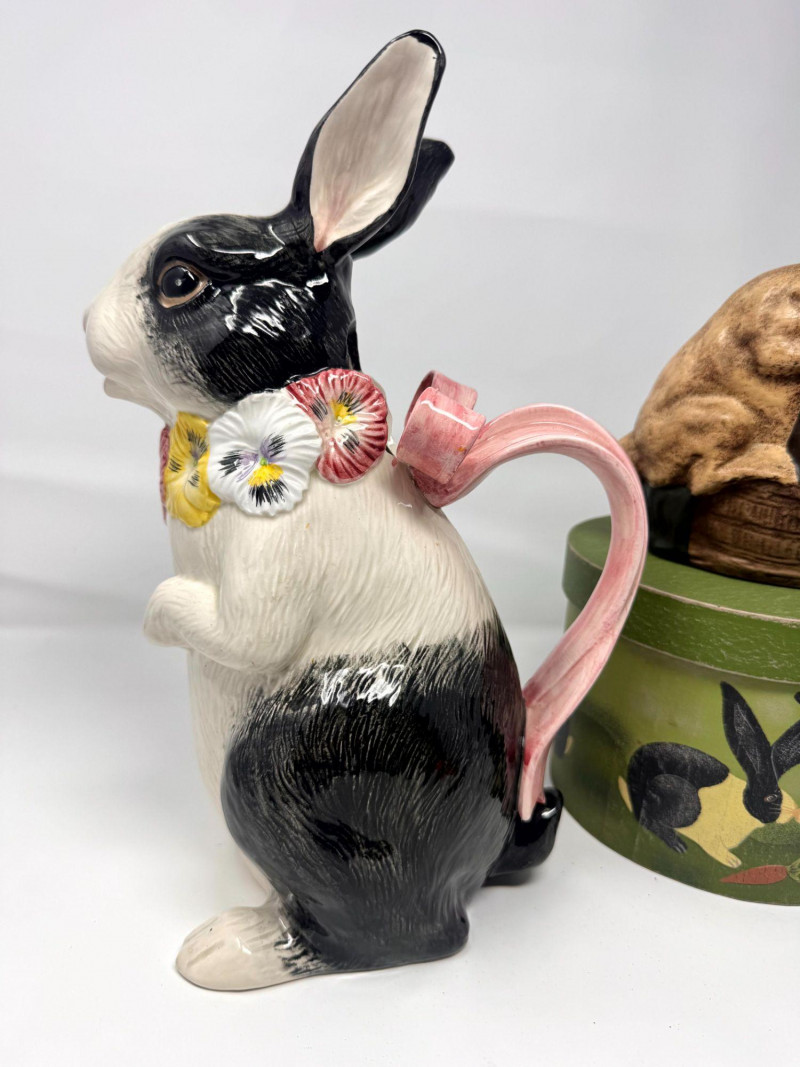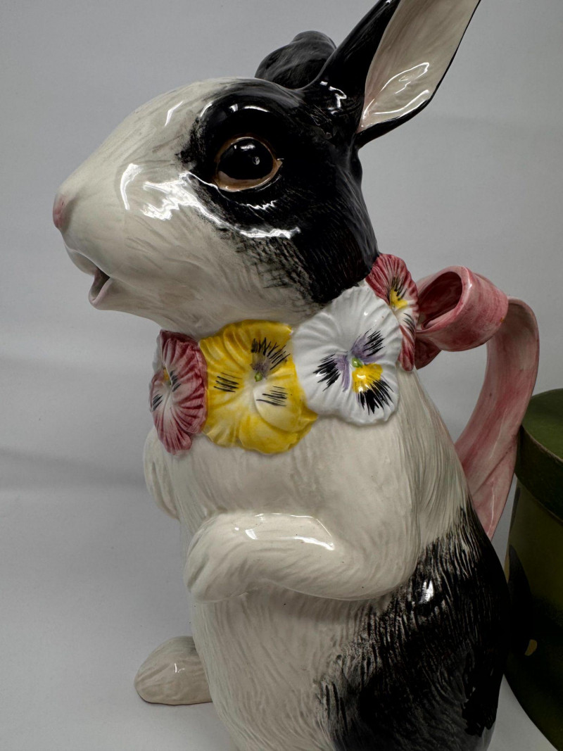 1990 Fitz & Floyd Pansy Bunny Pitcher, Rabbit Box & Bunny Figurine.