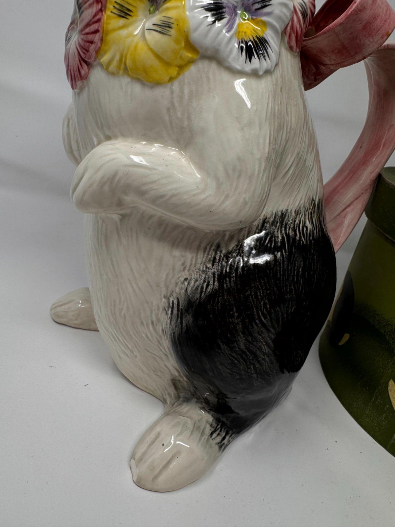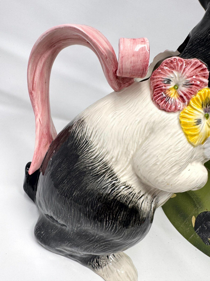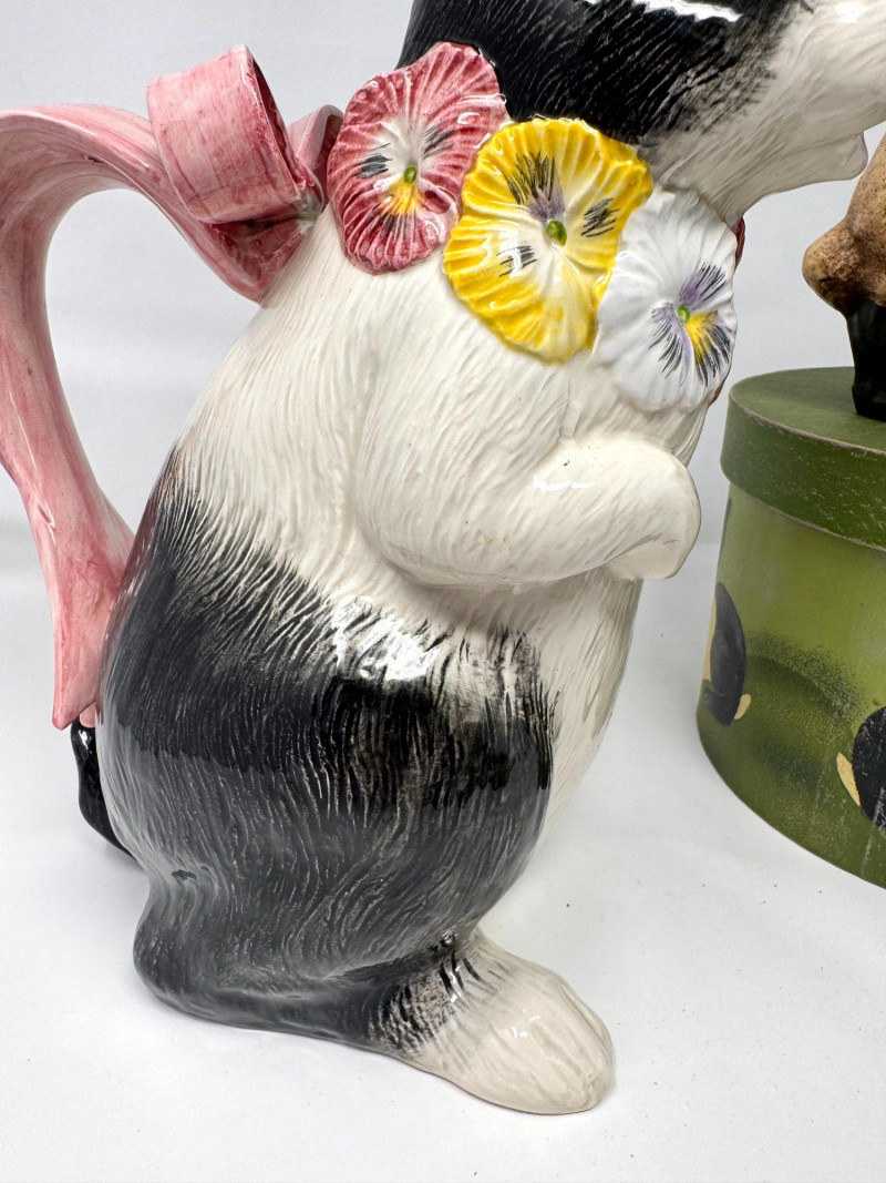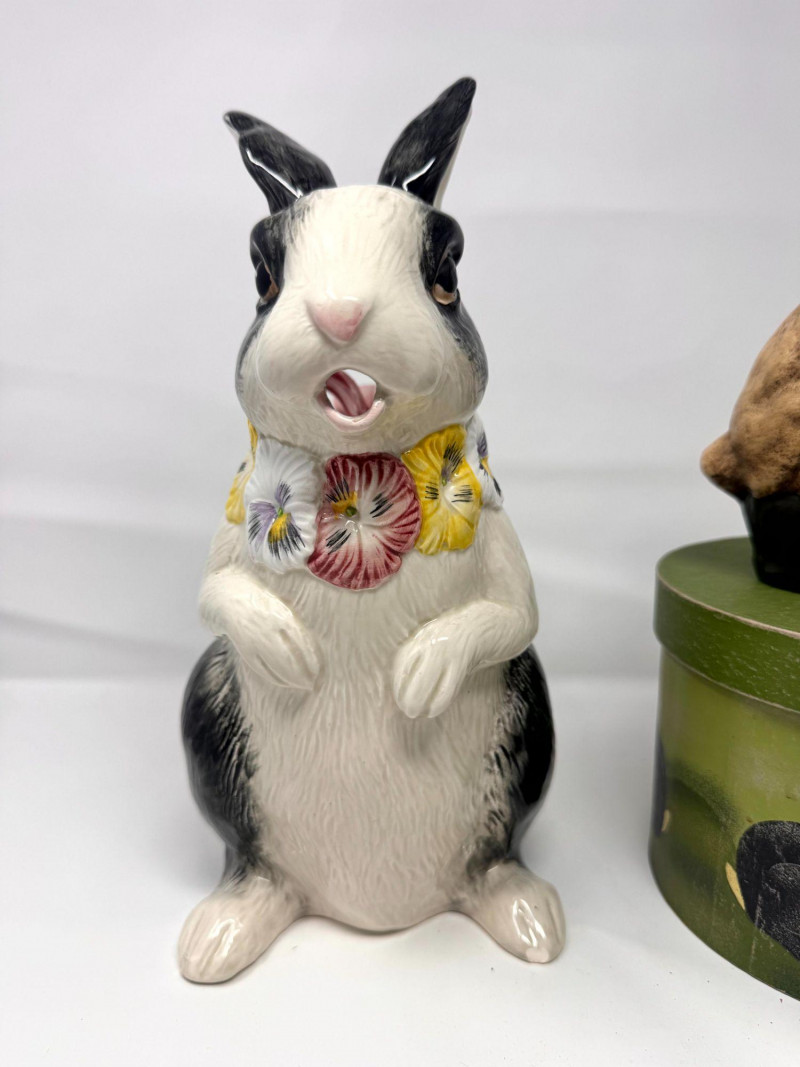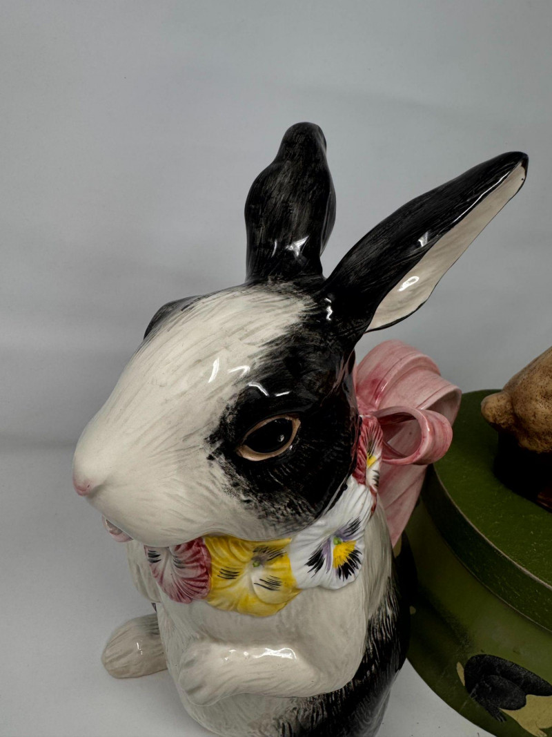 1990 Fitz & Floyd Pansy Bunny Pitcher, Rabbit Box & Bunny Figurine.