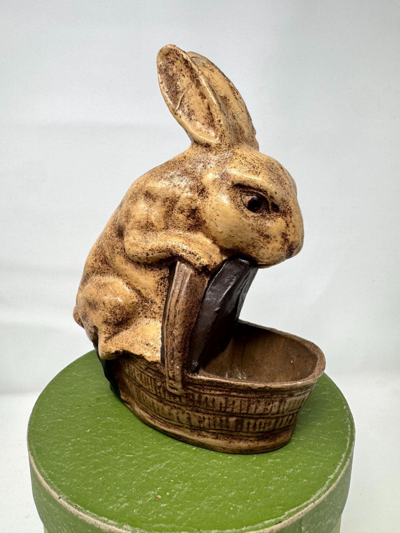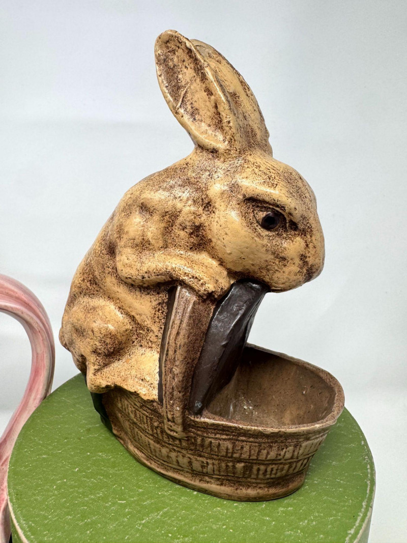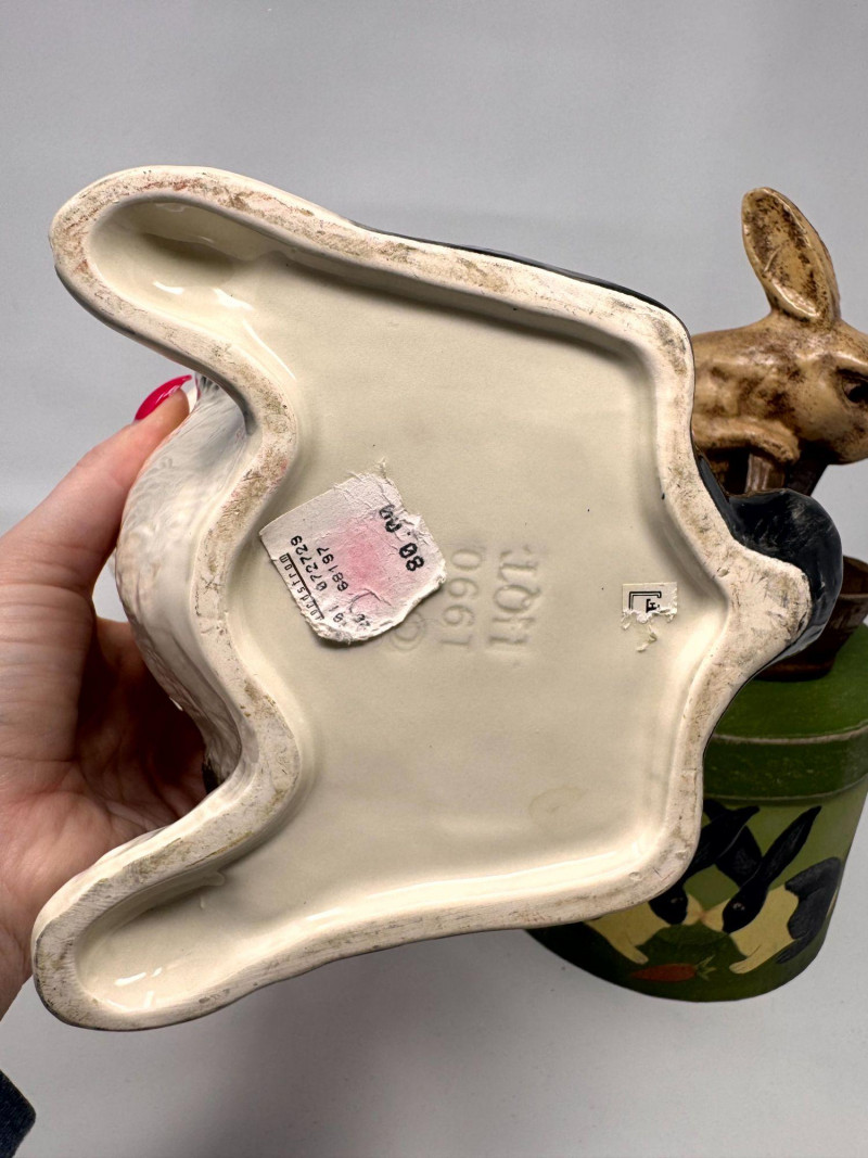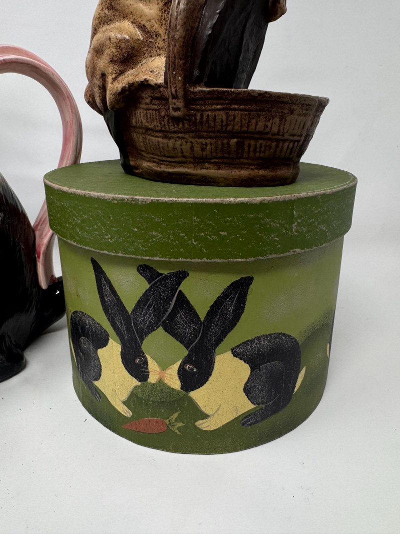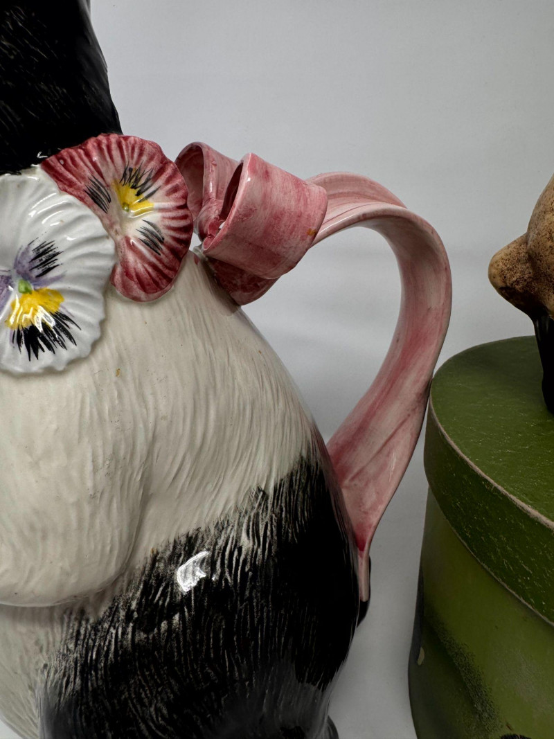1990 Fitz & Floyd Pansy Bunny Pitcher, Rabbit Box & Bunny Figurine.