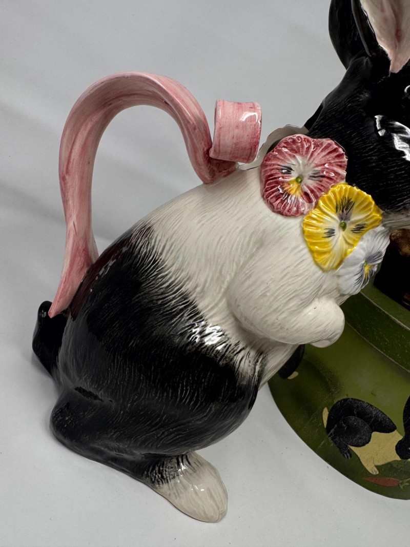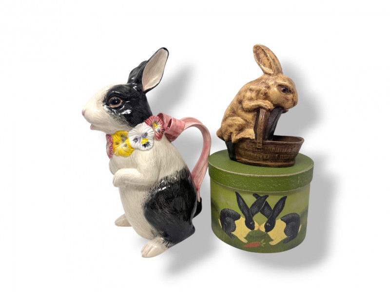 Lot # 22 - 1990 Fitz & Floyd Pansy Bunny Pitcher, Rabbit Box & Bunny Figurine