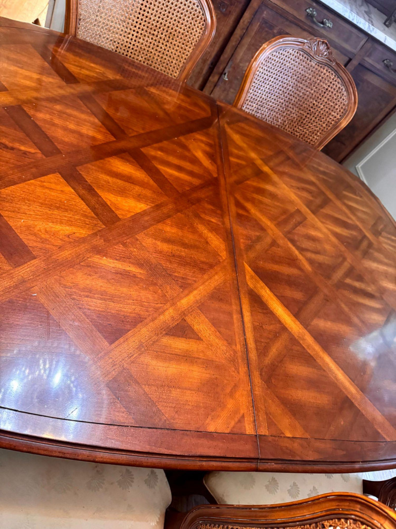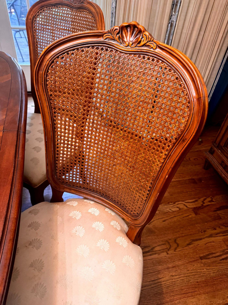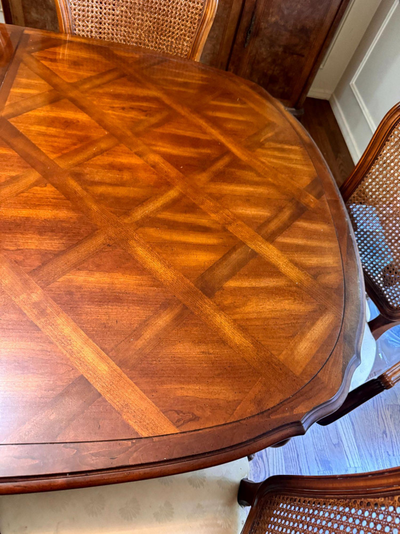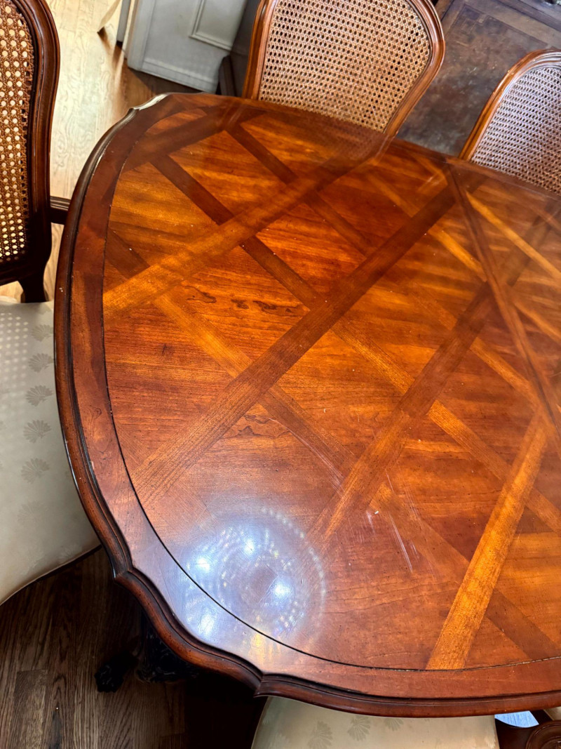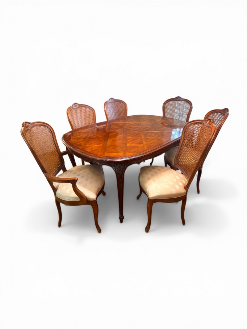 French Style Dining Table w/ 6 Cane Back Chairs By Century Furniture.