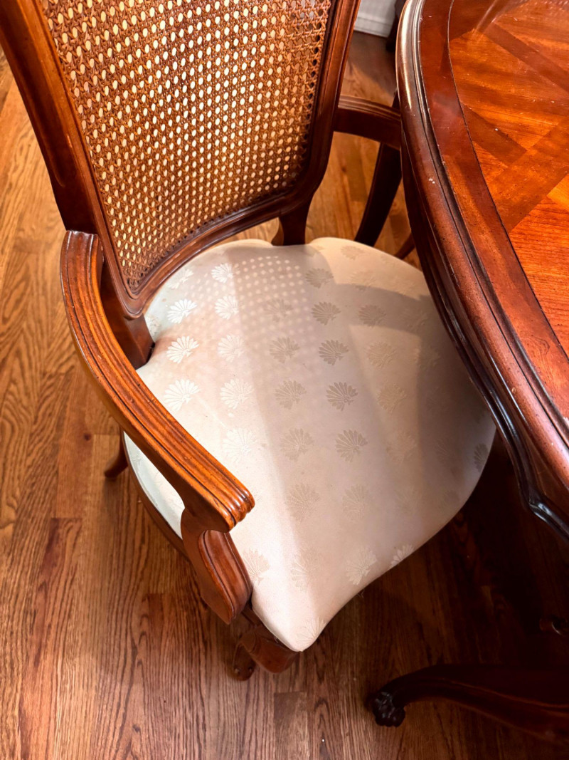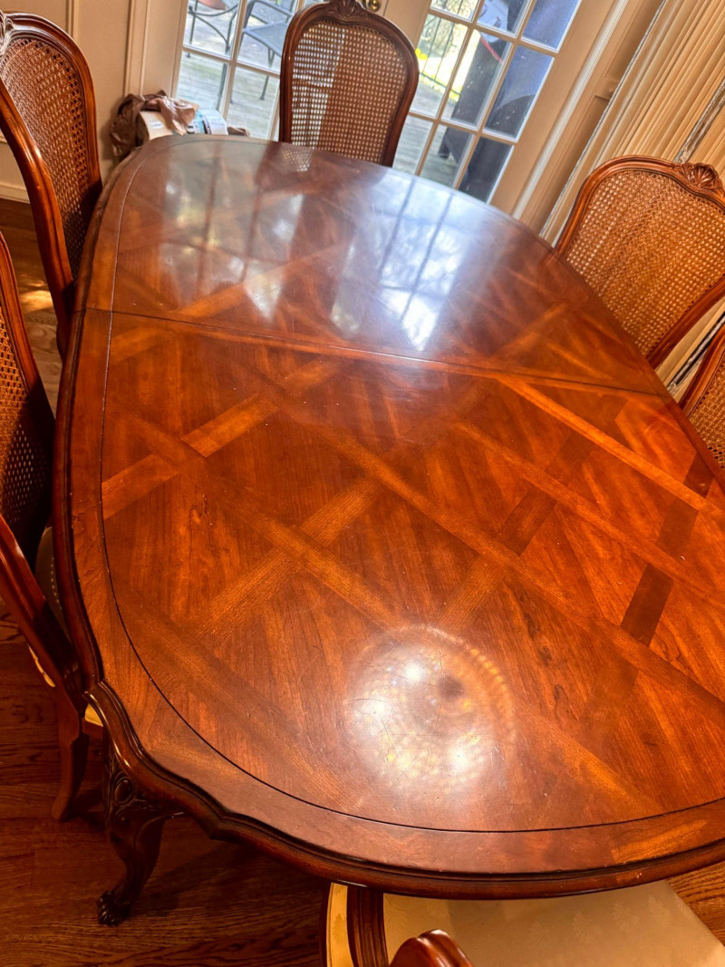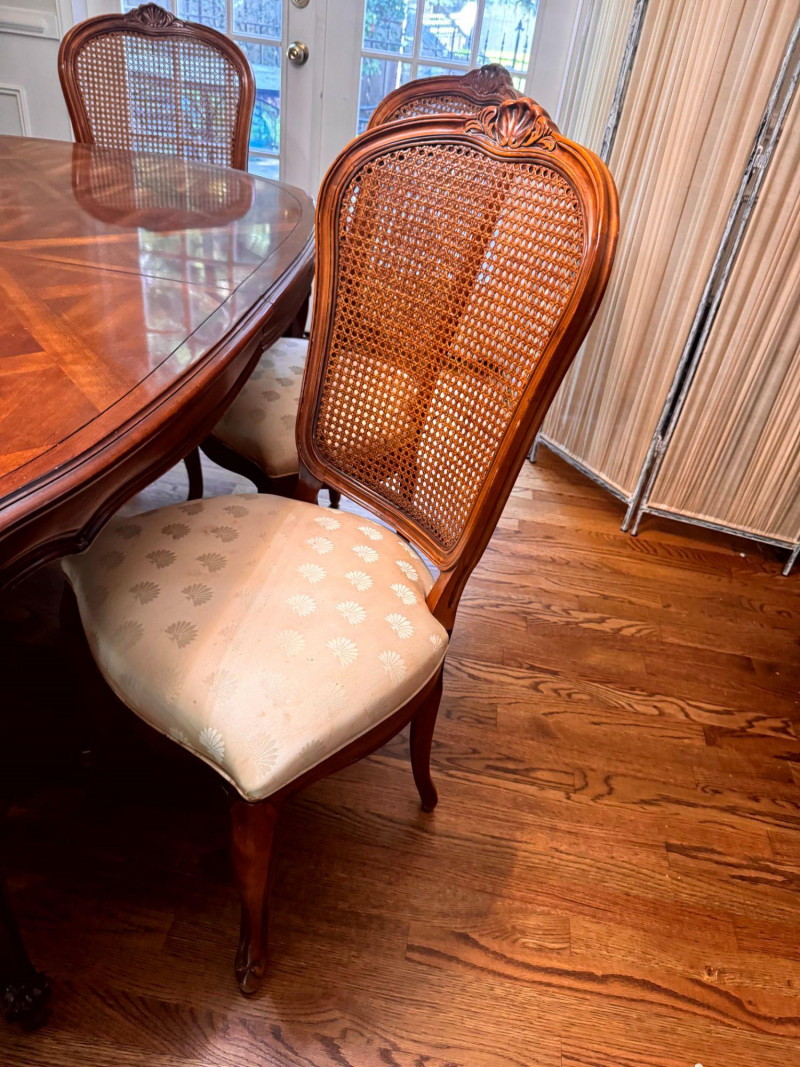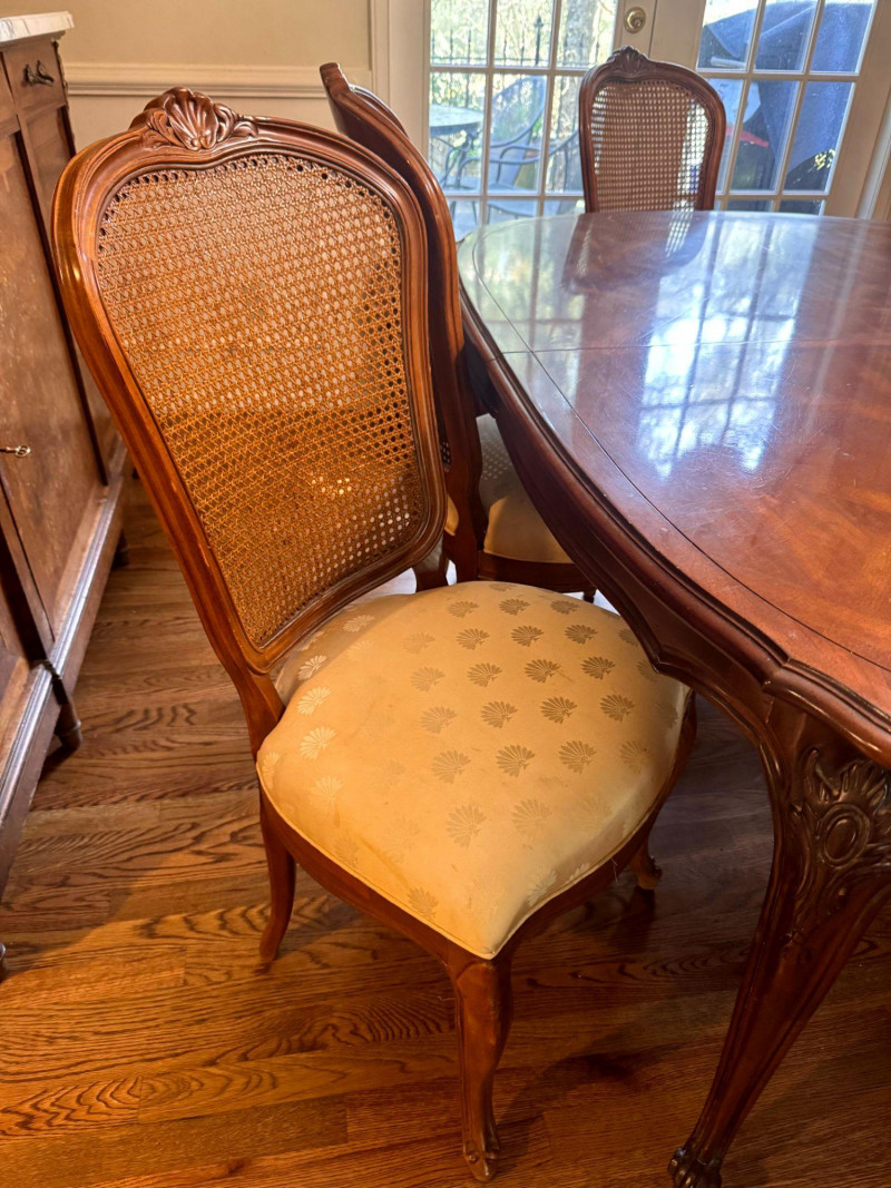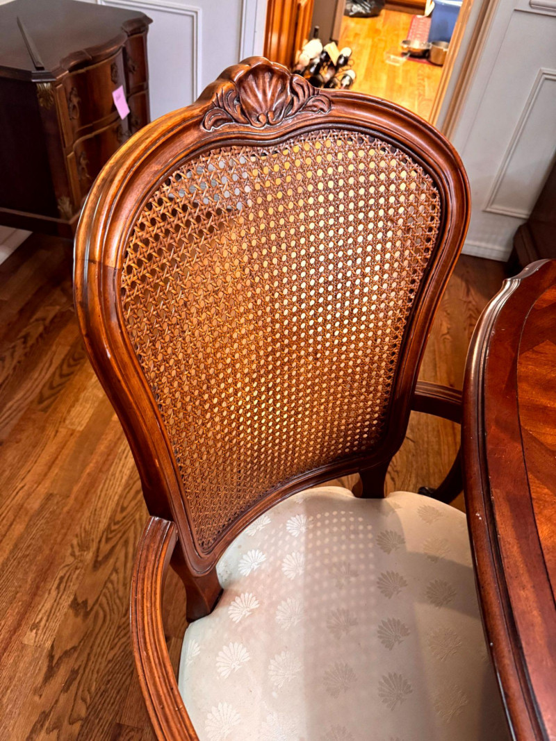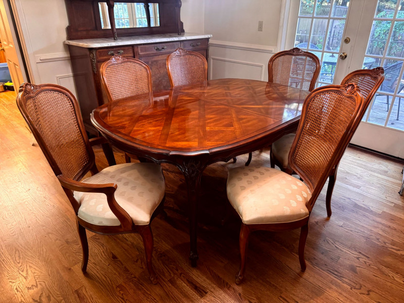 French Style Dining Table w/ 6 Cane Back Chairs By Century Furniture.