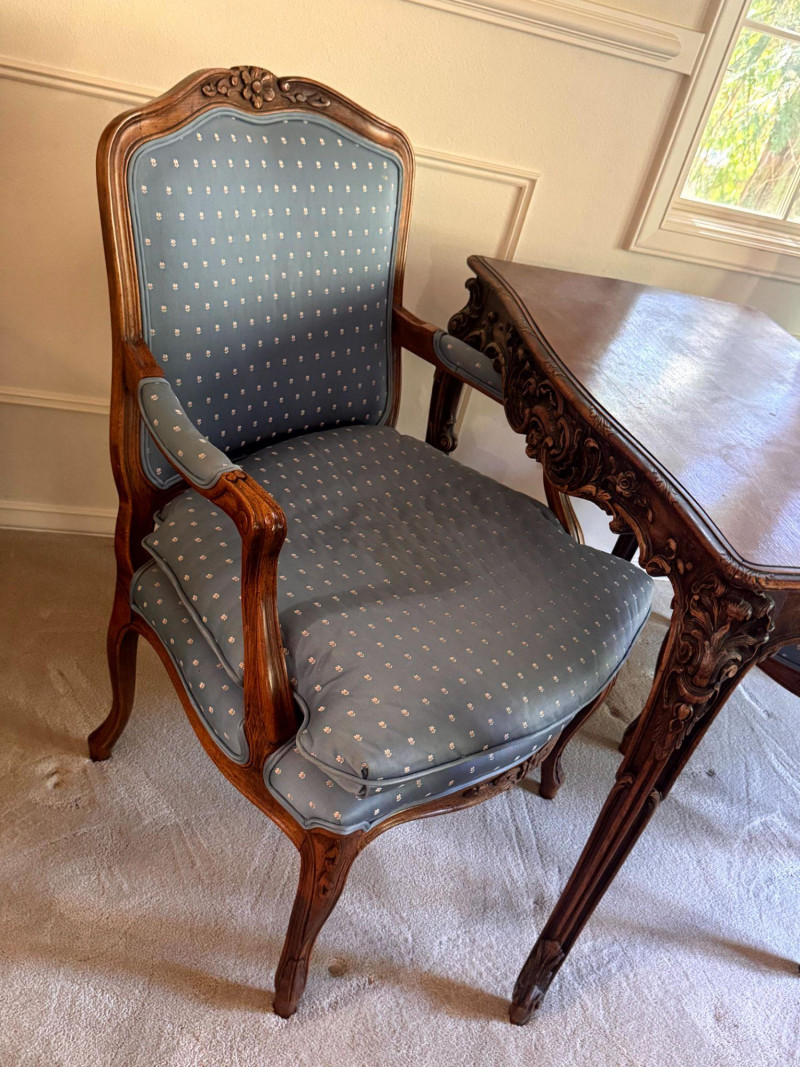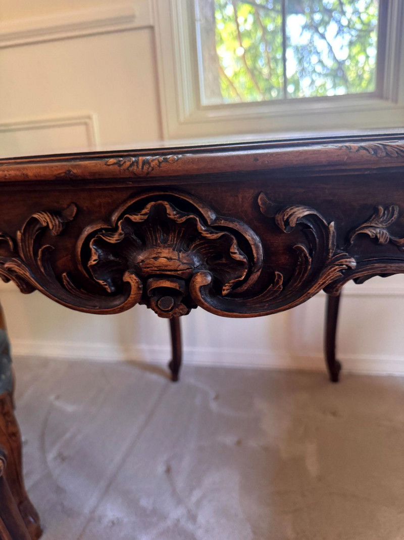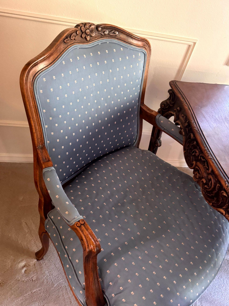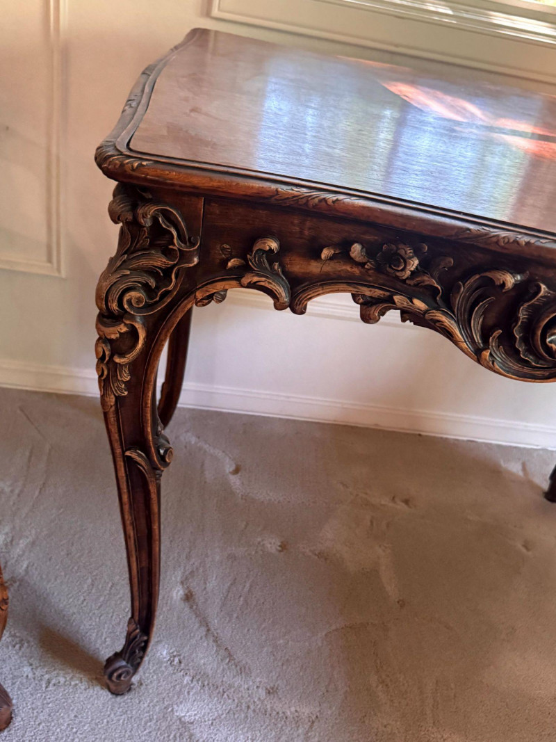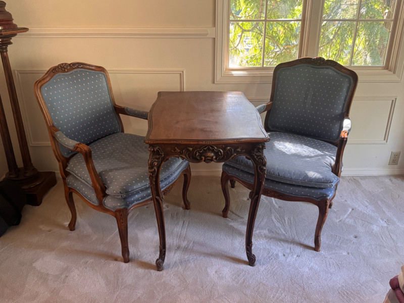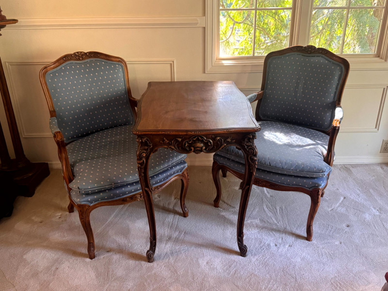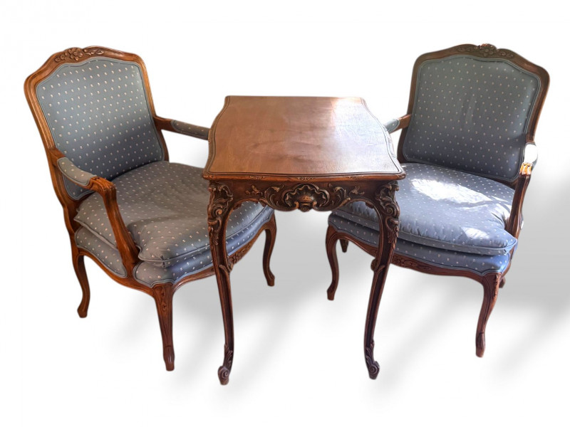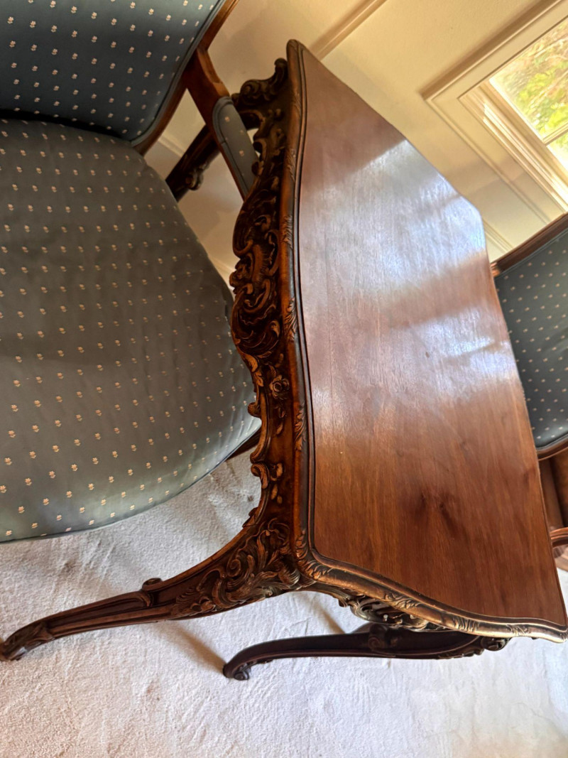 Lot # 30 - Antique Carved Side Table w/ 2 Antique French Louis Style Armchairs