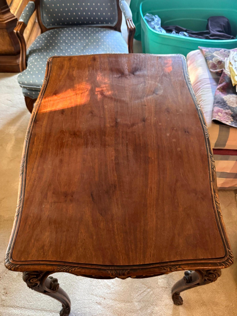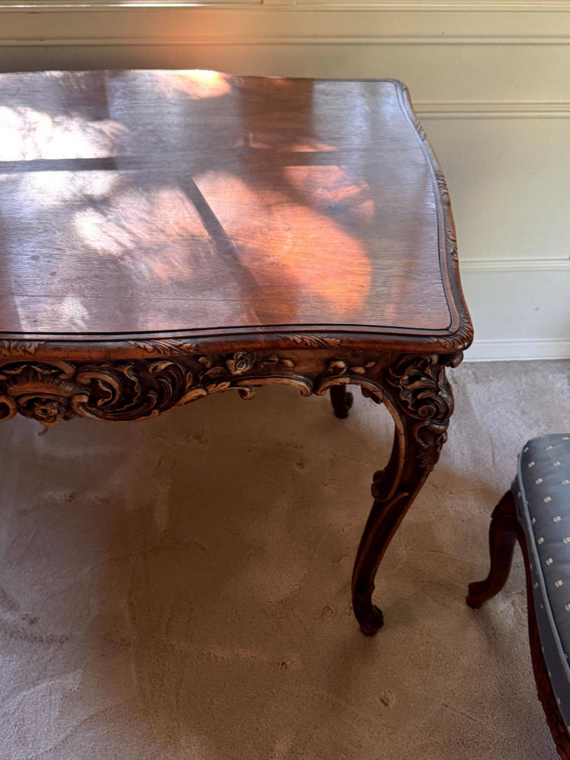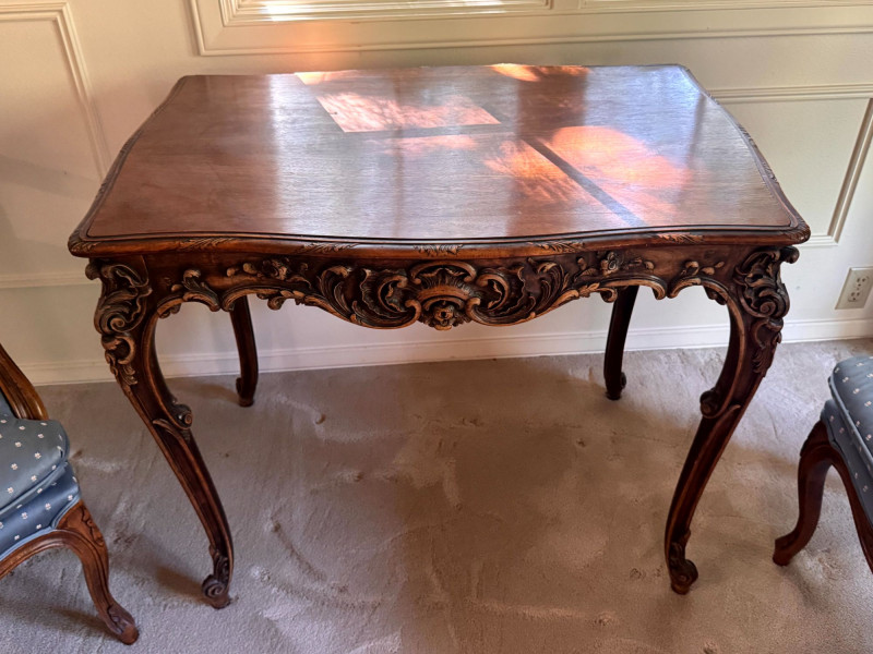 Antique Carved Side Table w/ 2 Antique French Louis Style Armchairs. Measurements: