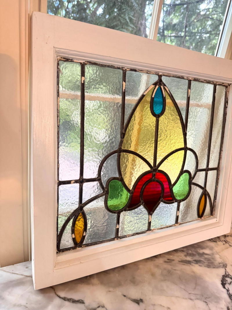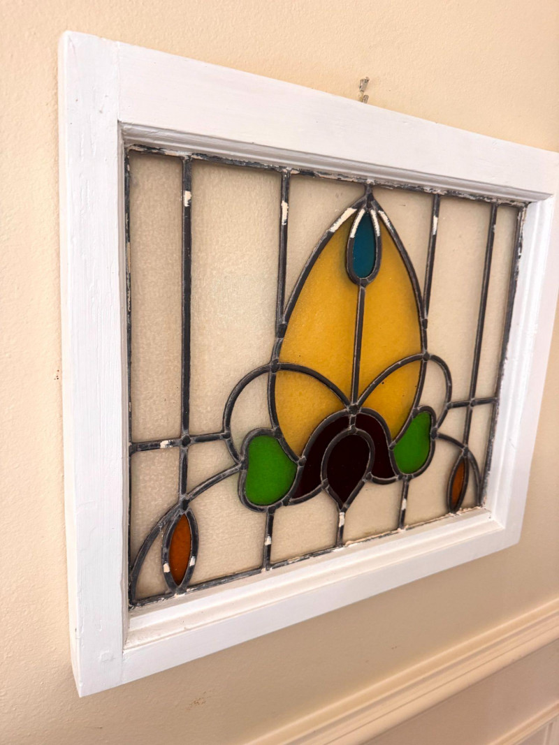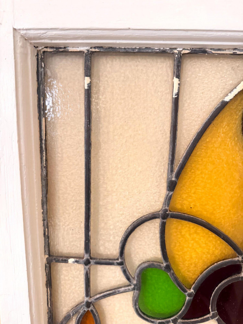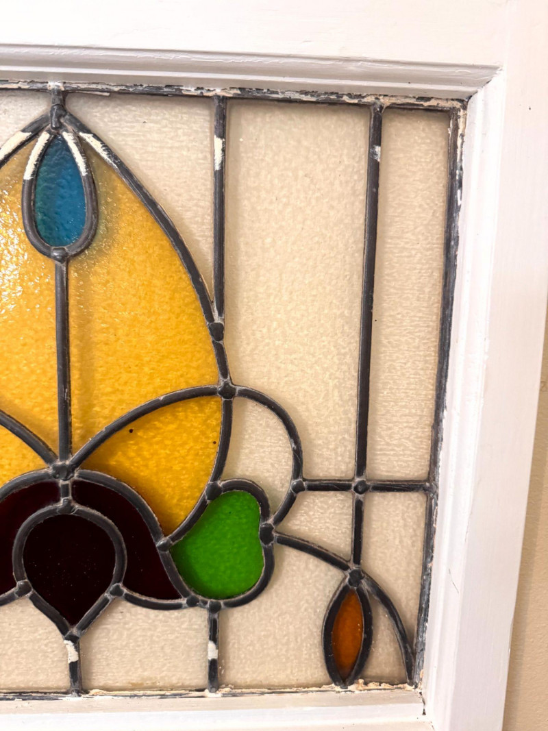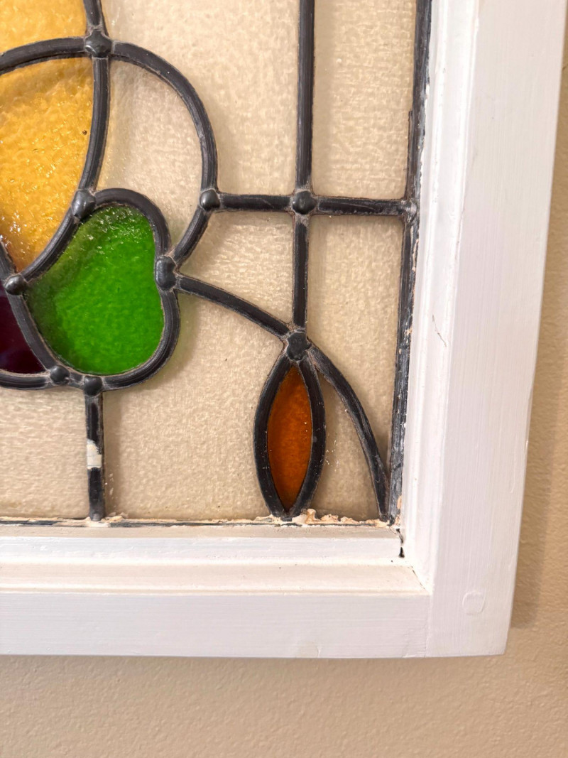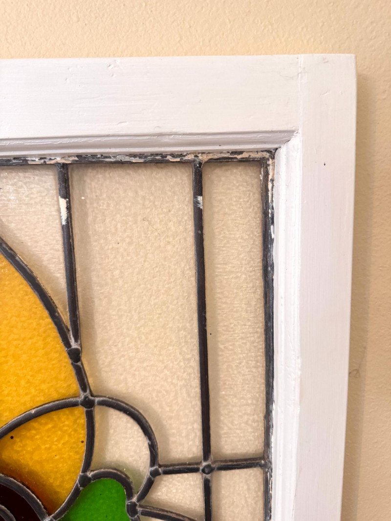Lot # 31 - Stained Glass Window Panel w/ Floral Design in White Wood Frame