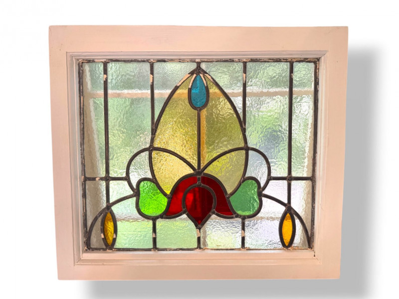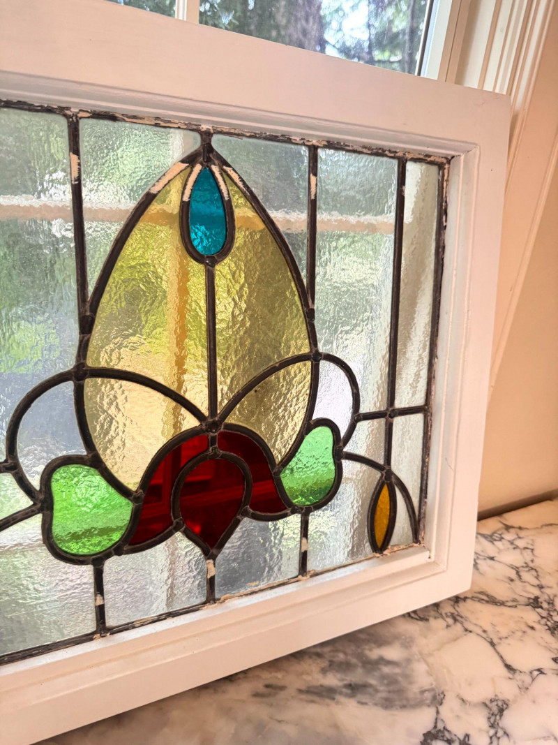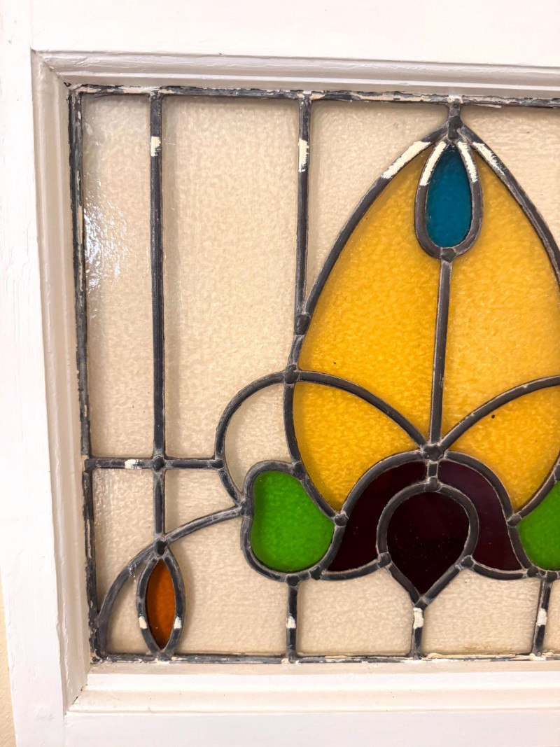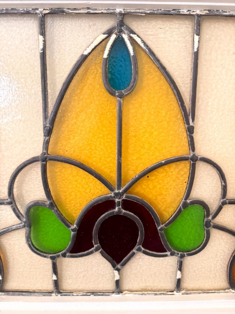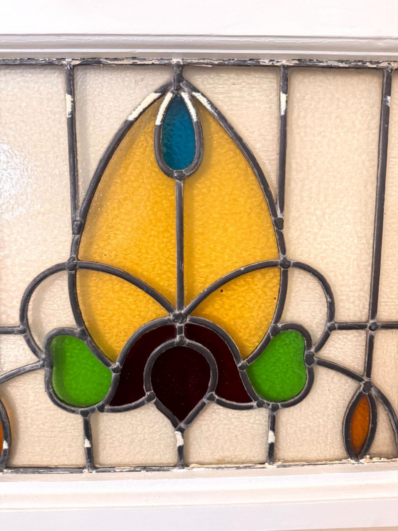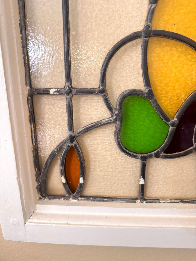 Lot # 31 - Stained Glass Window Panel w/ Floral Design in White Wood Frame