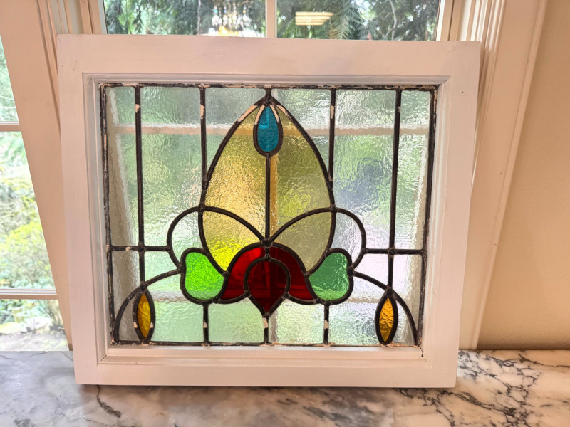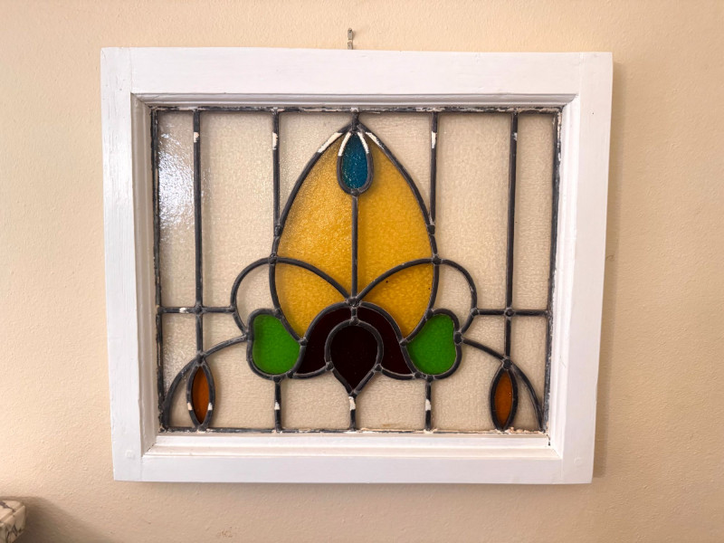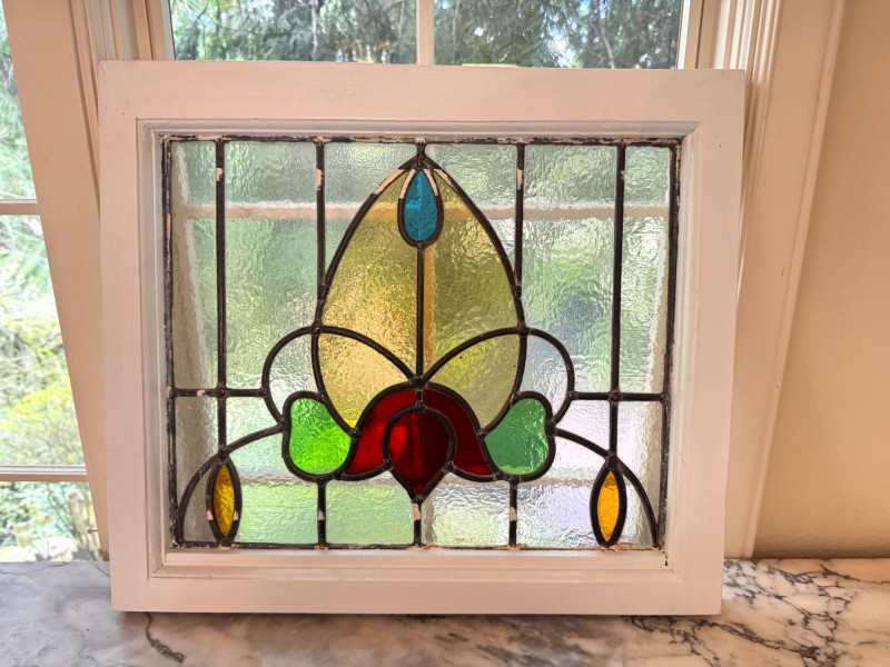 Stained Glass Window Panel w/ Floral Design in White Wood Frame.