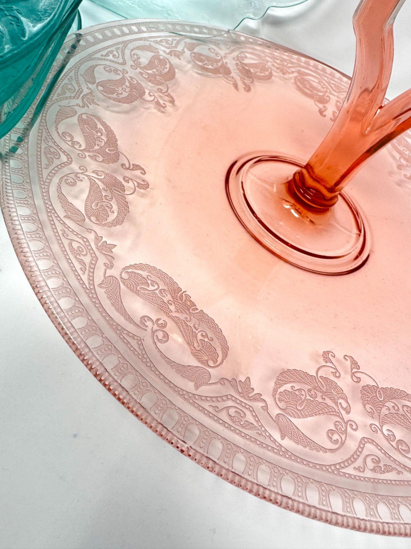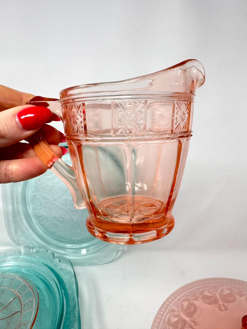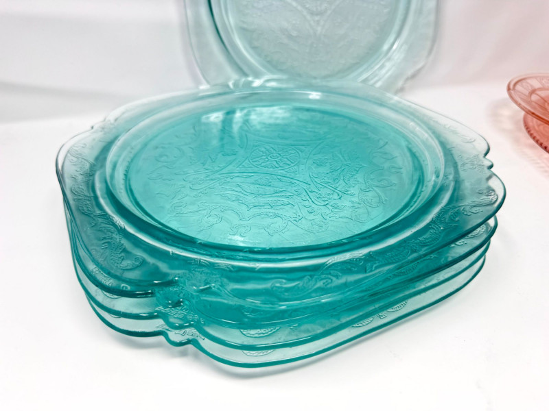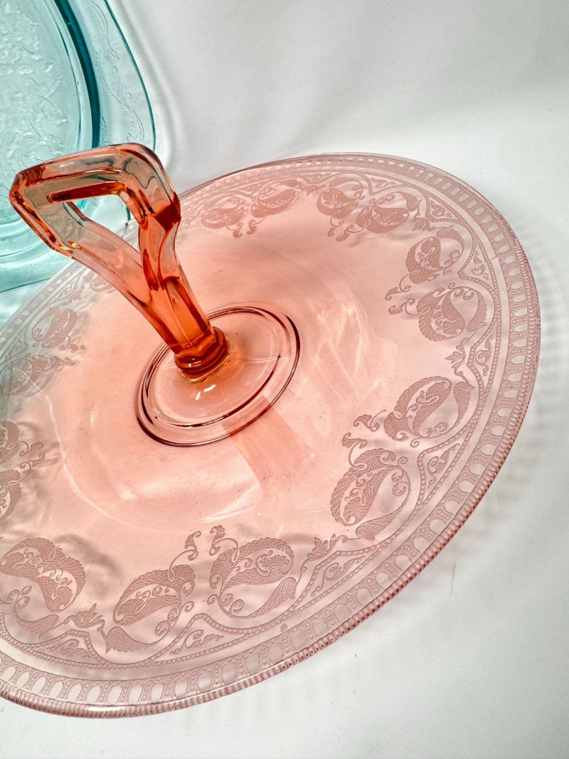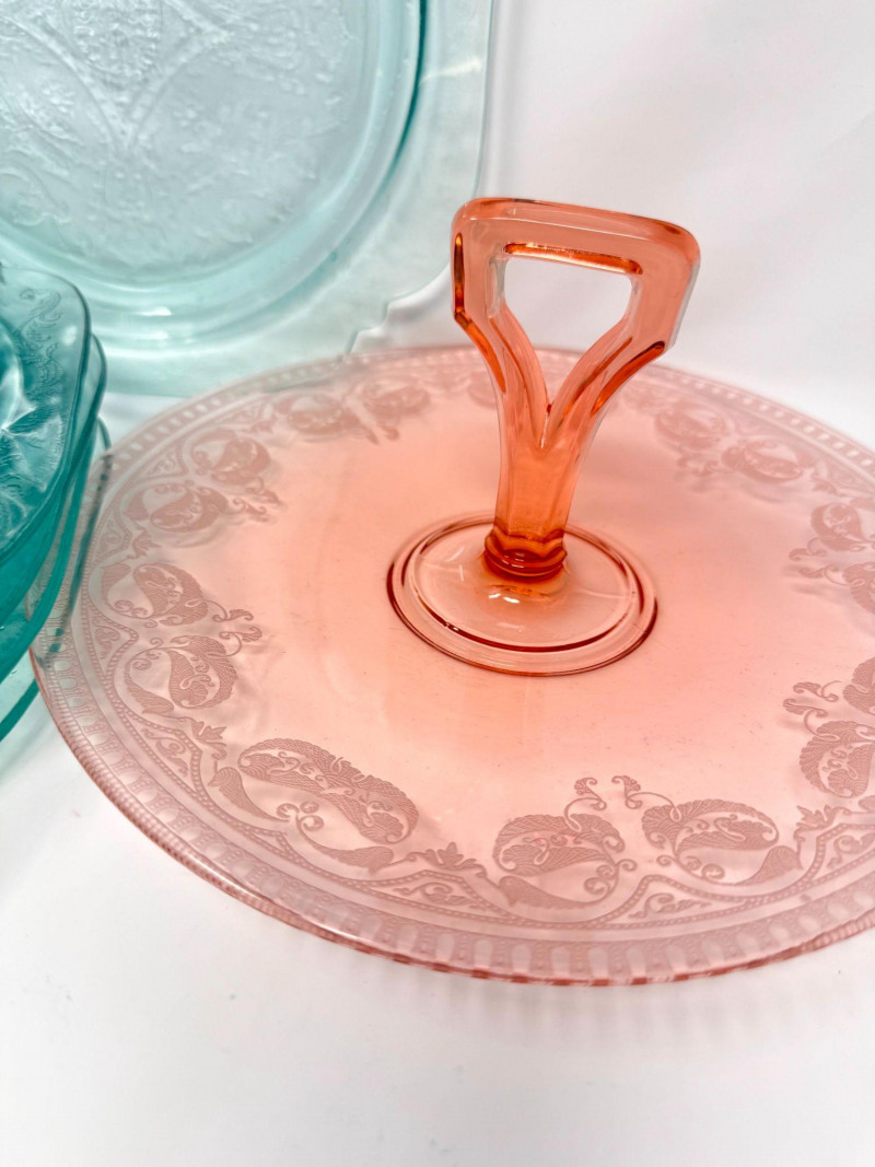 Pink & Teal Depression Glass Serving Set w/ Plates & Mini Pitcher.
