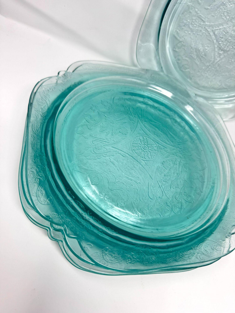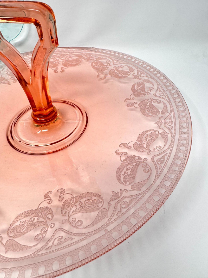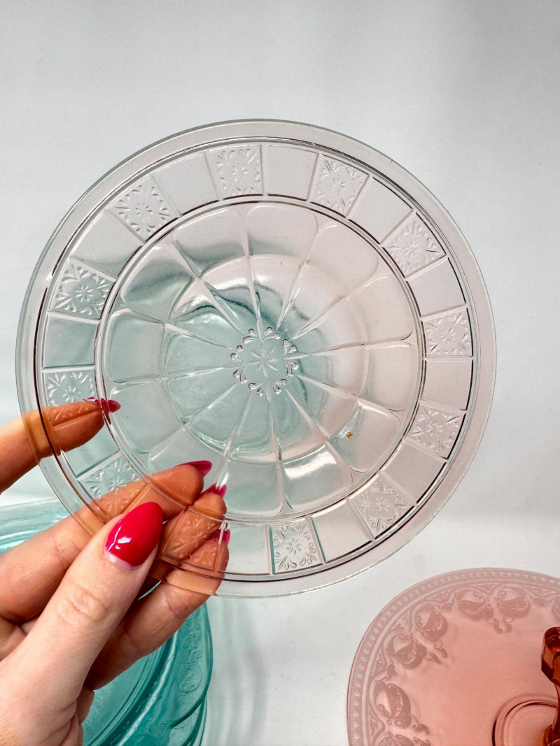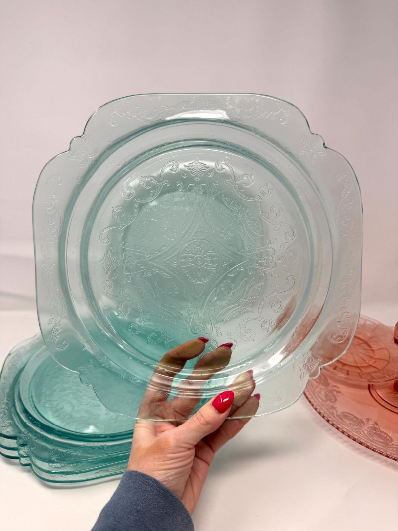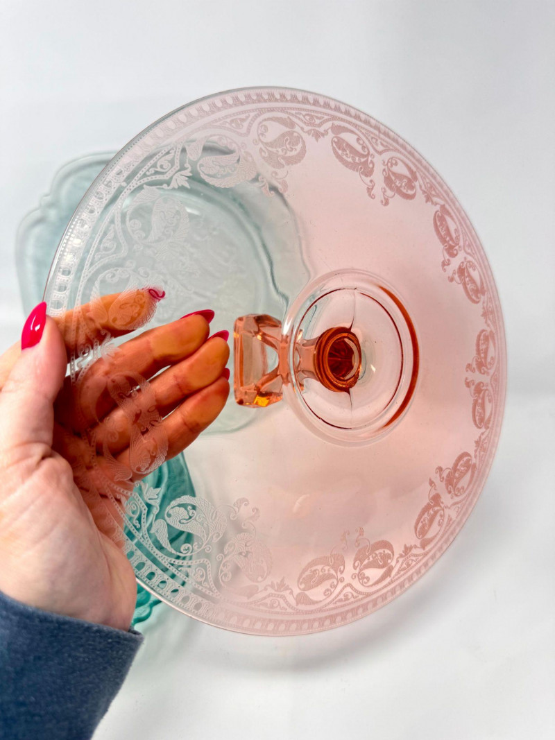 Pink & Teal Depression Glass Serving Set w/ Plates & Mini Pitcher.