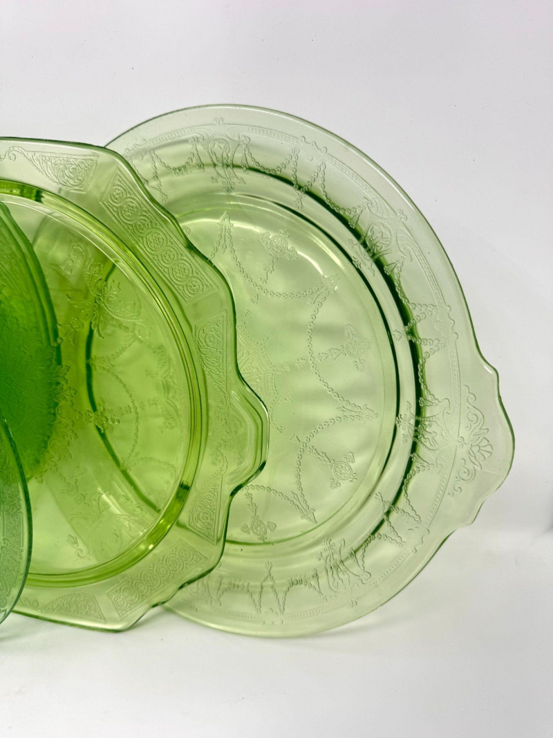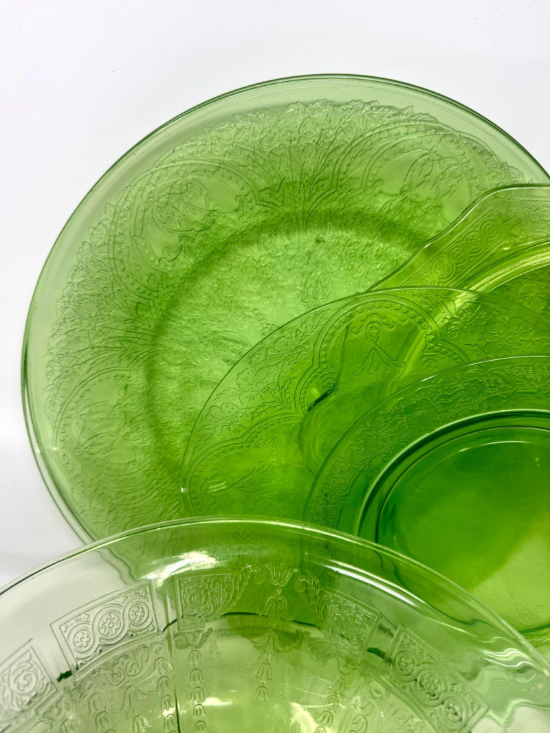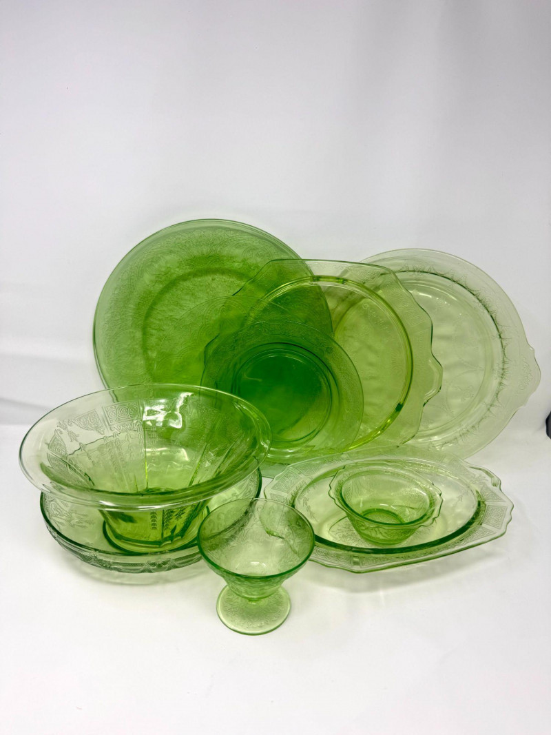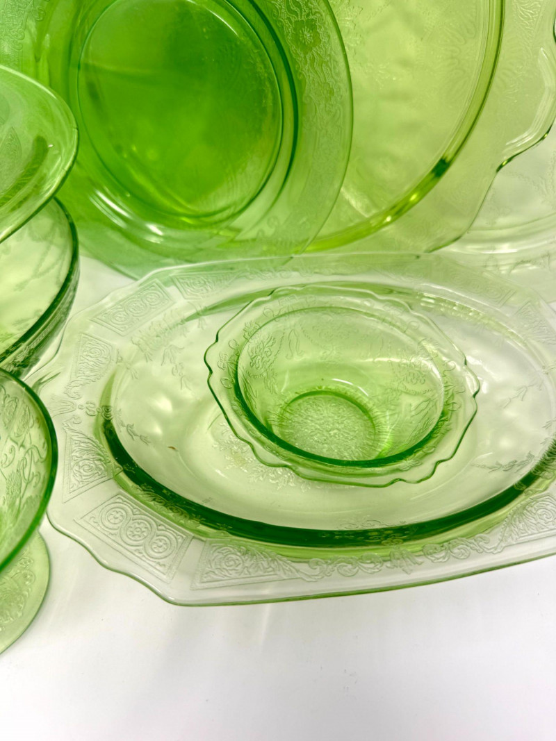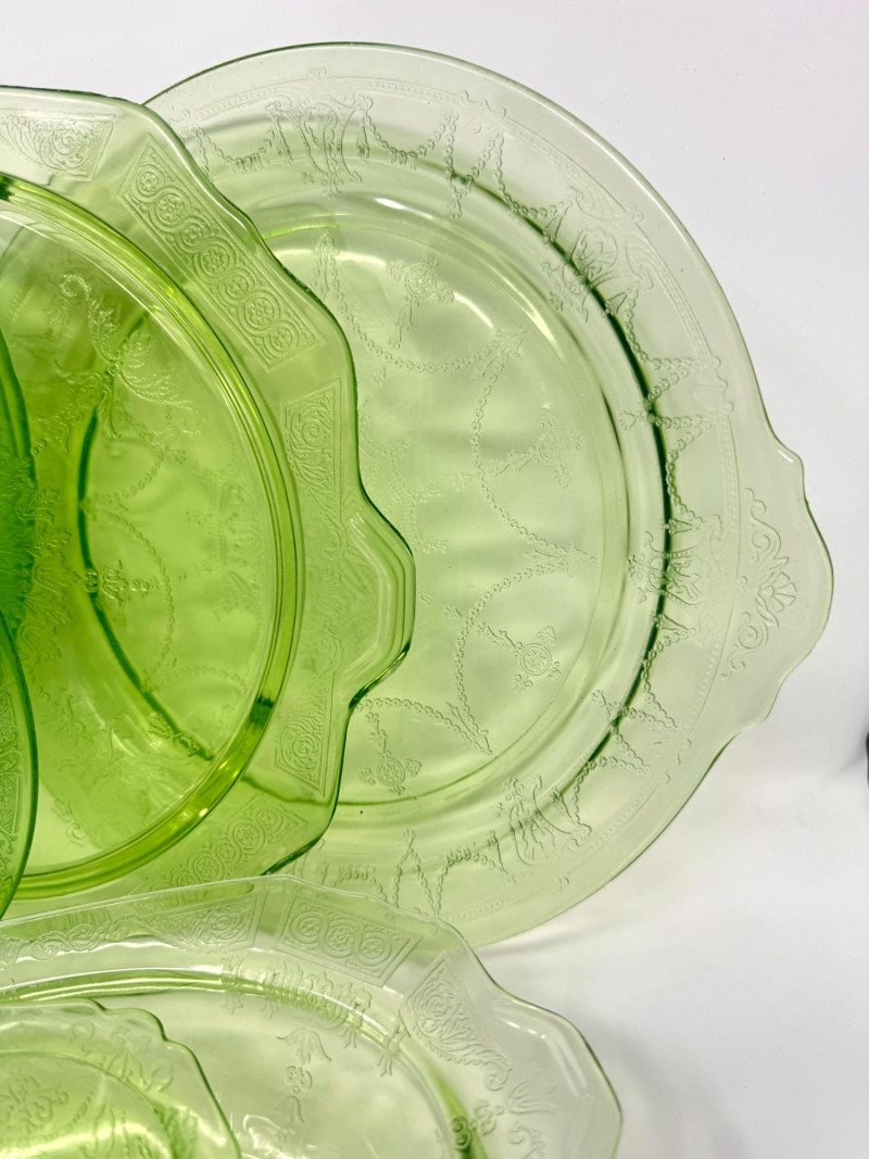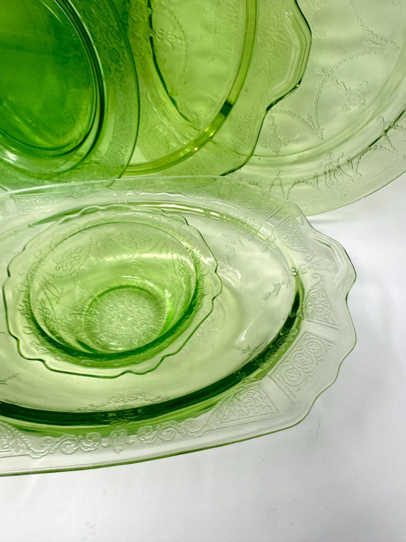 Lot # 37 - Vintage Green Depression Glass Serving Set w/ Plates, Bowls & Trays