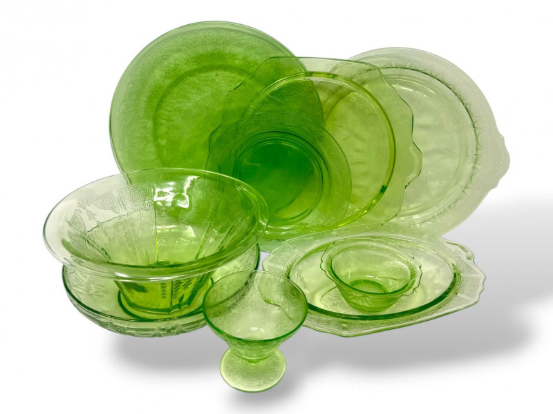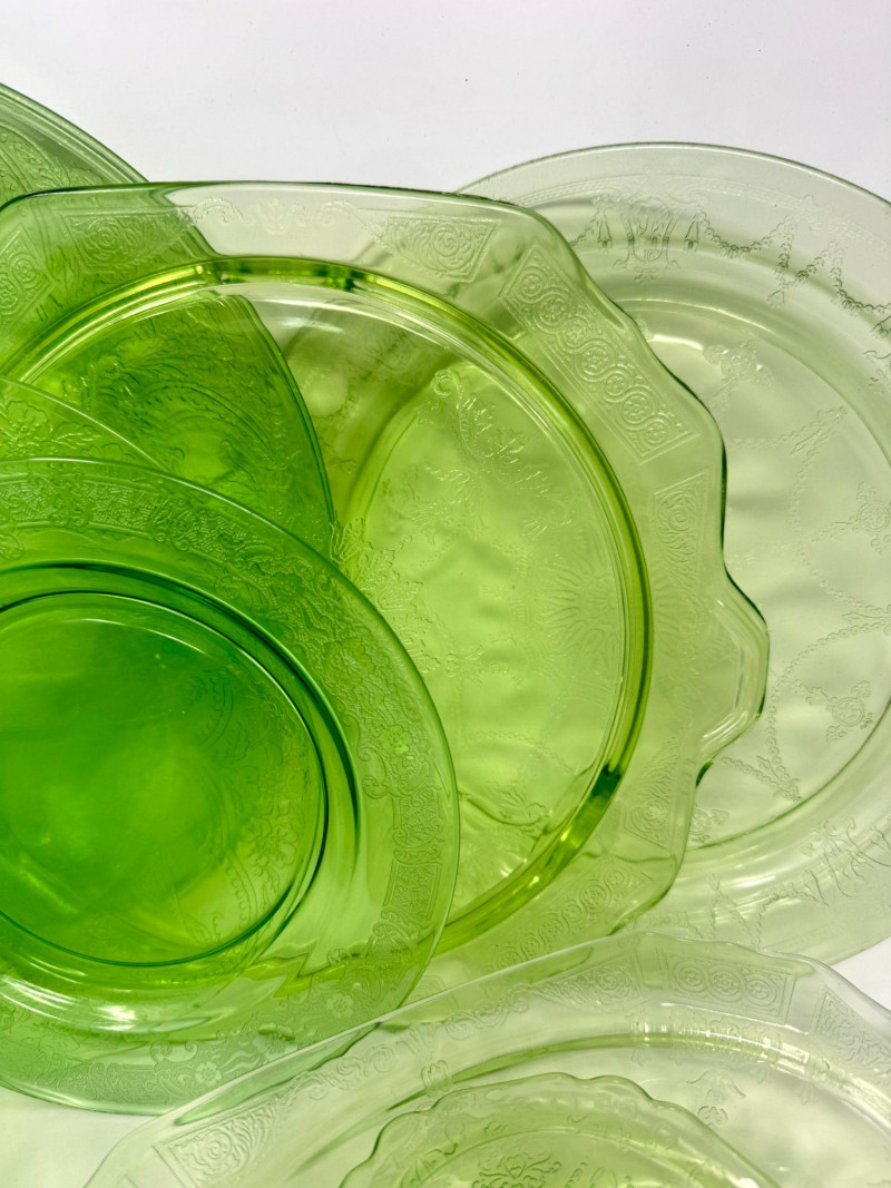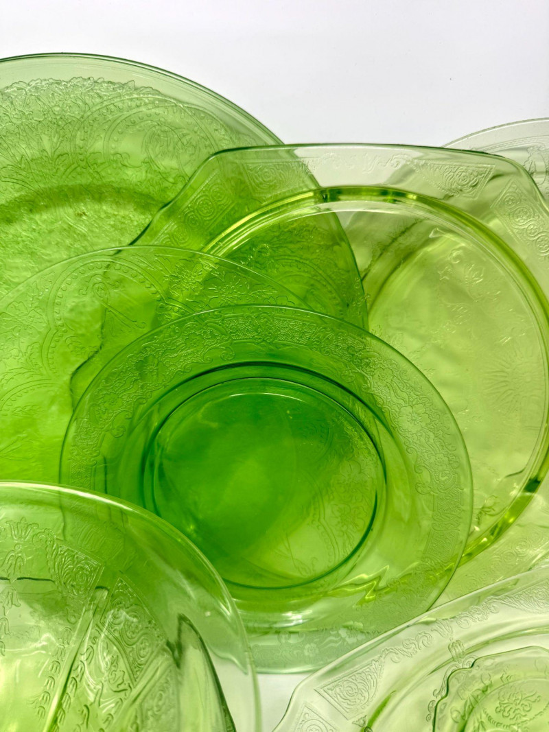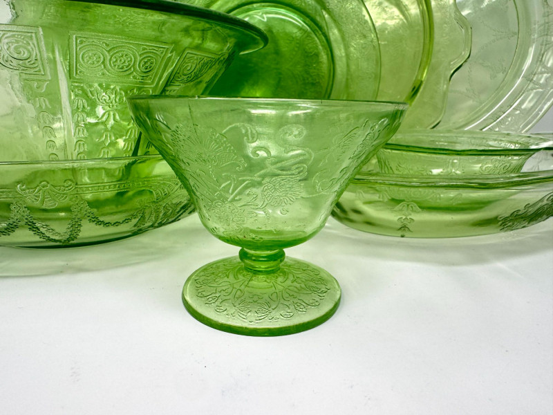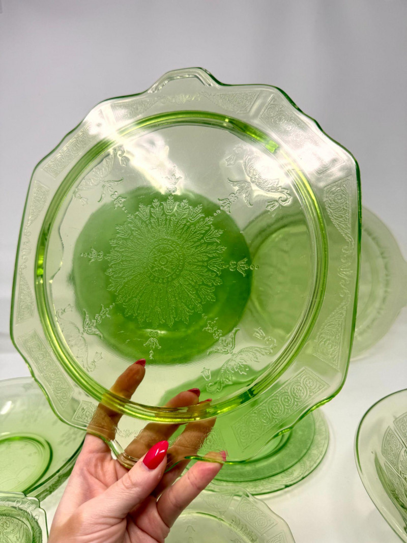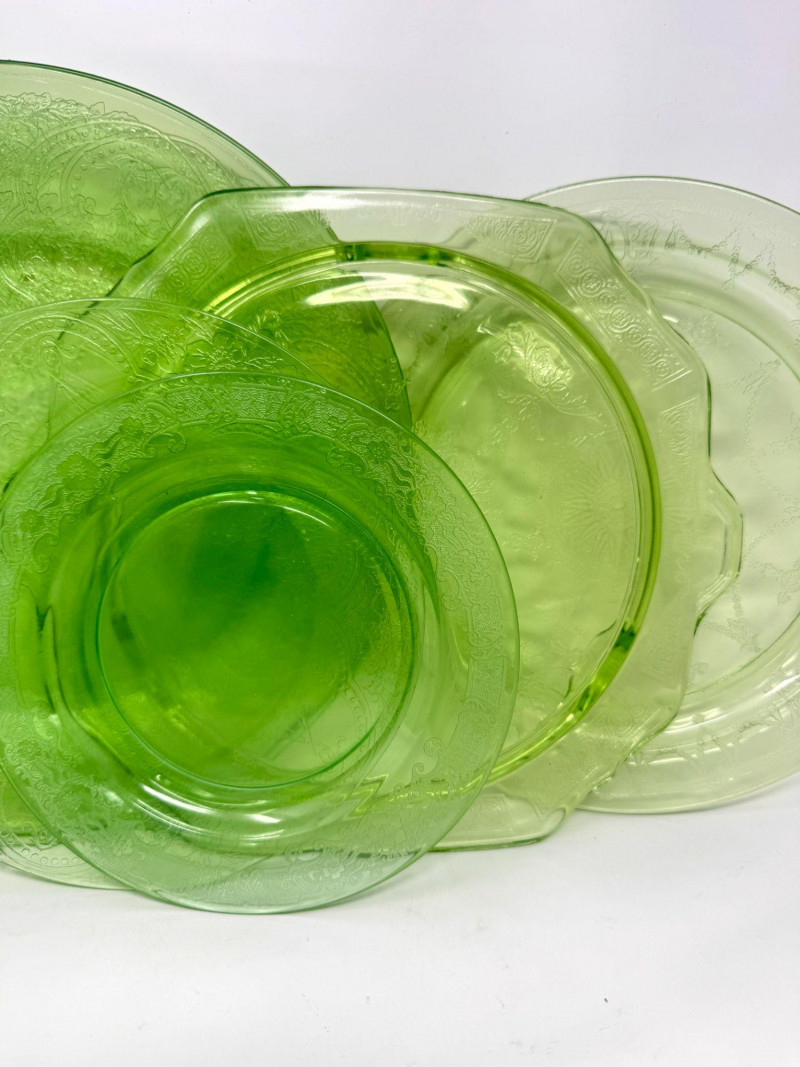 Lot # 37 - Vintage Green Depression Glass Serving Set w/ Plates, Bowls & Trays