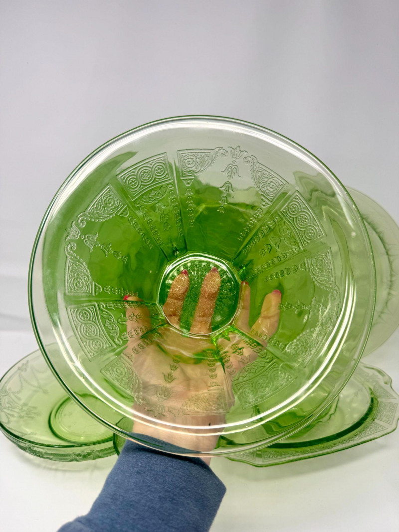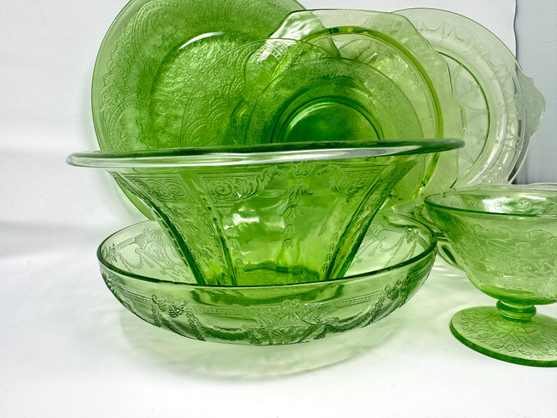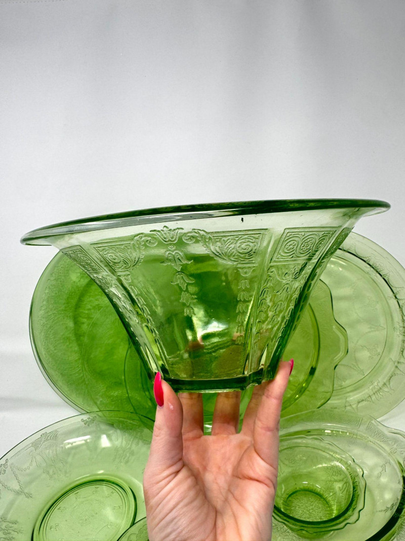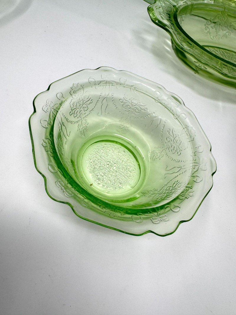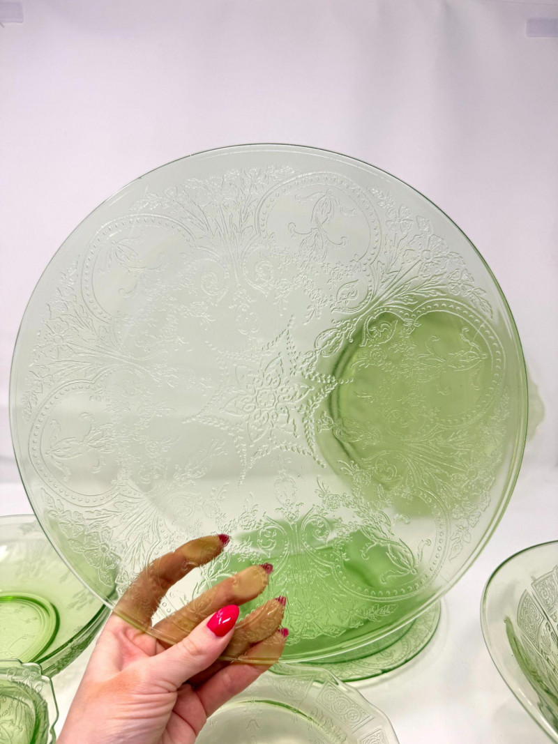Vintage Green Depression Glass Serving Set w/ Plates, Bowls & Trays. Includes: Condition: