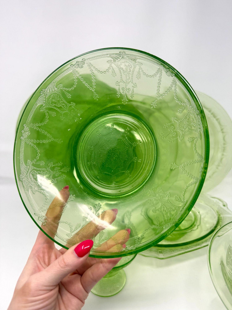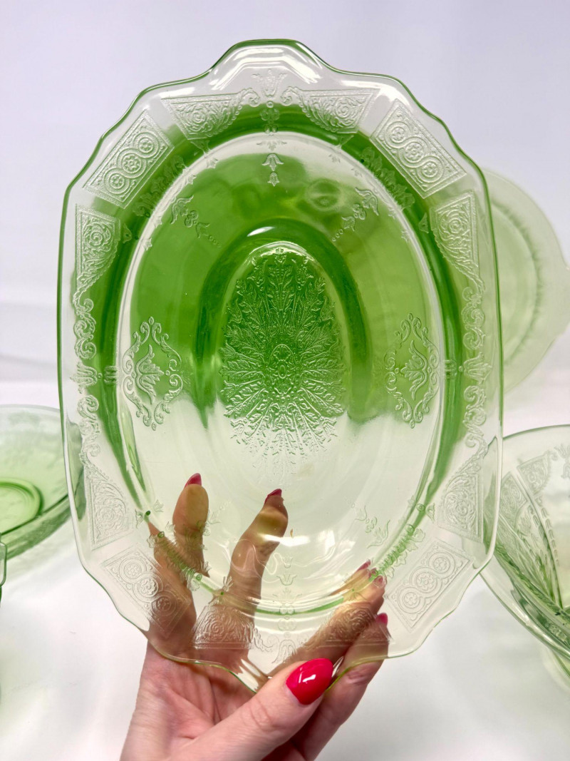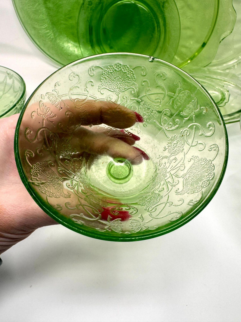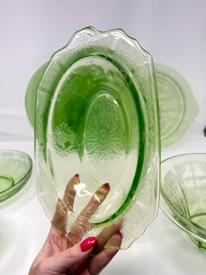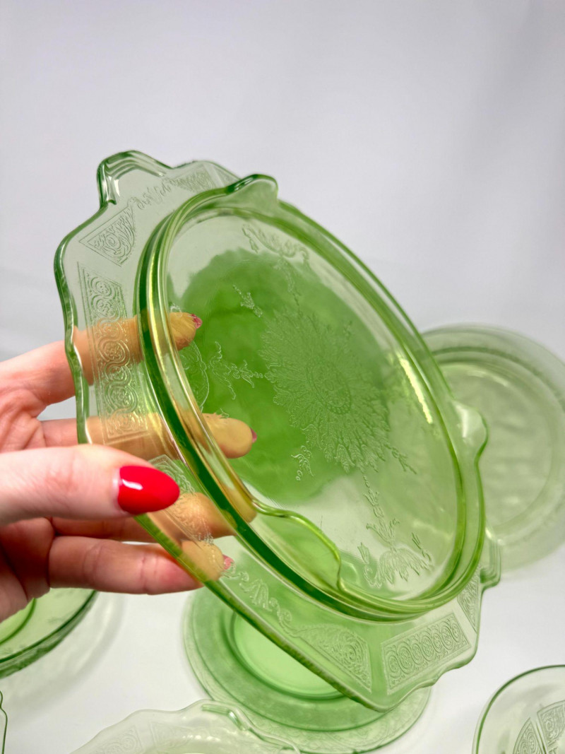 Vintage Green Depression Glass Serving Set w/ Plates, Bowls & Trays. Includes: Condition: