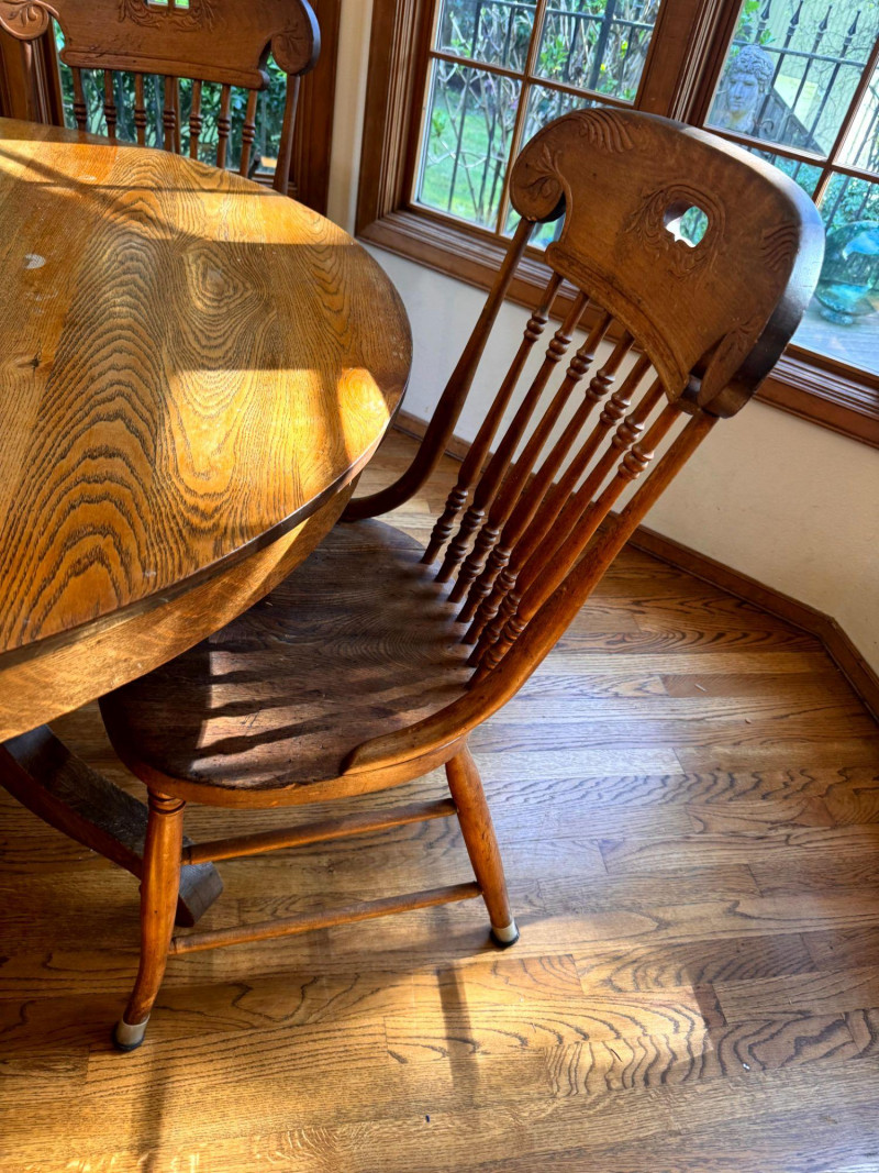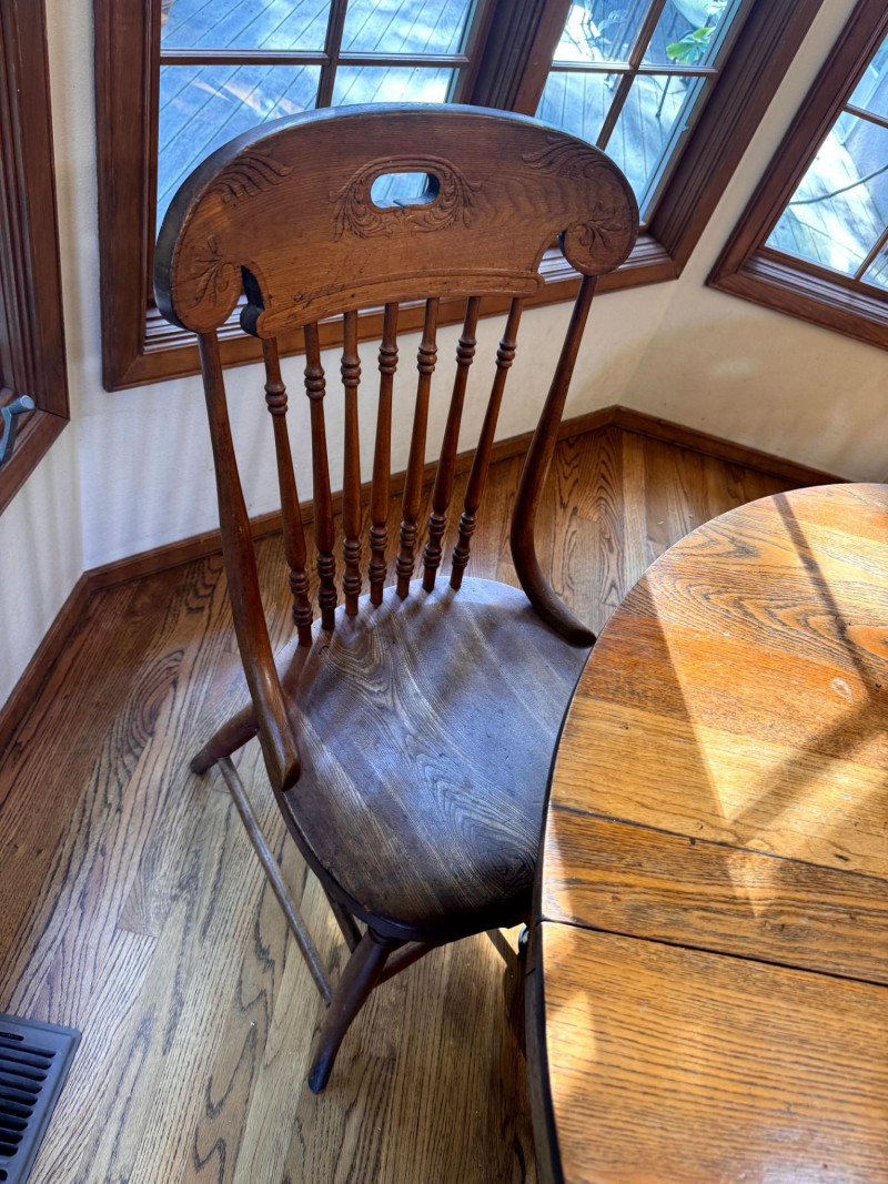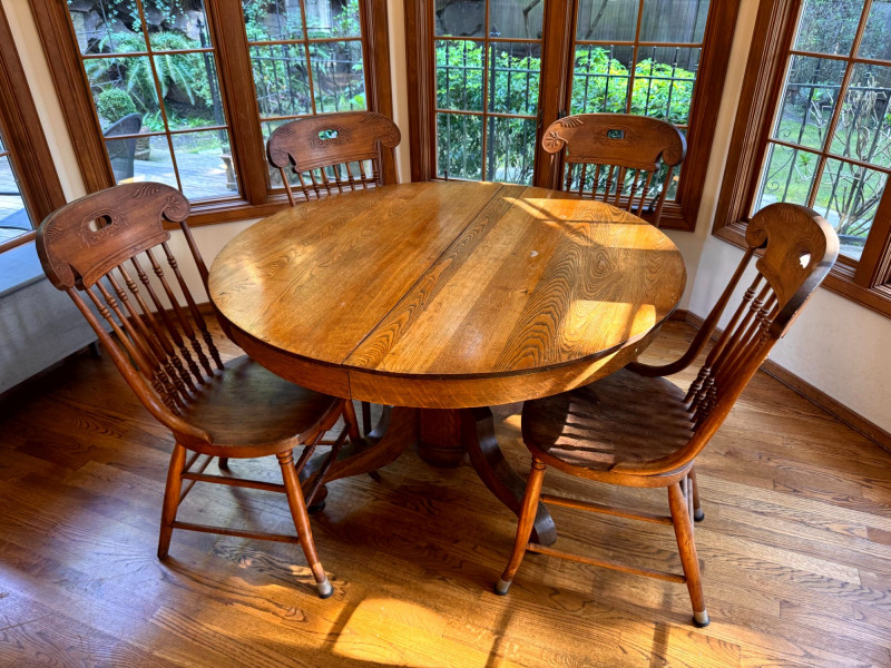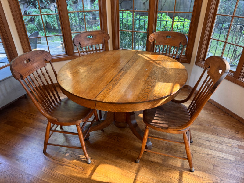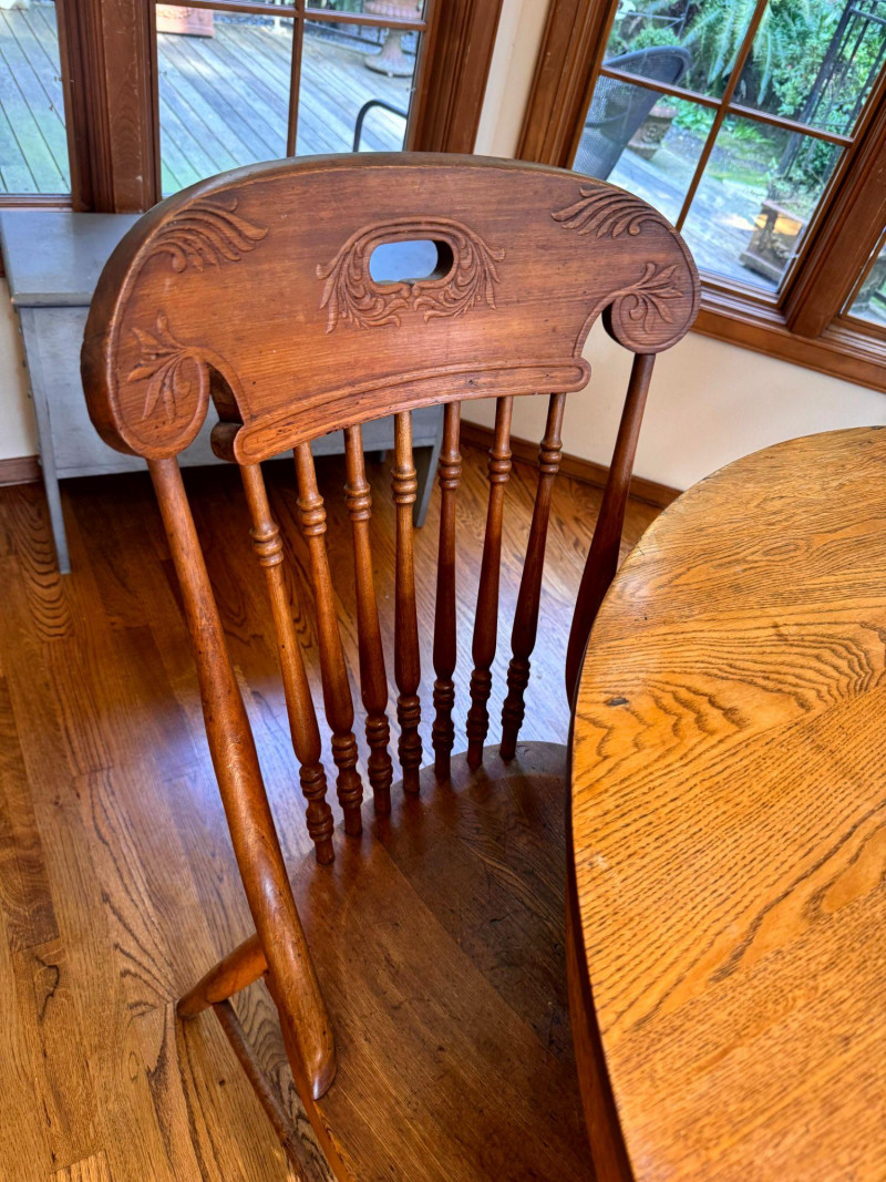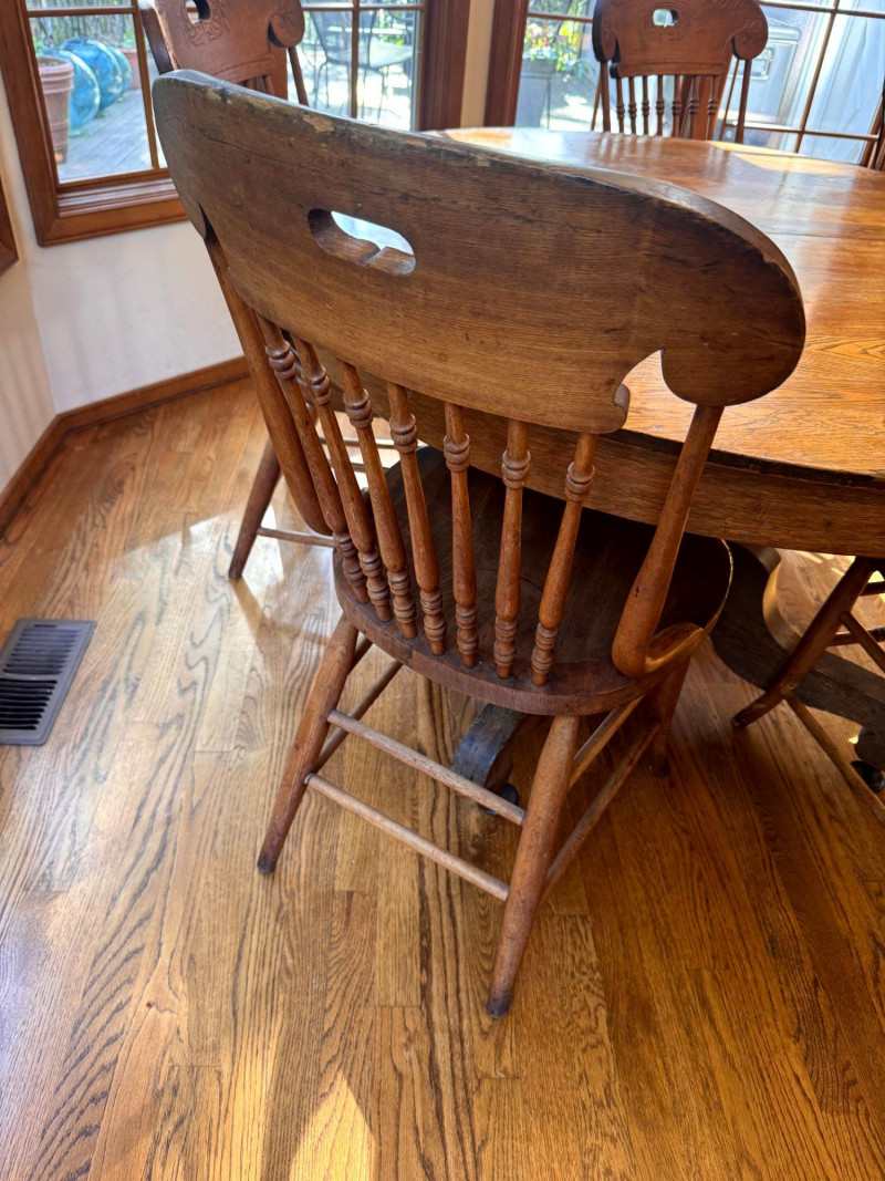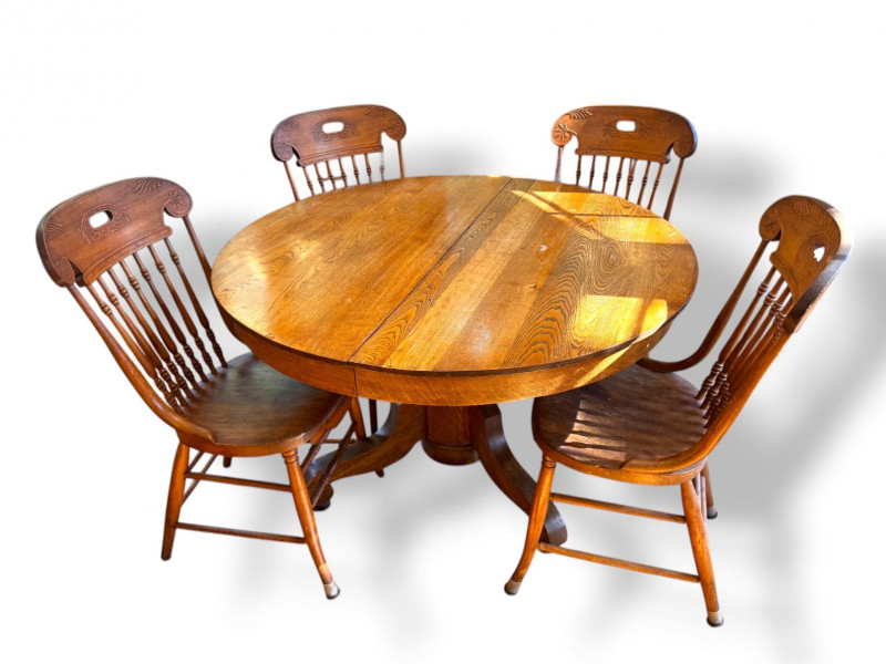 Round Oak Dining Table w/ 4 Antique Spindle Back Chairs.