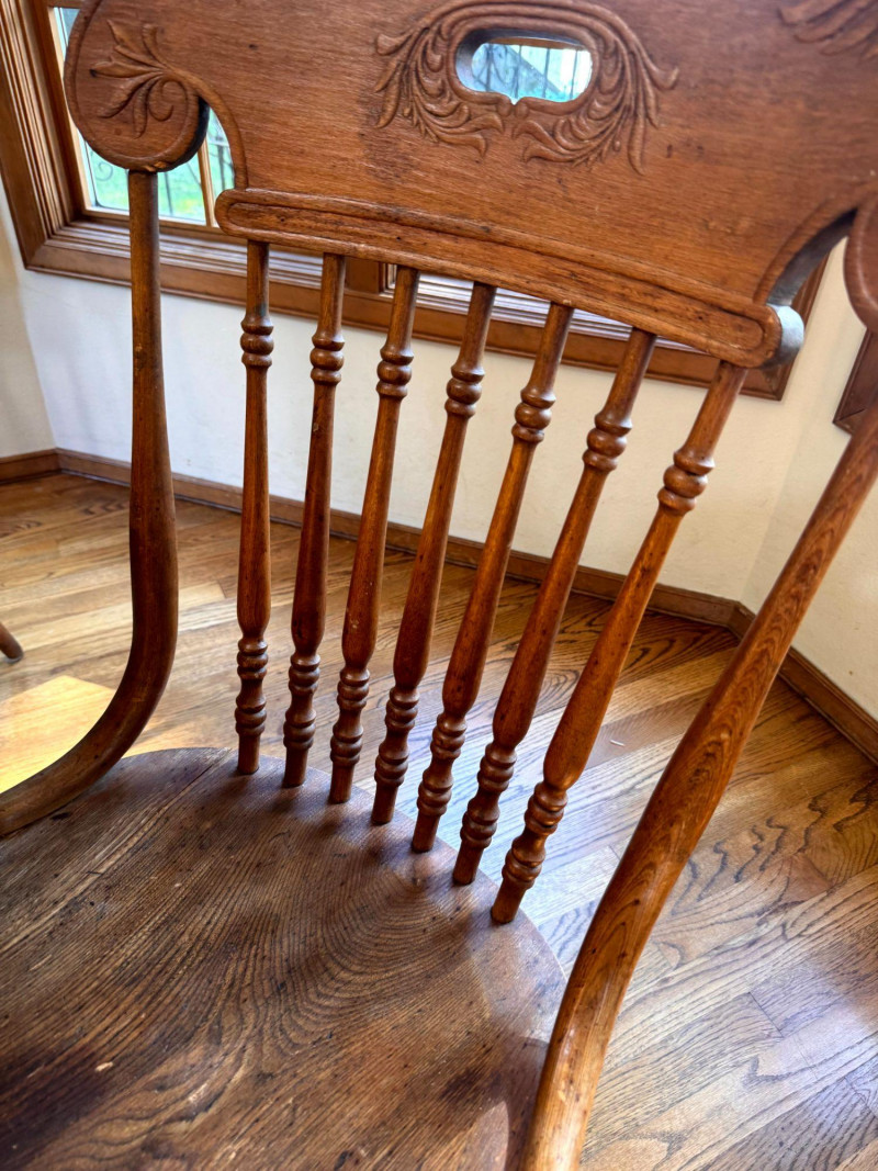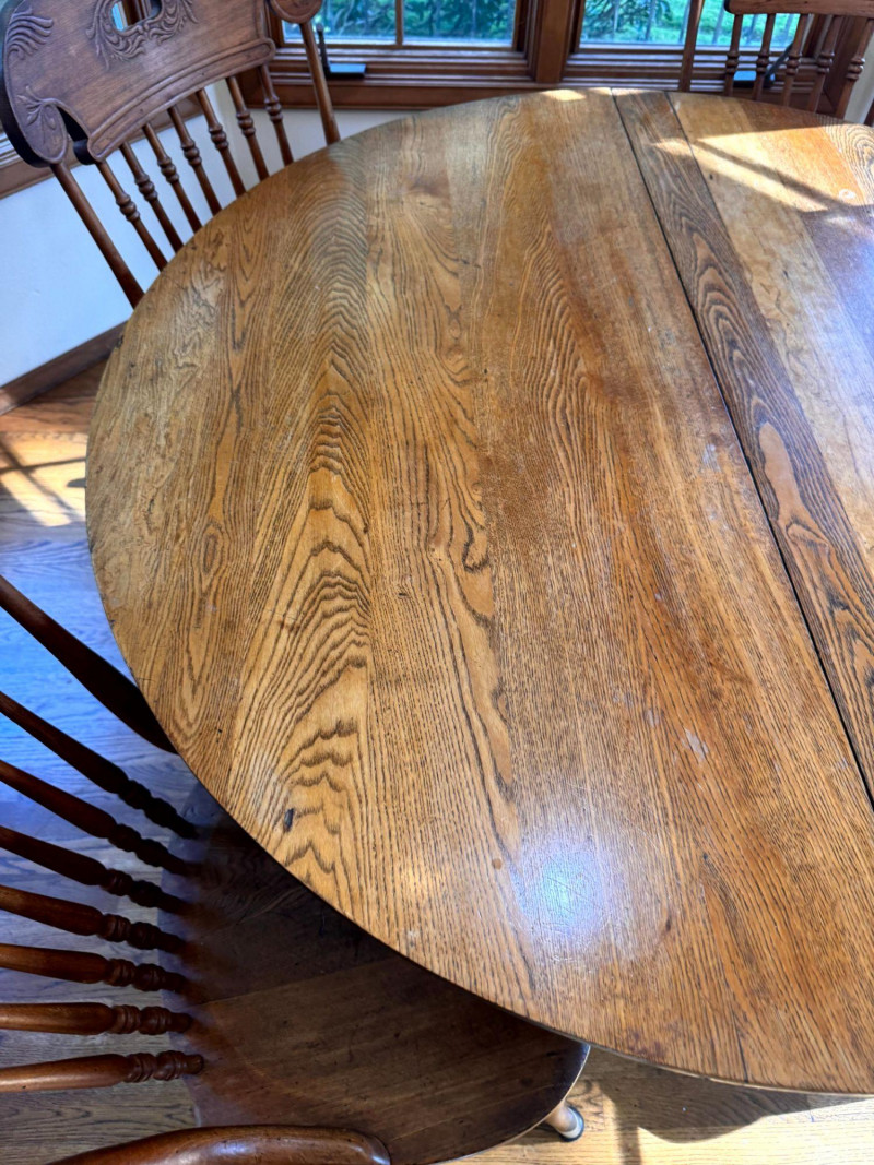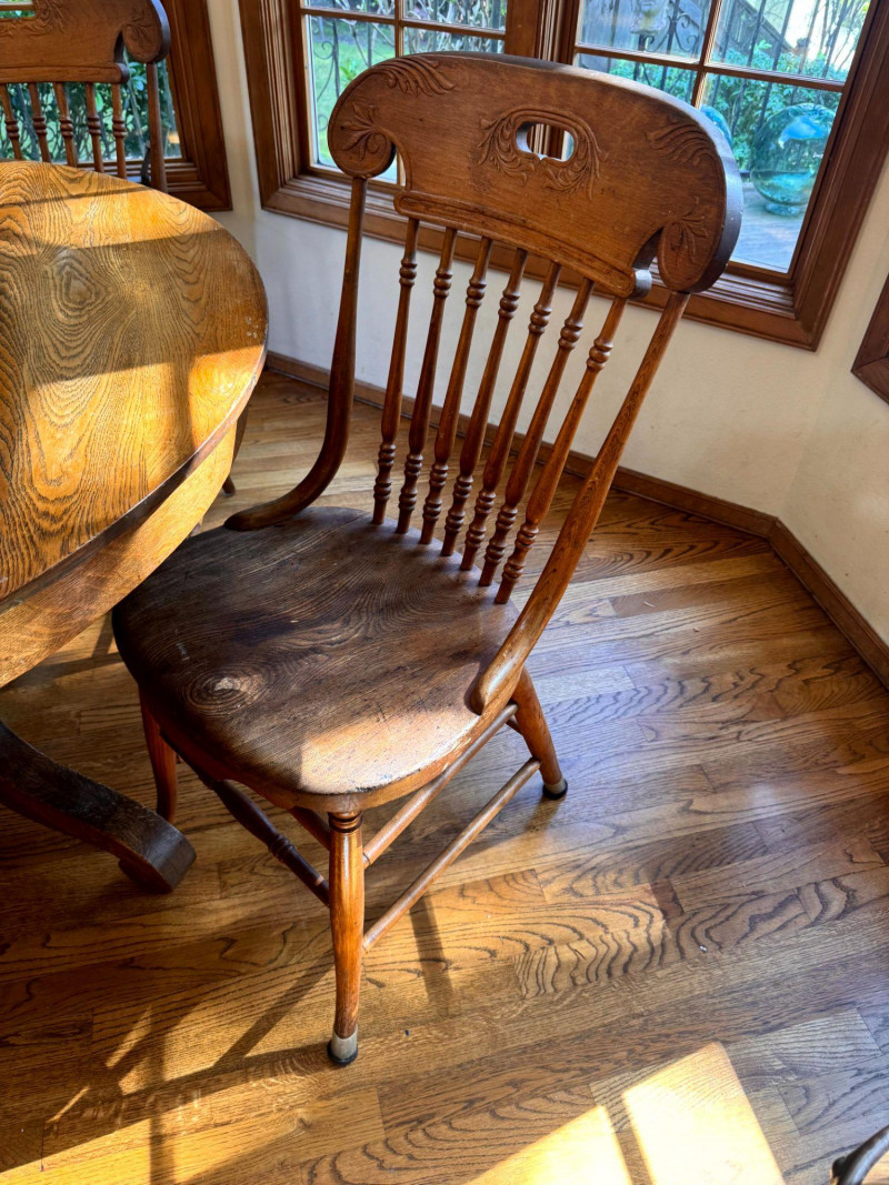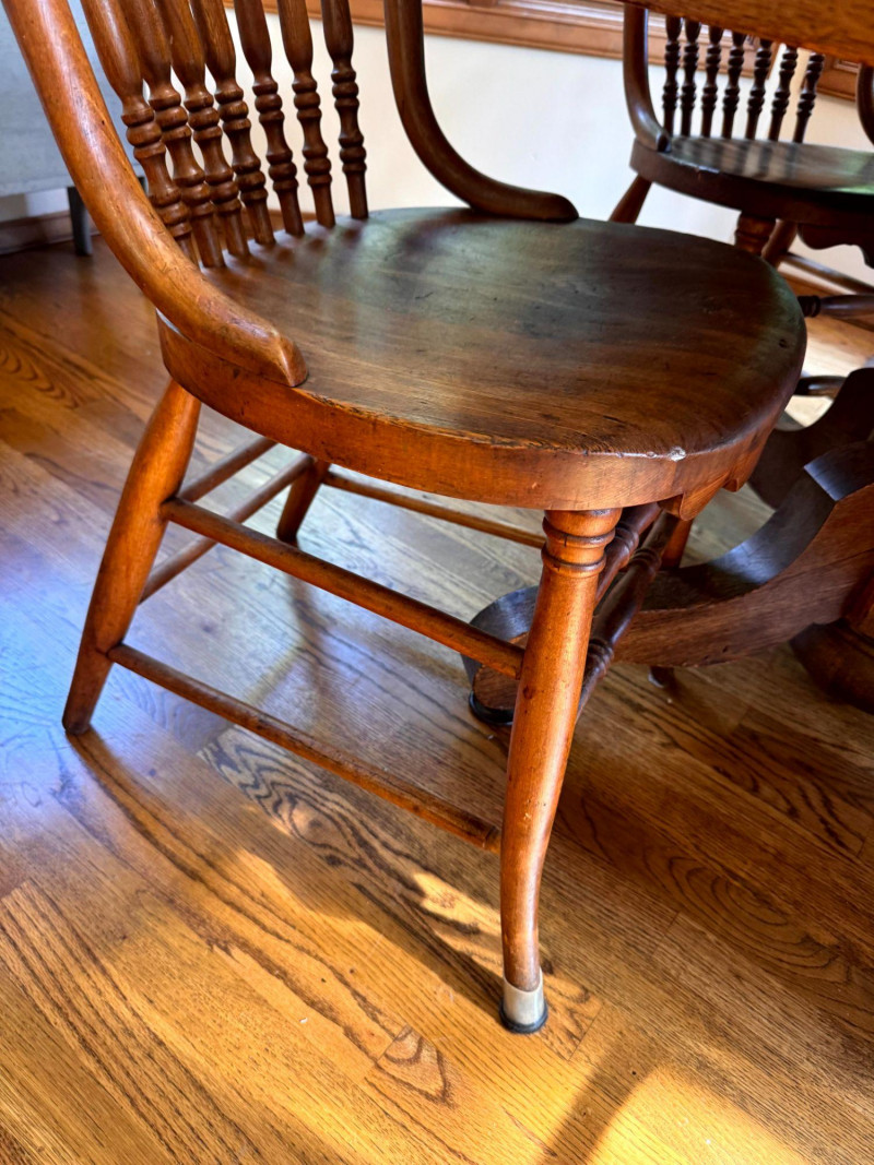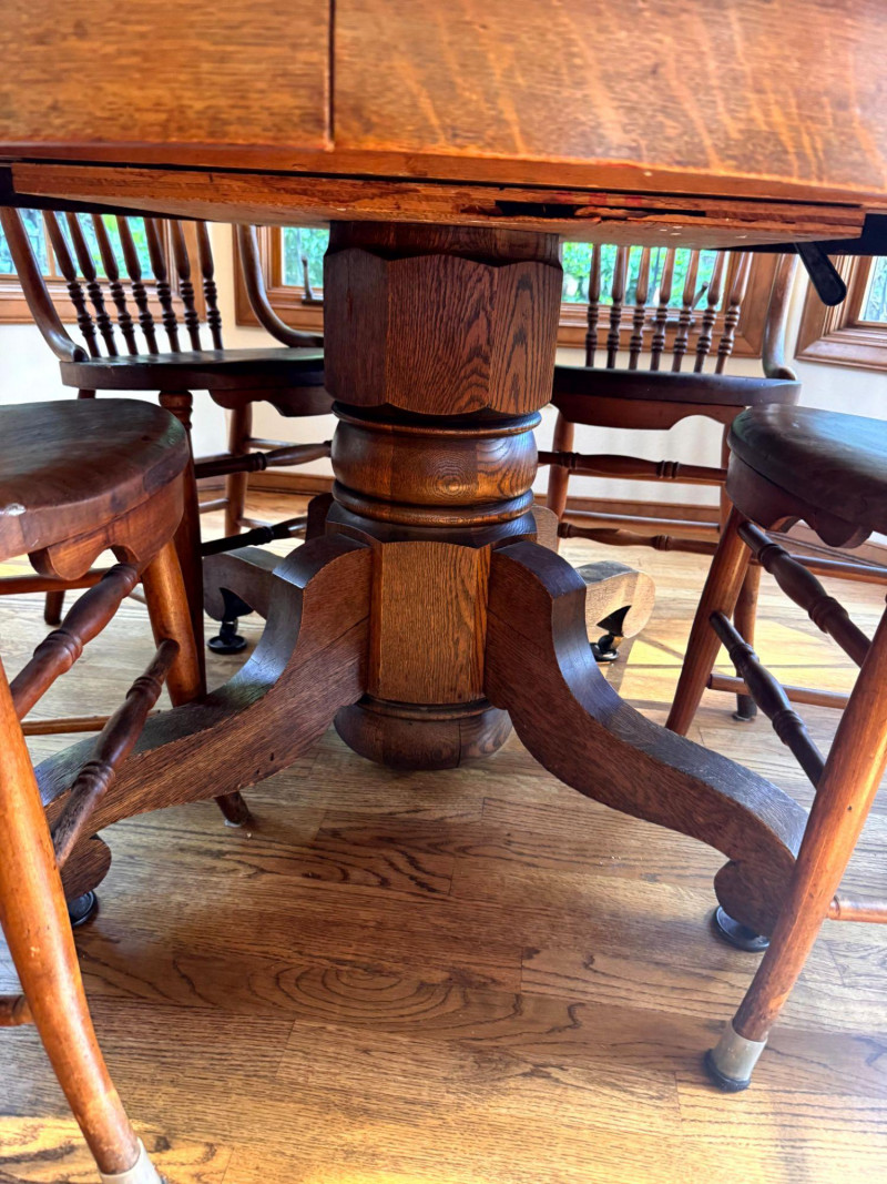 Round Oak Dining Table w/ 4 Antique Spindle Back Chairs.