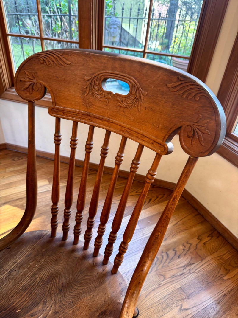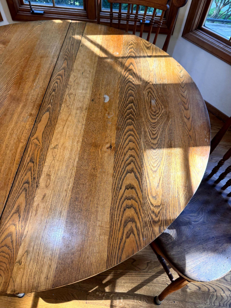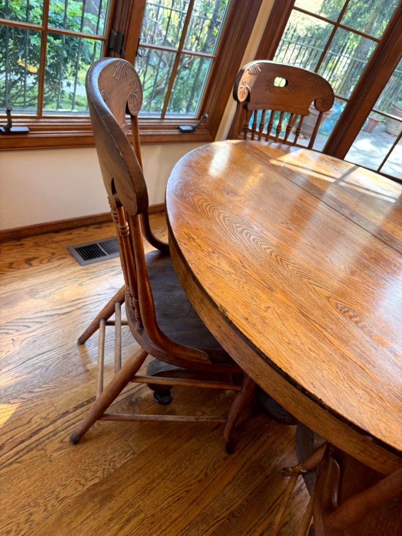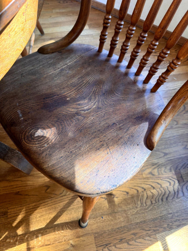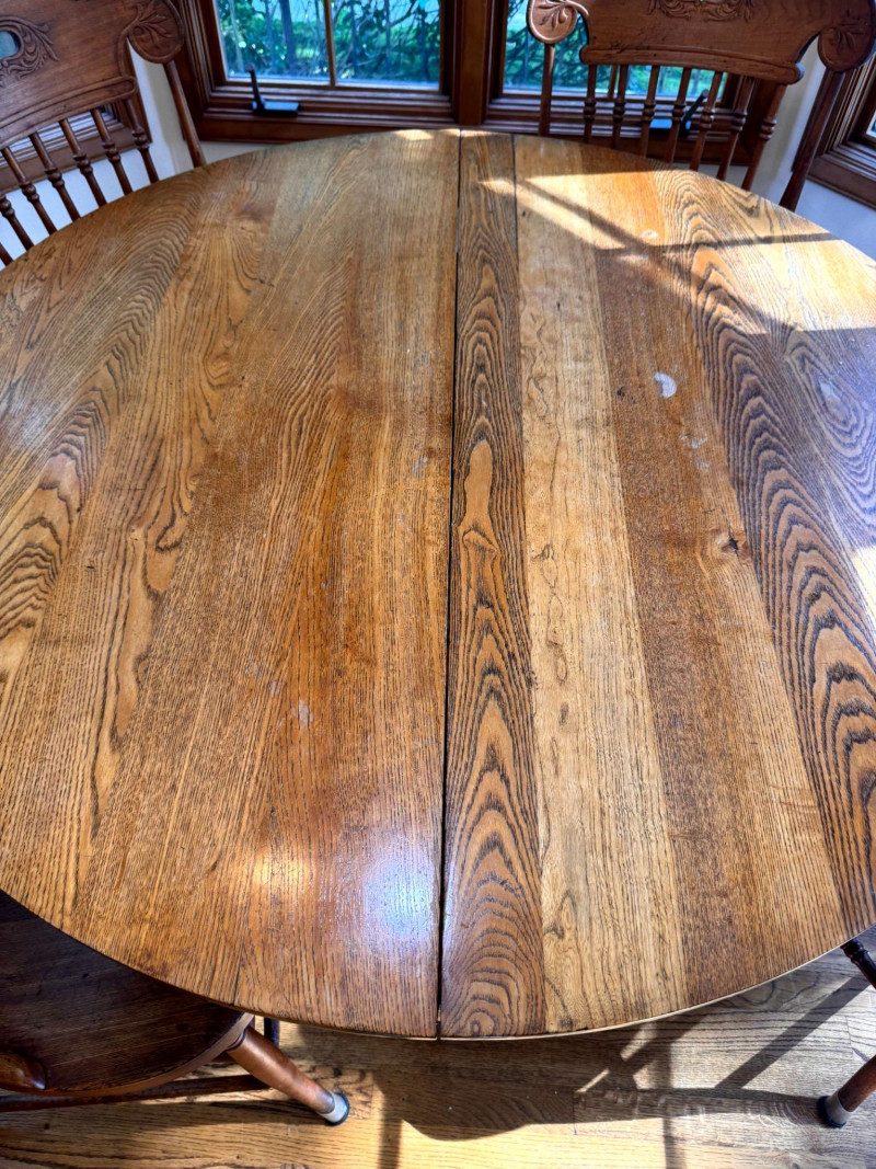 Round Oak Dining Table w/ 4 Antique Spindle Back Chairs.