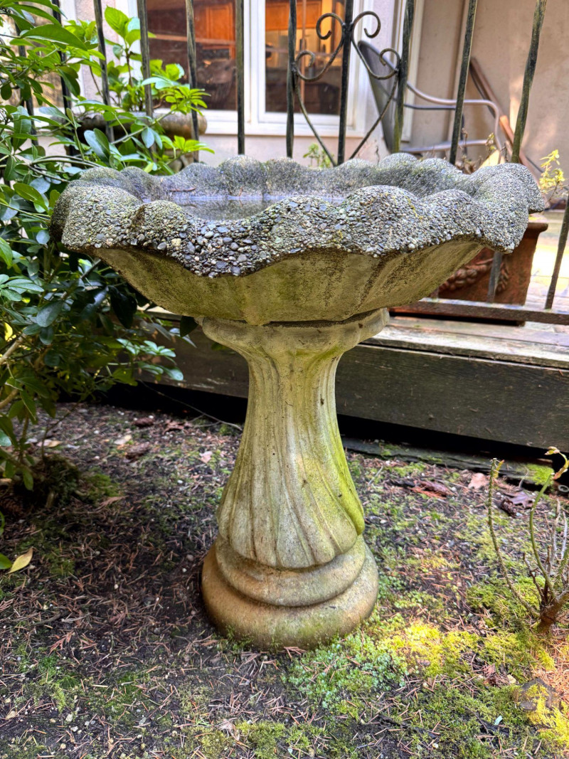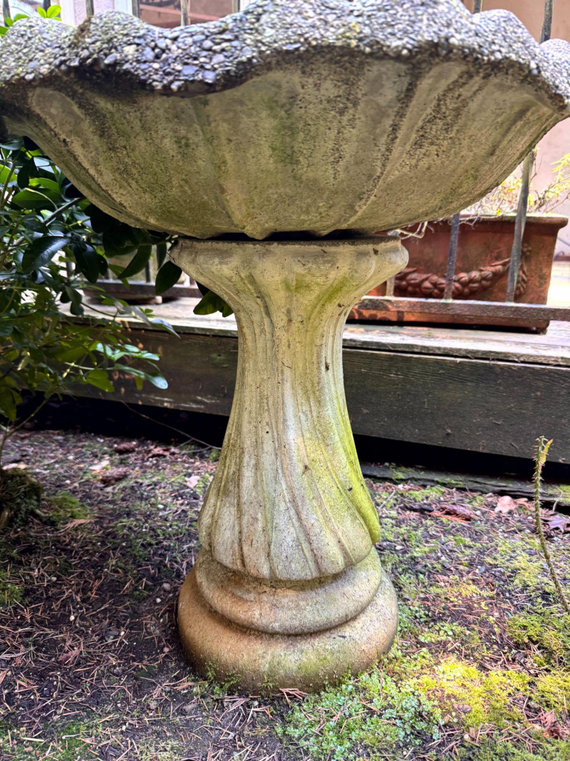 Concrete Garden Bird Bath w/ Scalloped Basin. Bidding on this lot is an agreement that: (1.) You will have at least 2 capable, able bodied persons to lift and load at a minimum. (2.) You will bring a hand truck and/or any other tools needed to remove this item. If these steps are not followed your item will be forfeit and no refund given.