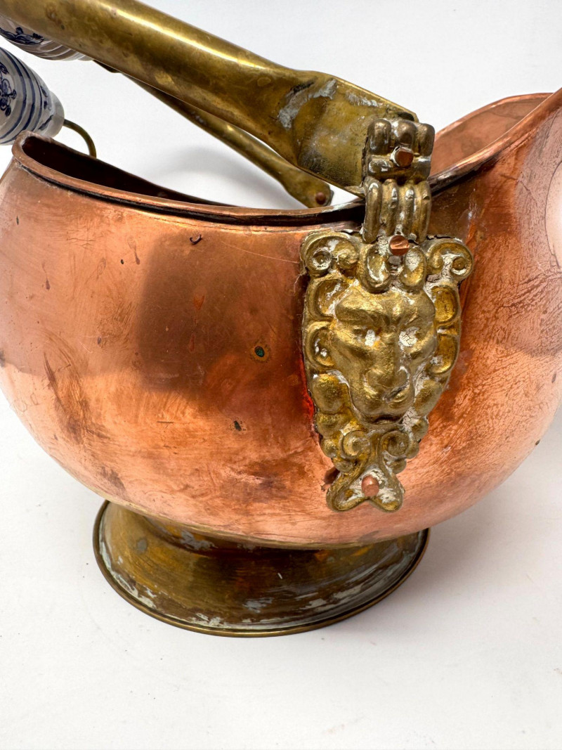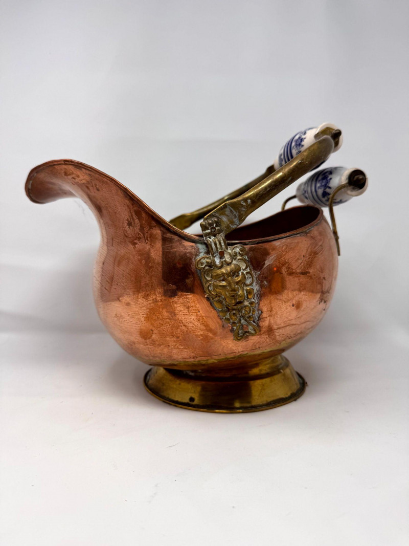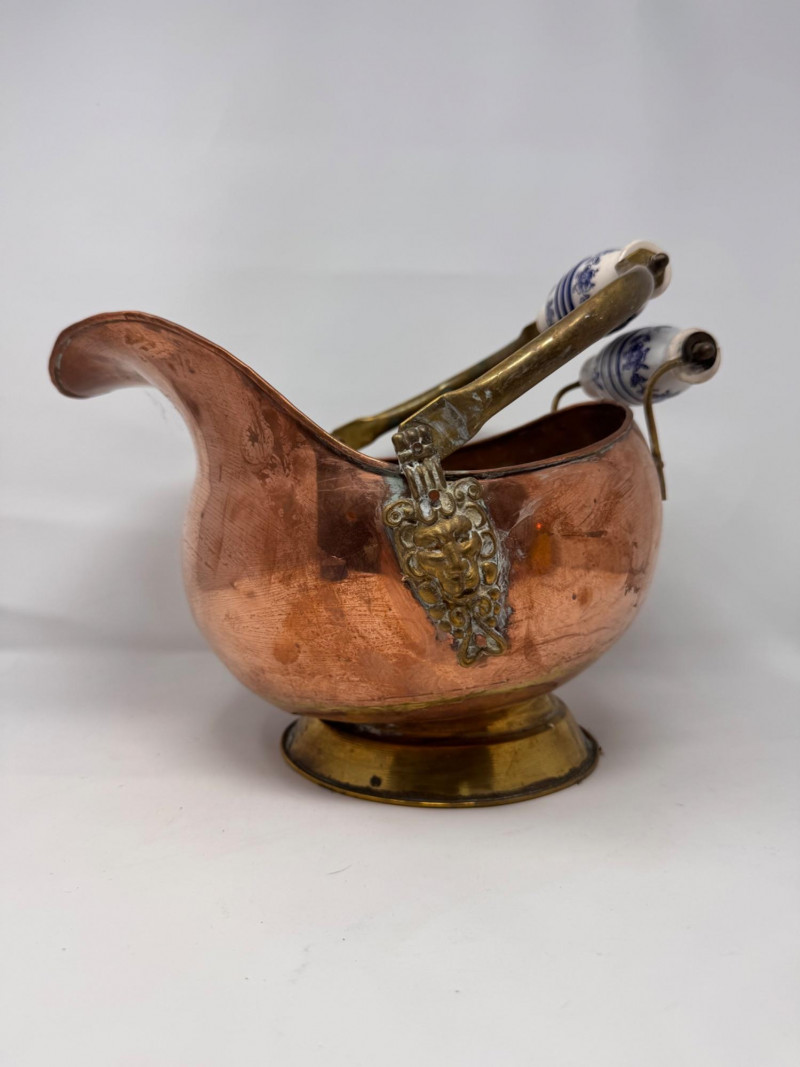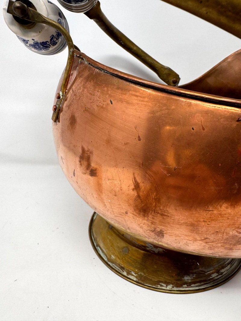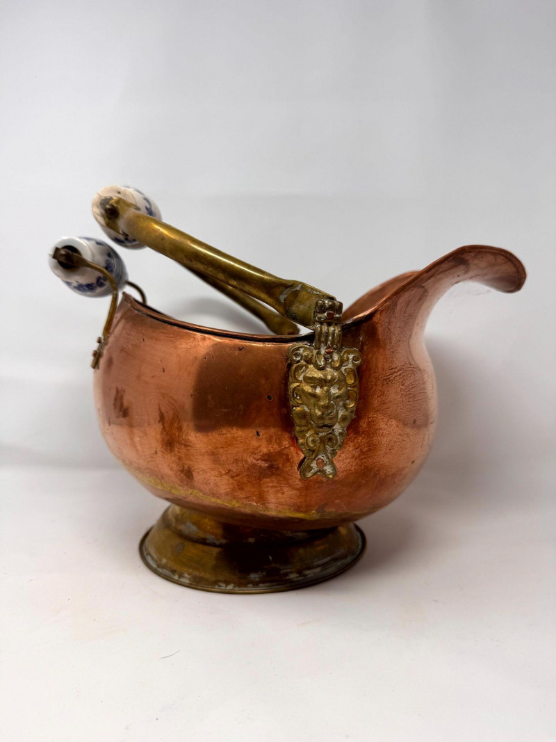 Antique Copper Helmet Coal Scuttle w/ Ceramic Handle.