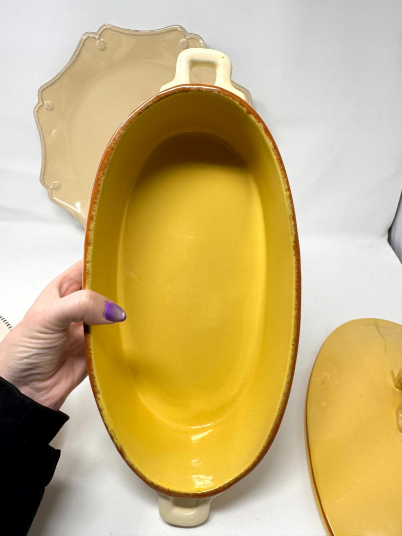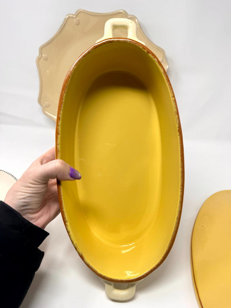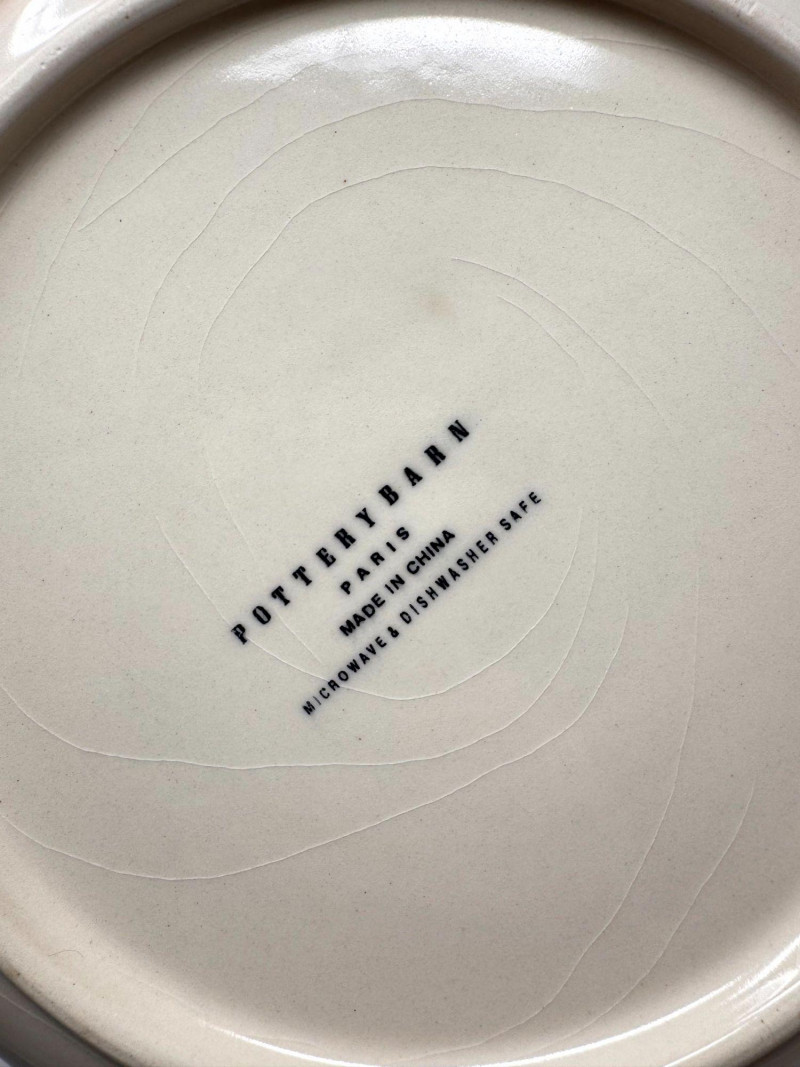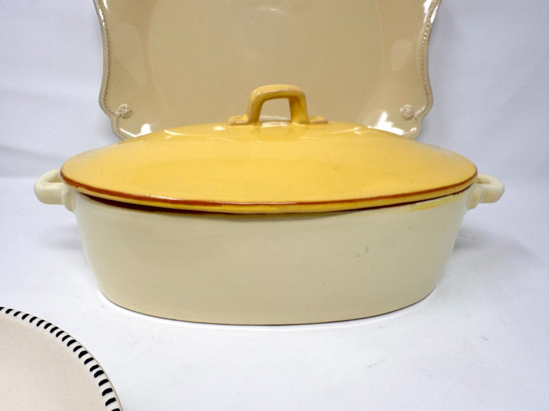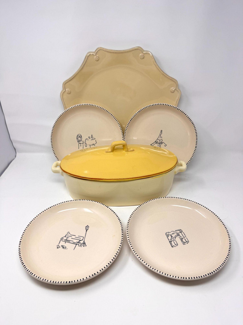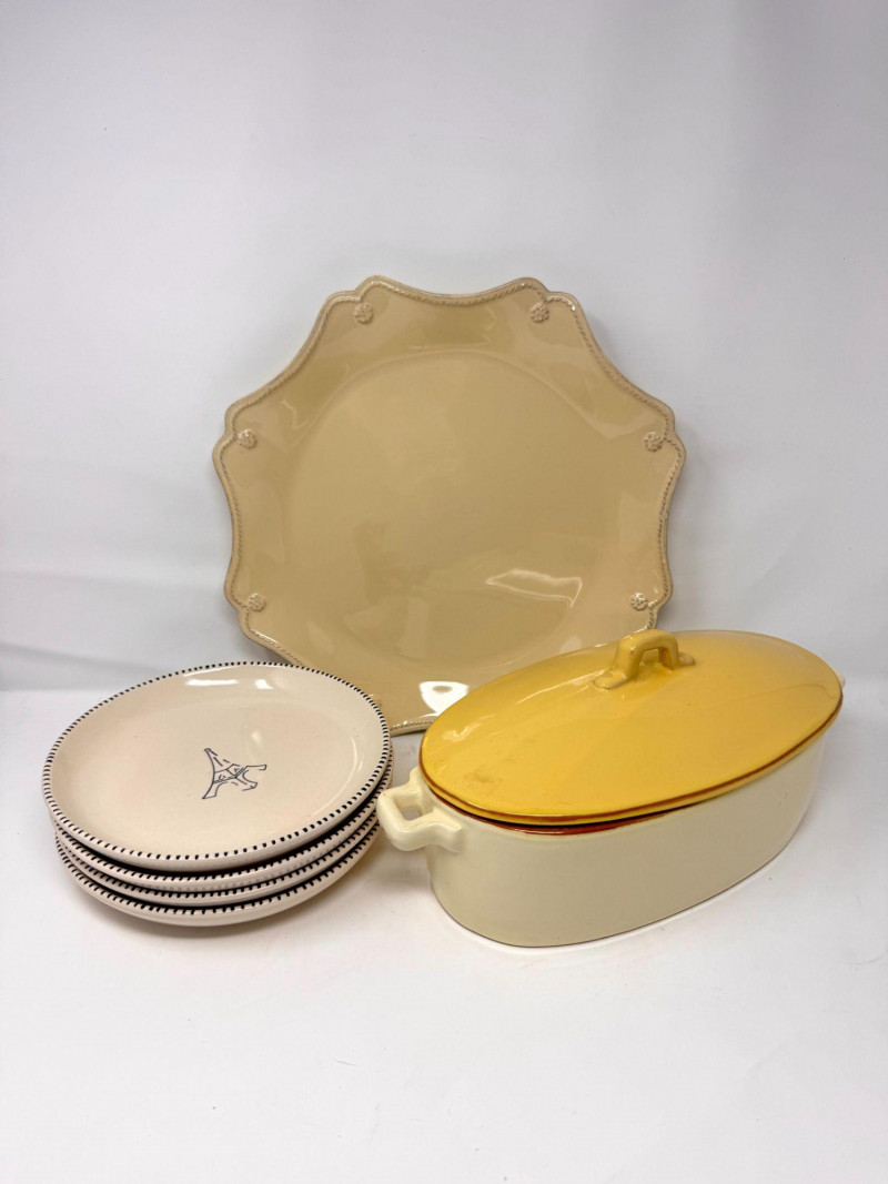 Large Juliska Platter, Vietri Casserole & Pottery Barn Paris Plates.
