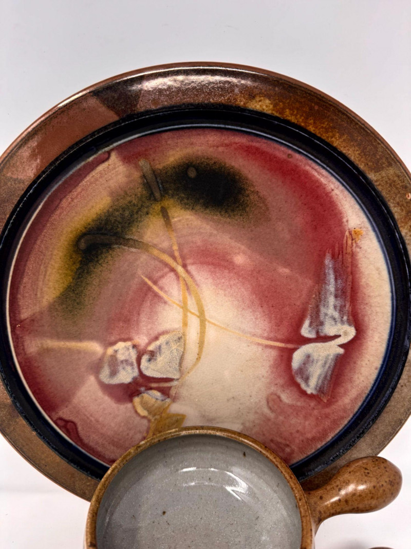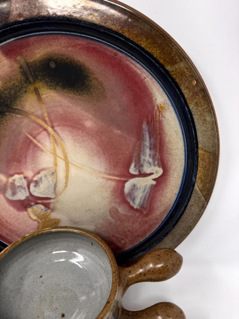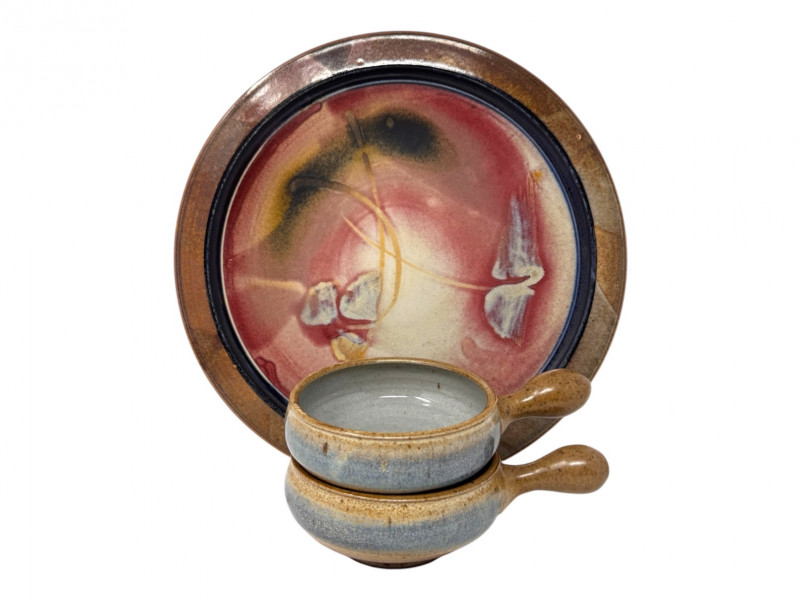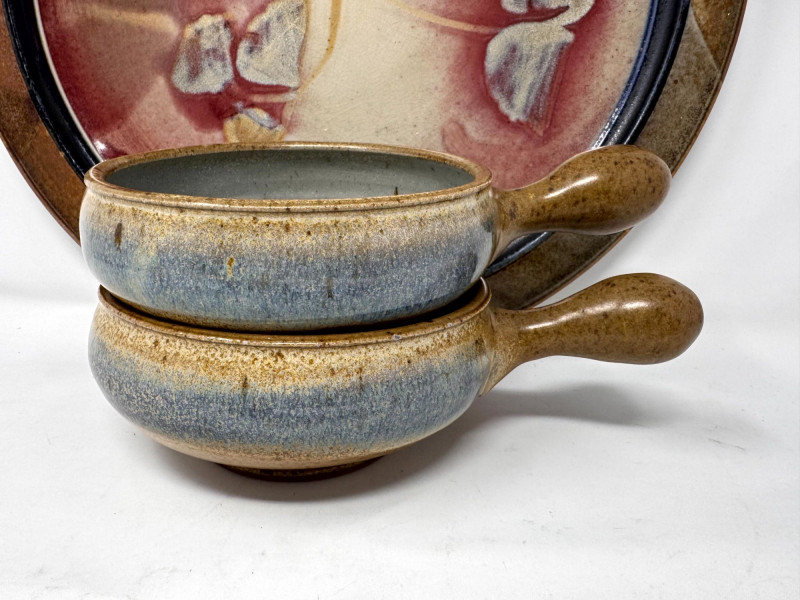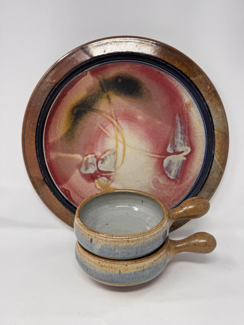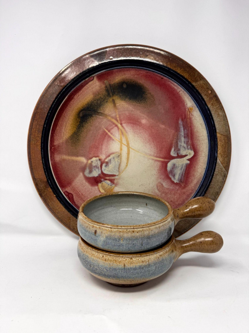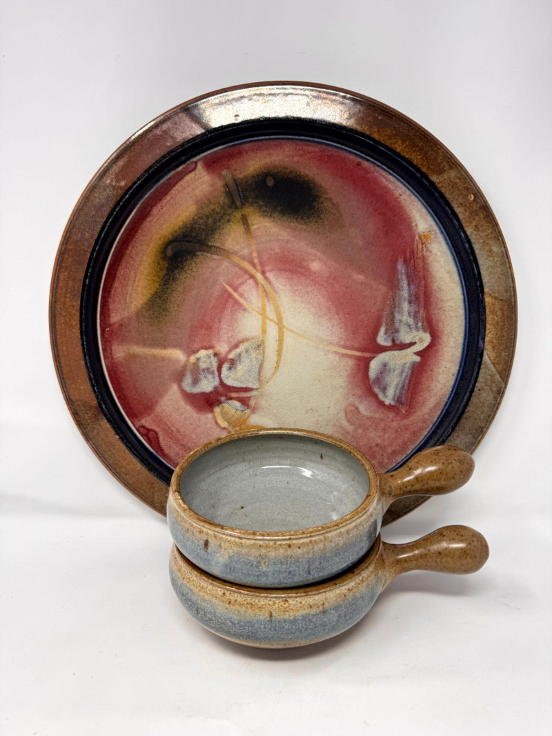 Lot # 100 - Large Studio Pottery Plate & Handled Soup Bowls Set