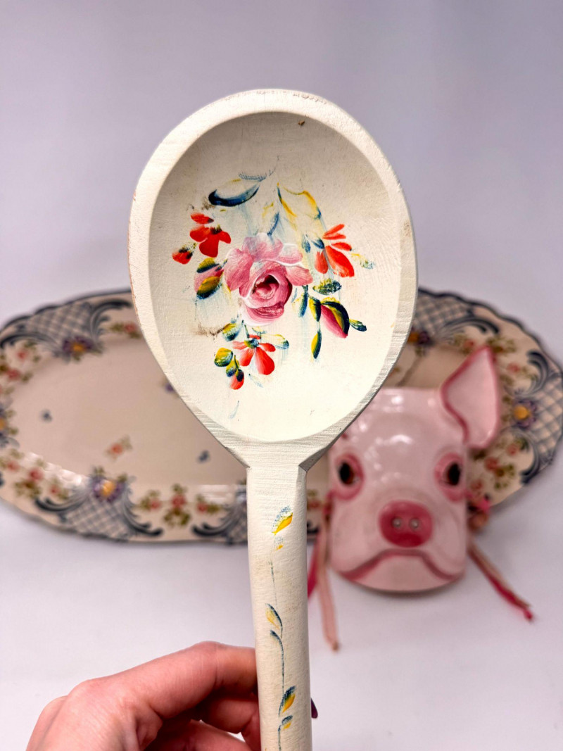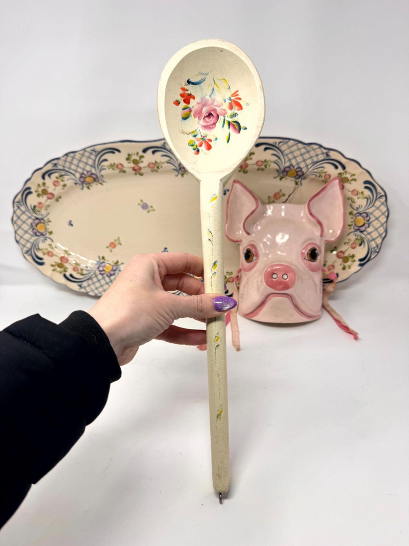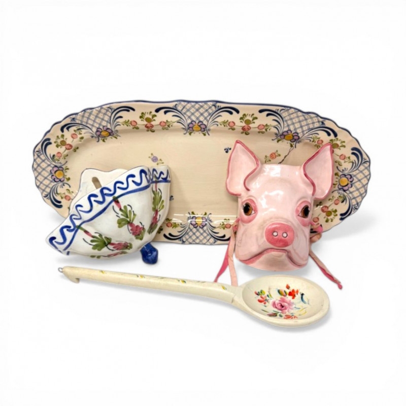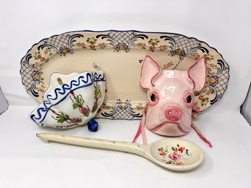 Antique Serving Platter, Andrea West Pig Wall Mask, Planter, & Spoon.
