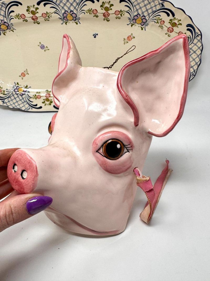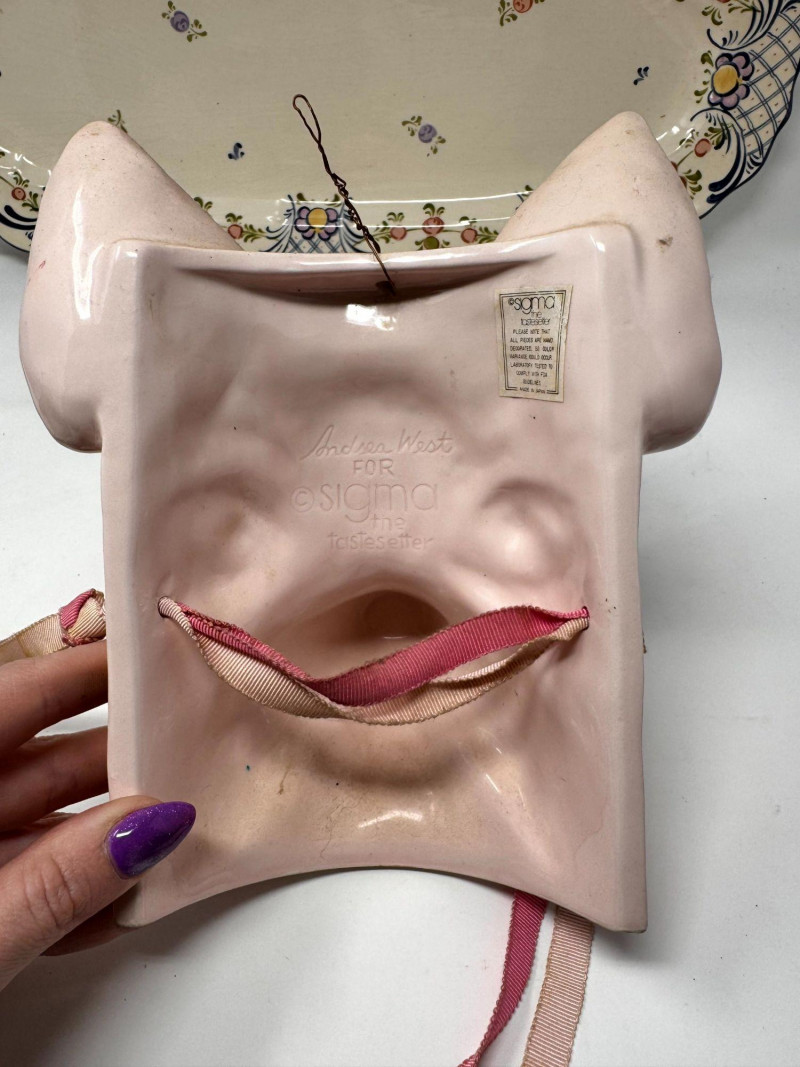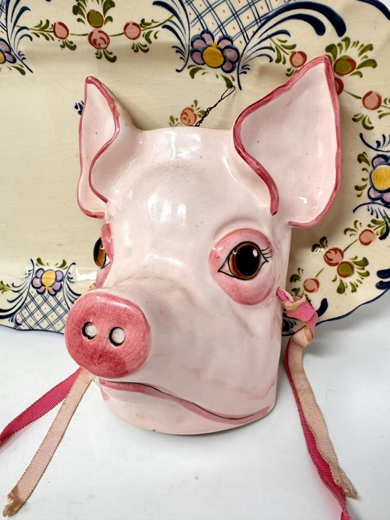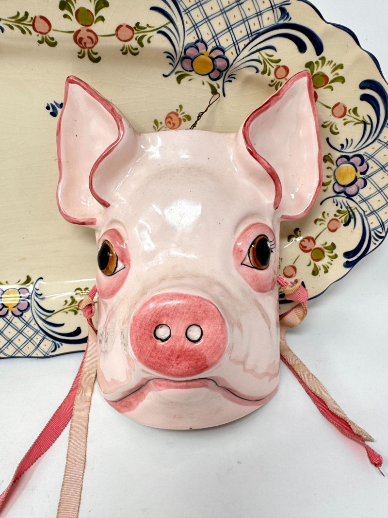 Lot # 104 - Antique Serving Platter, Andrea West Pig Wall Mask, Planter, & Spoon
