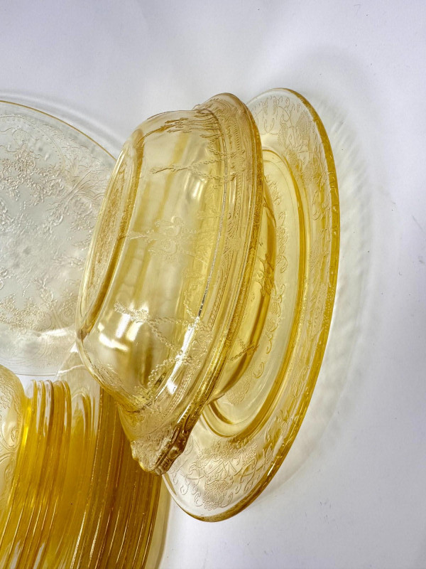 Yellow Pressed Glass Serving Set - Plates, Bowls & Covered Dish.
