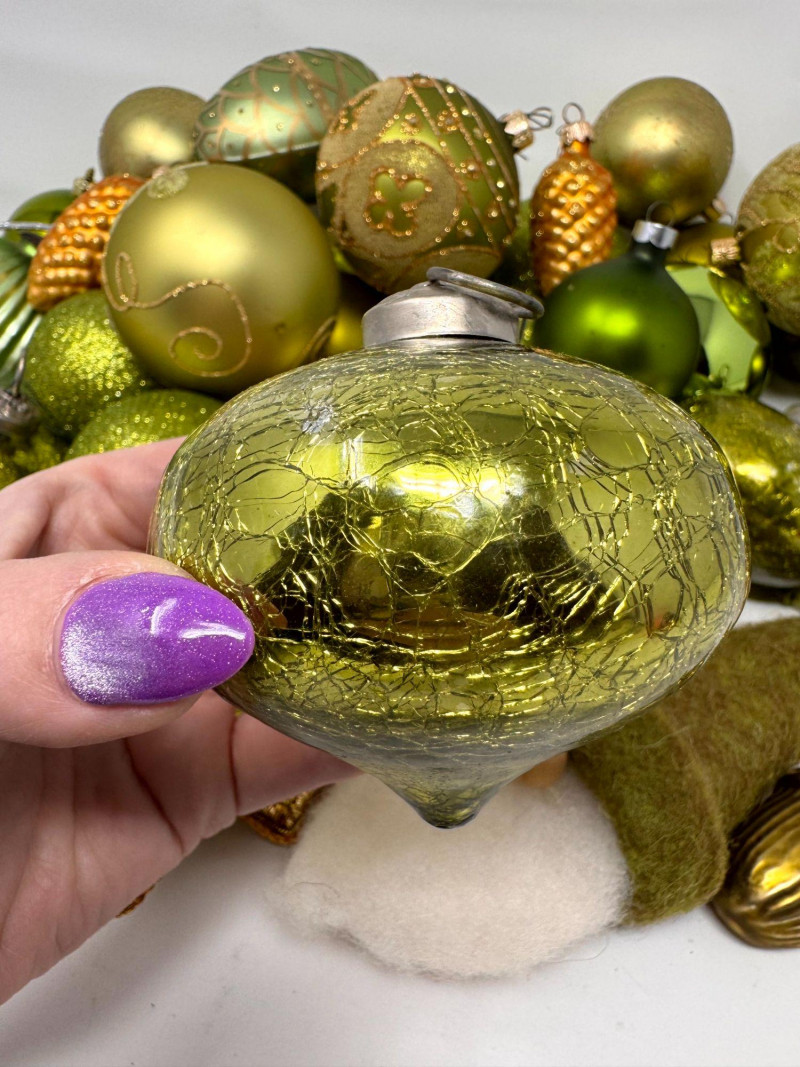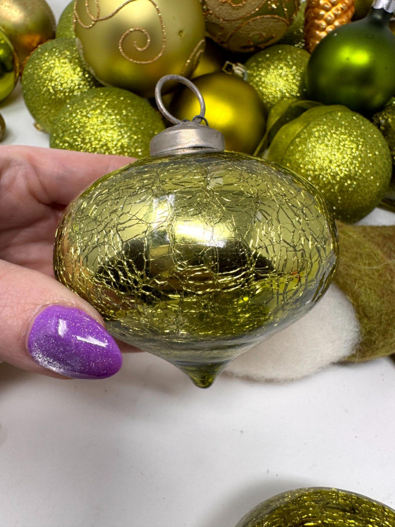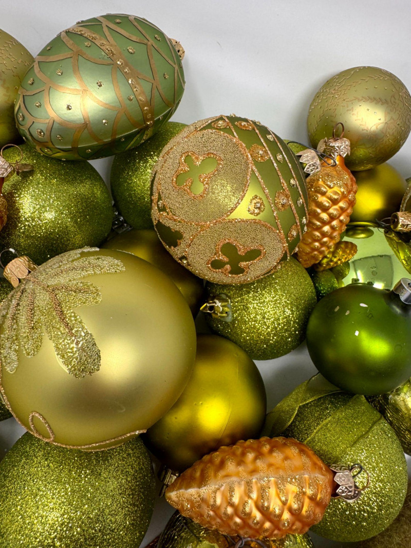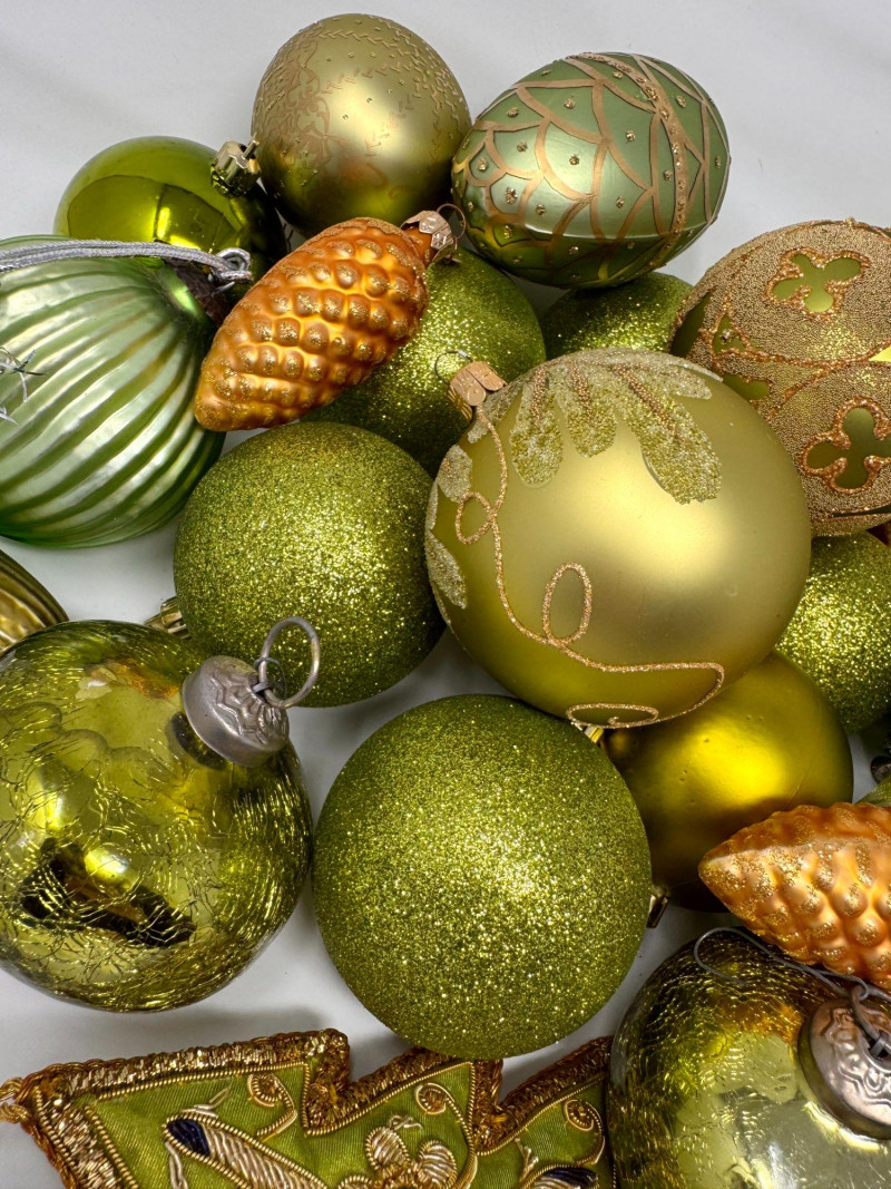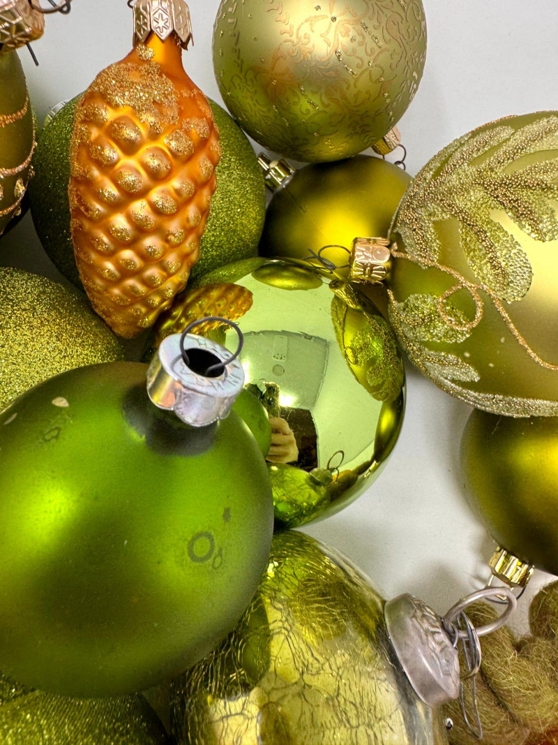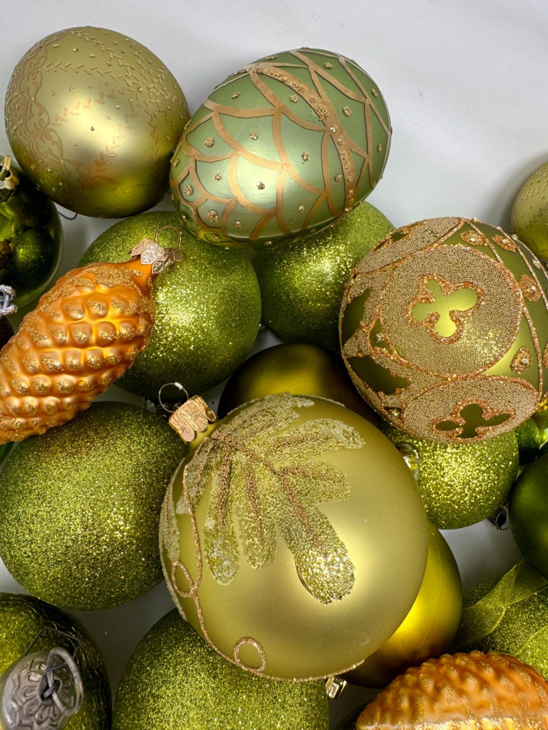 Assorted Hand-Blown Glass Christmas Ornaments in Green Tones.
