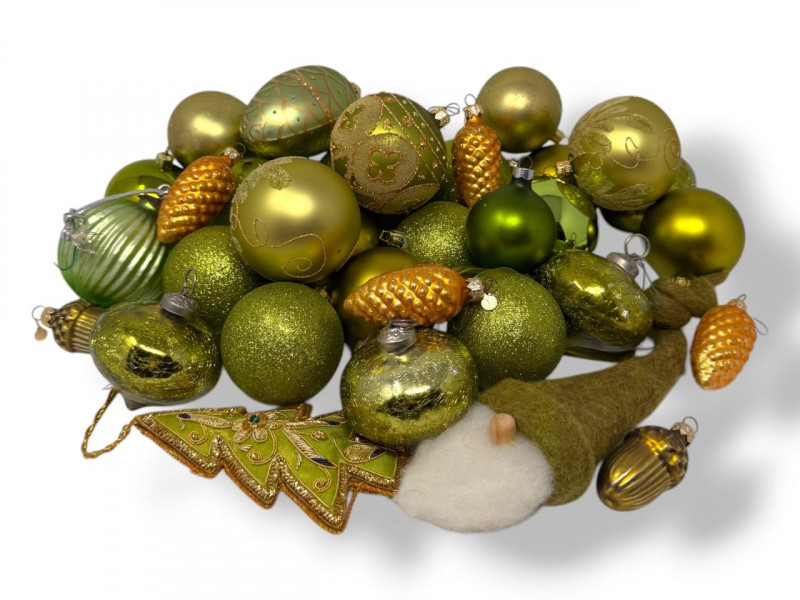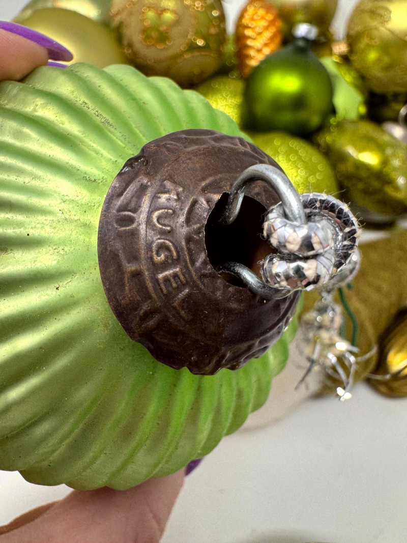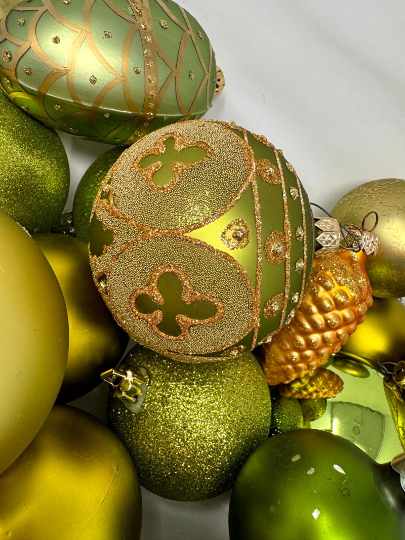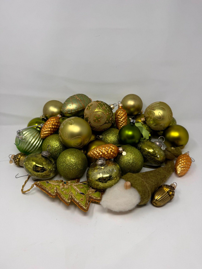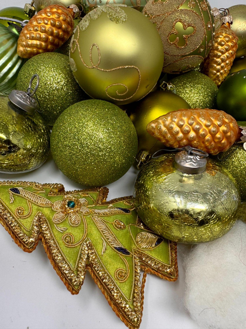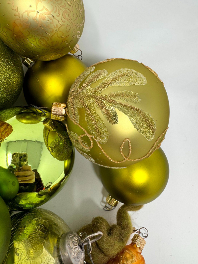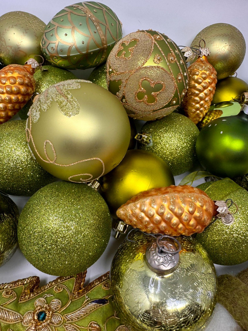 Assorted Hand-Blown Glass Christmas Ornaments in Green Tones.