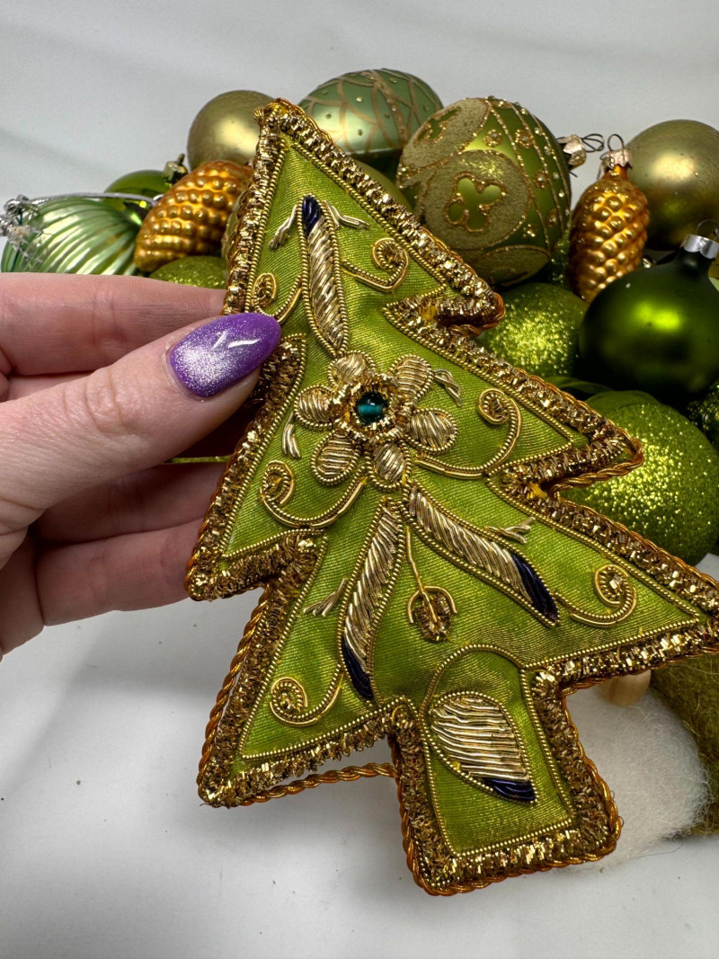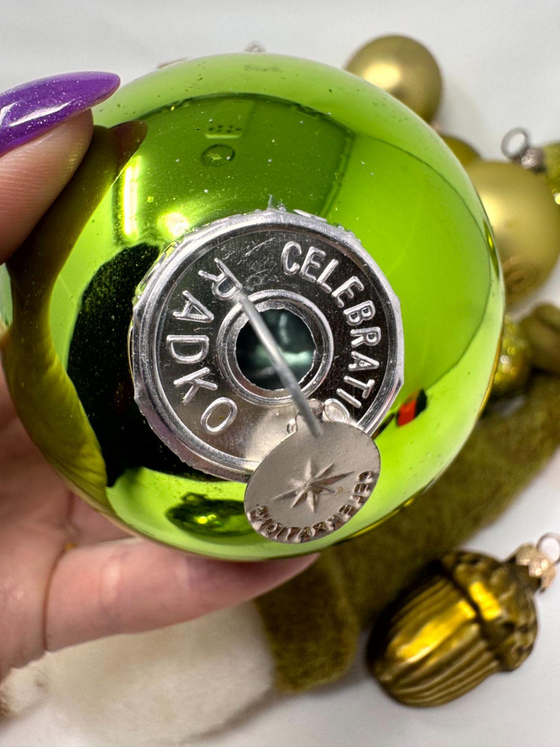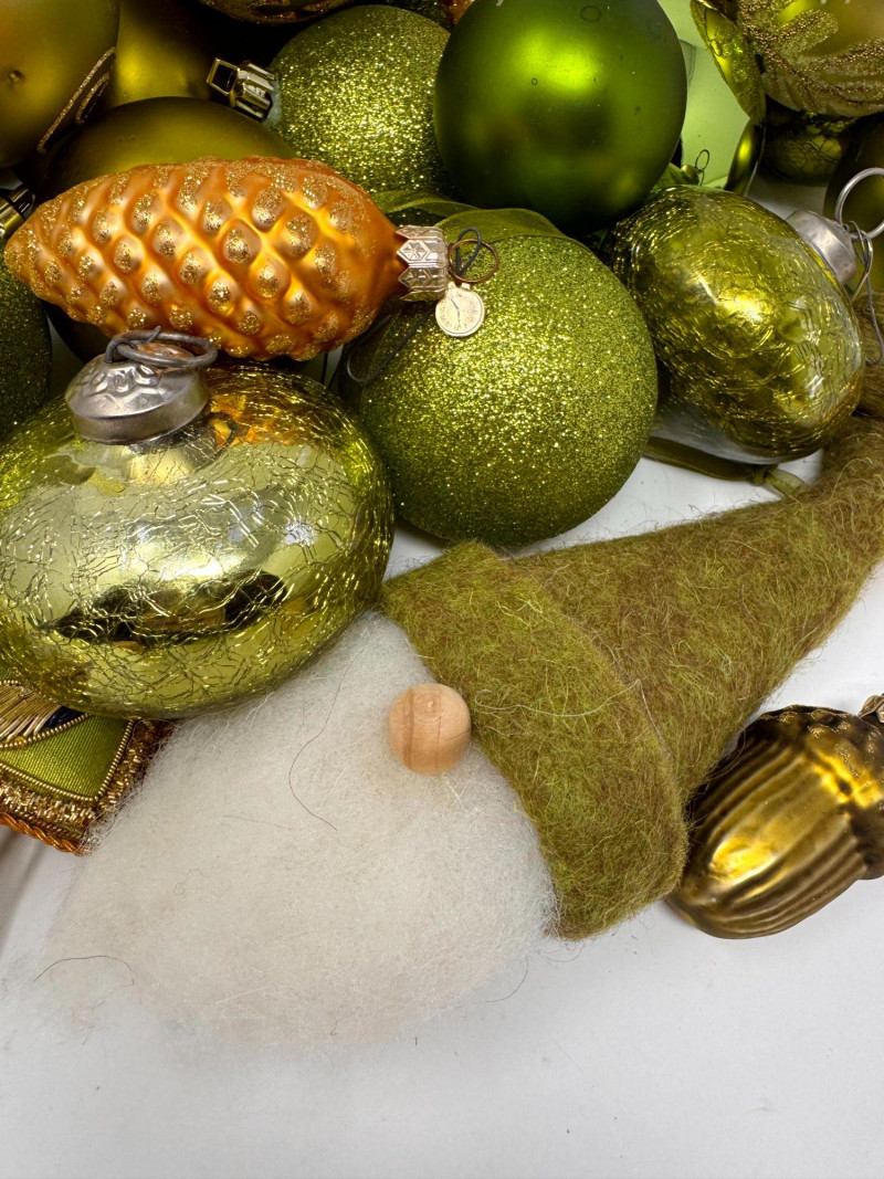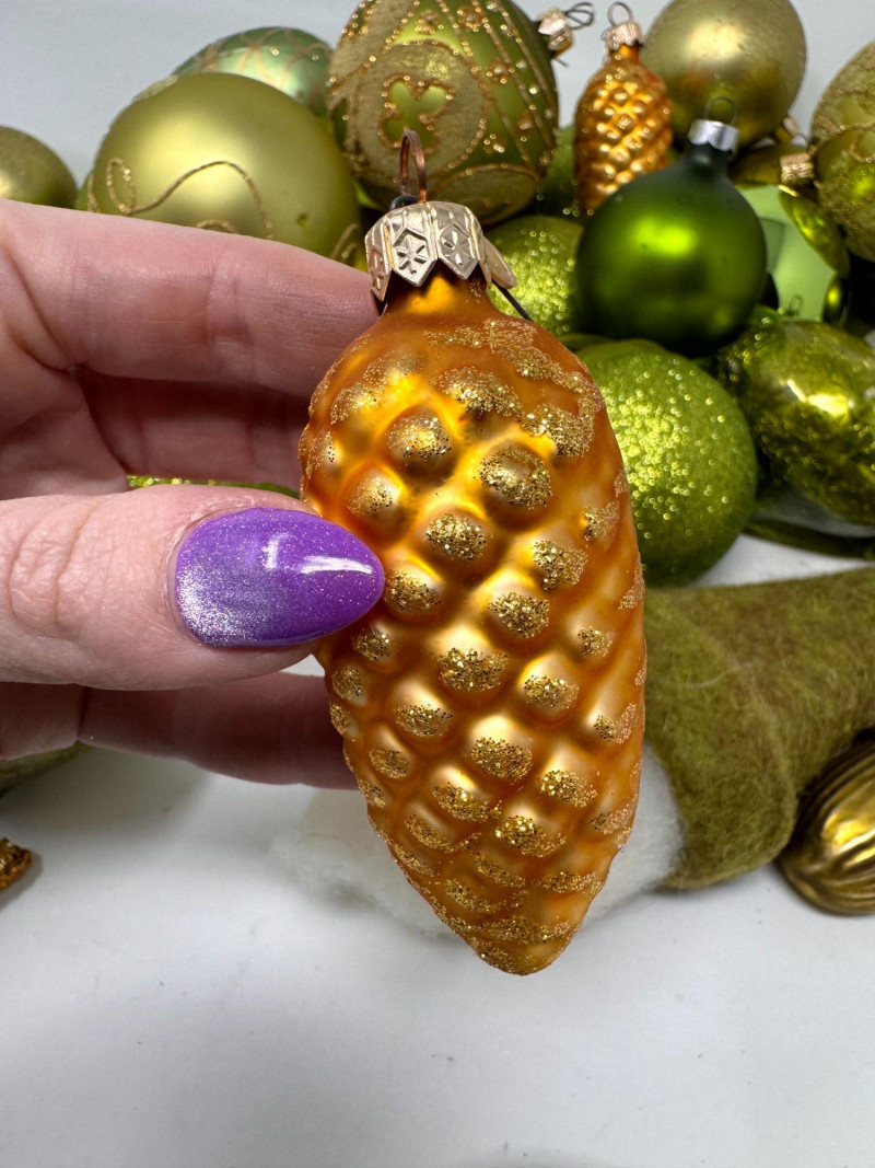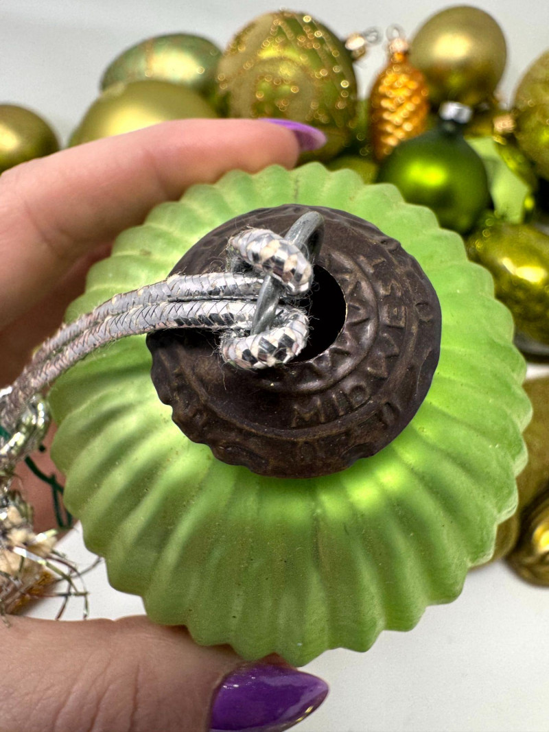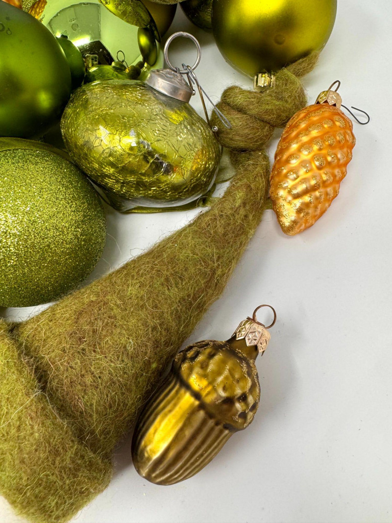 Assorted Hand-Blown Glass Christmas Ornaments in Green Tones.