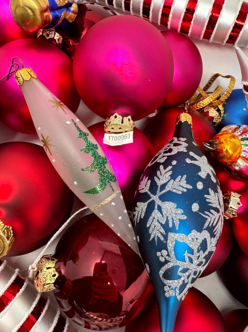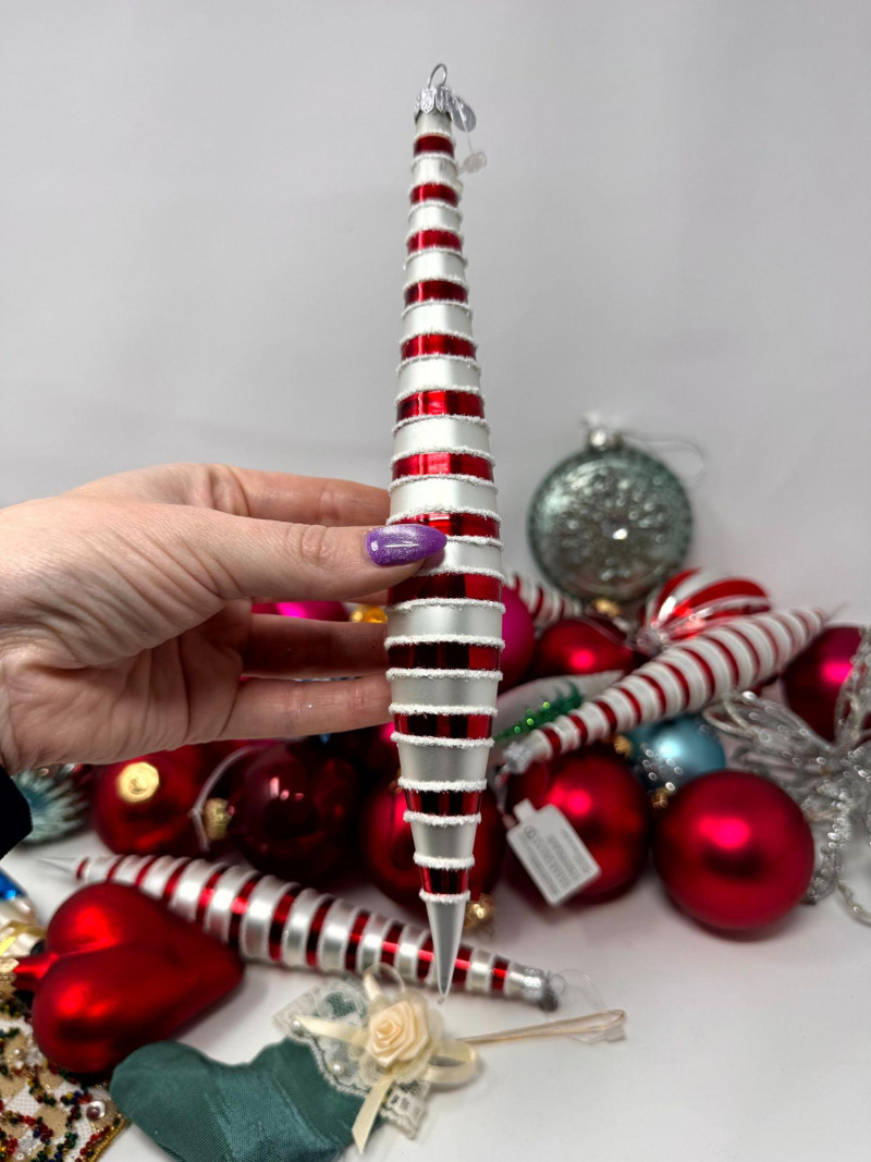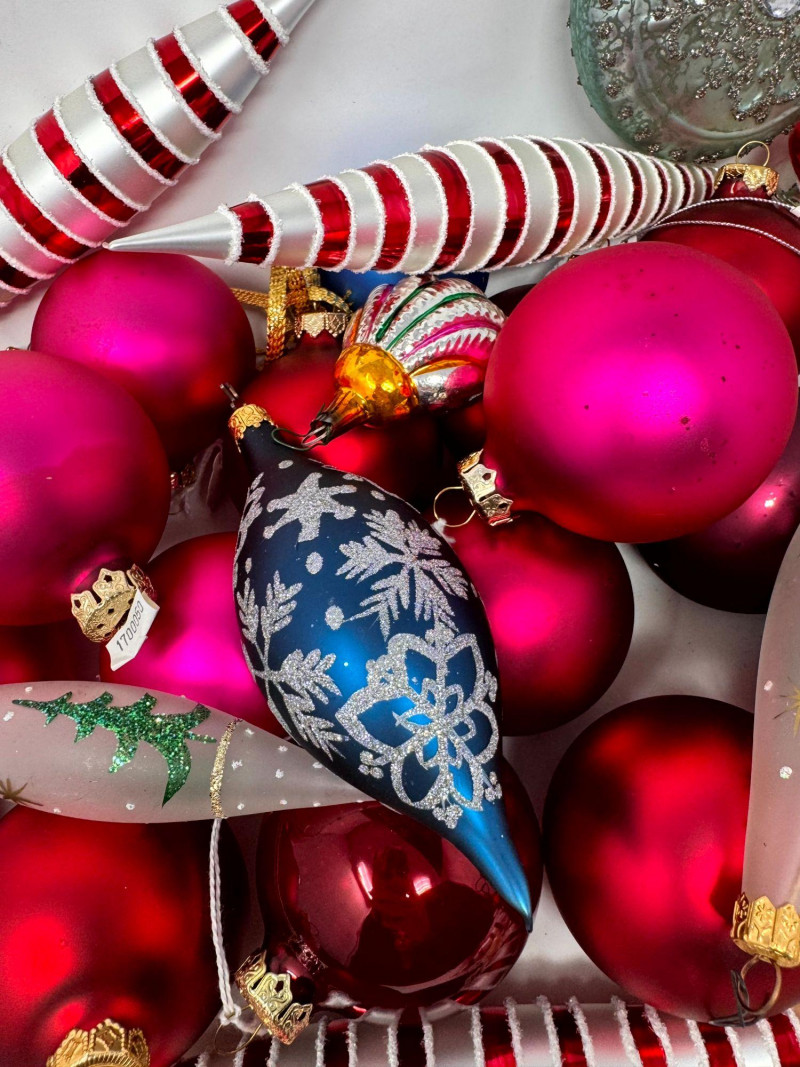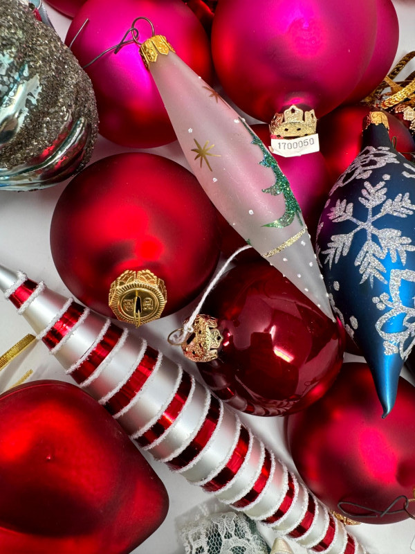Hand-Blown Glass Christmas Ornaments in Red & Silver Tones.