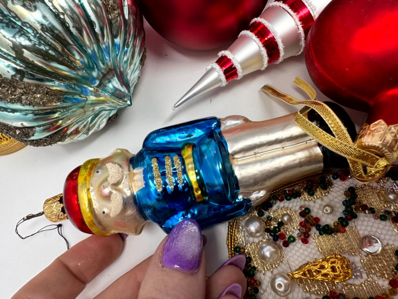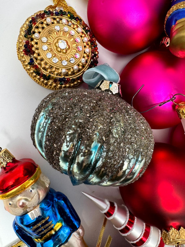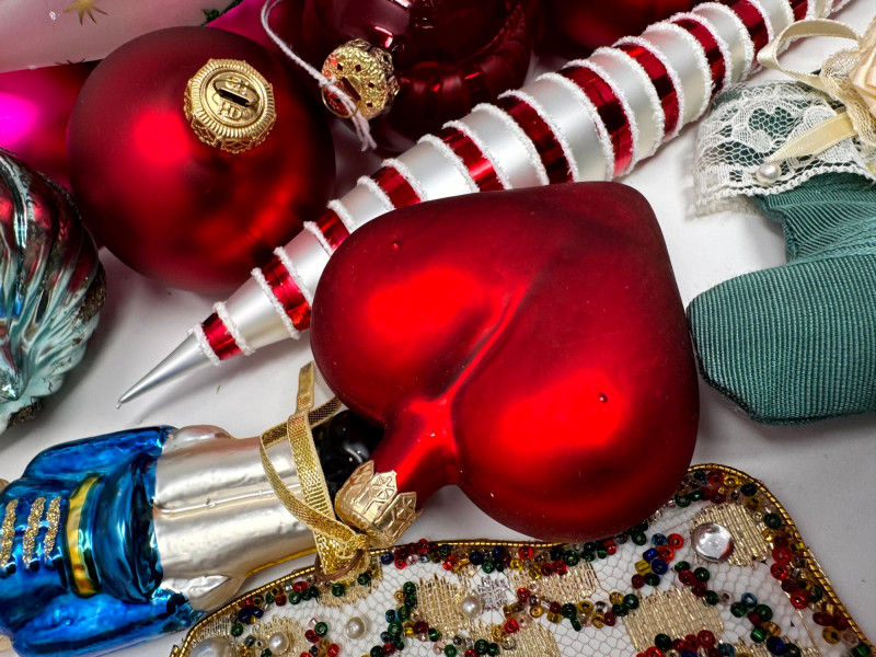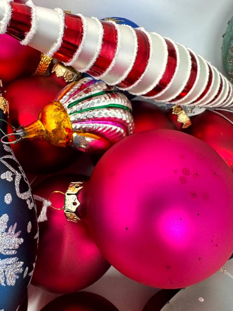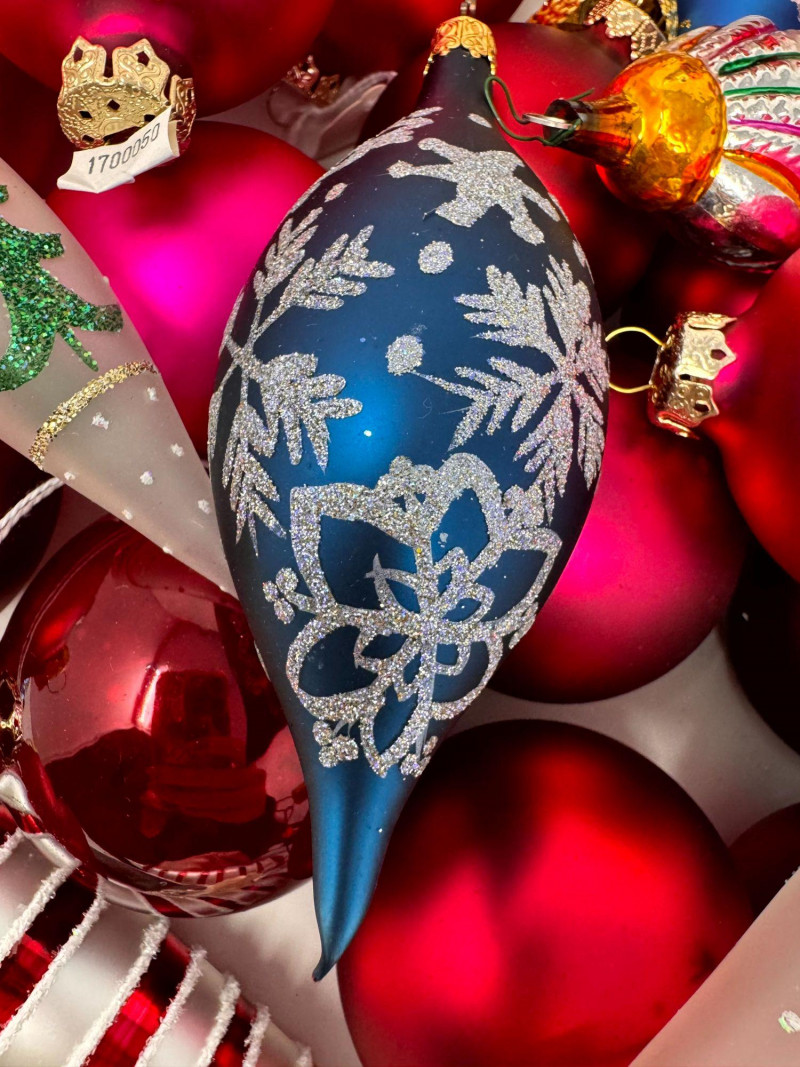 Hand-Blown Glass Christmas Ornaments in Red & Silver Tones.