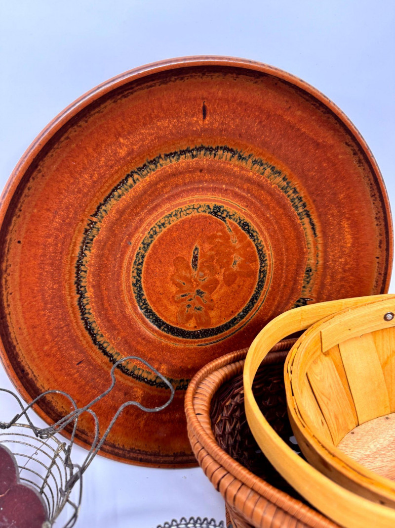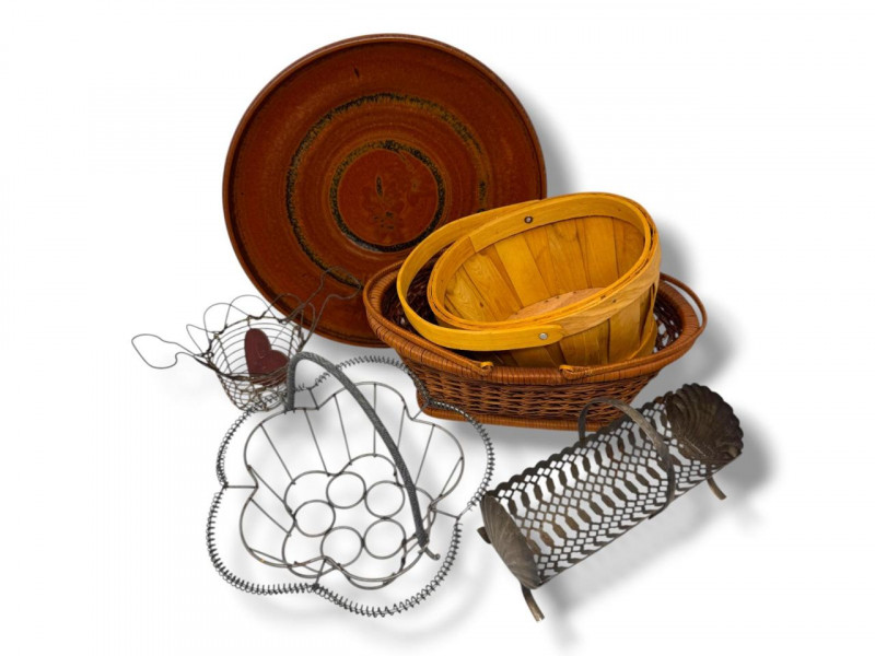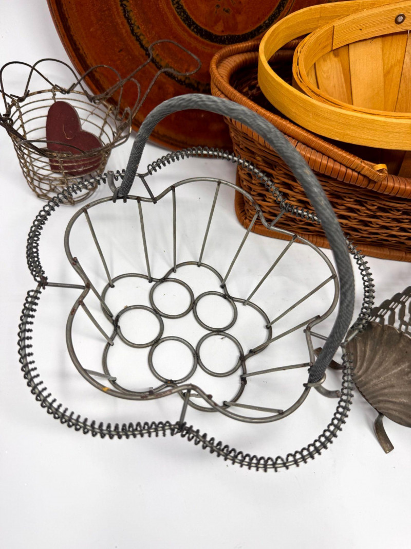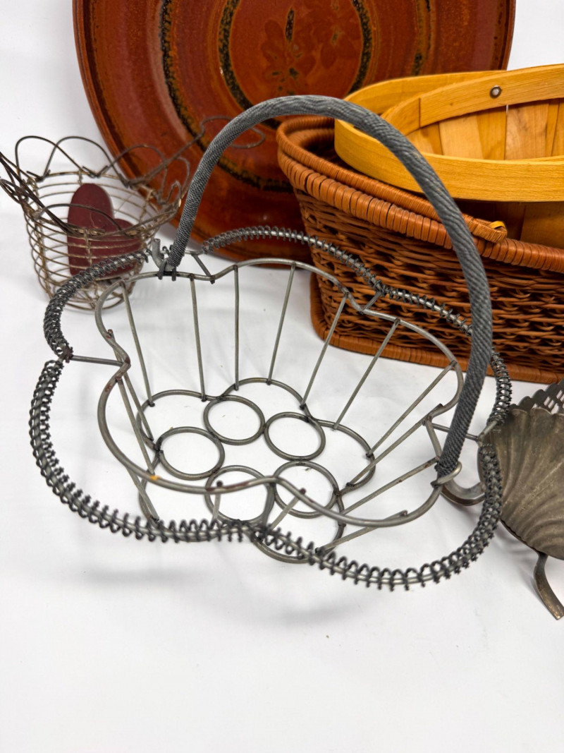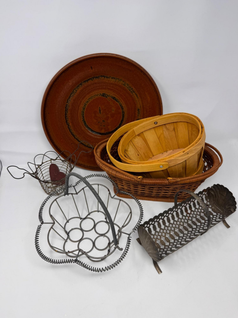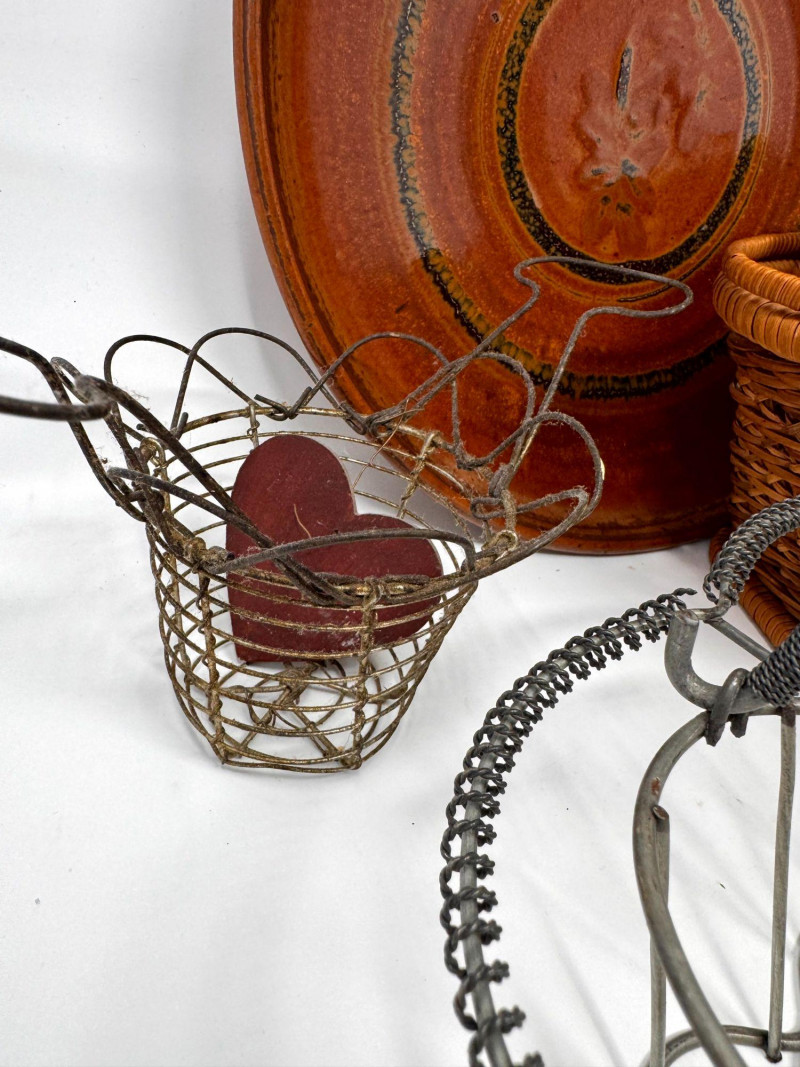 Lot # 129 - Vintage Farmhouse Baskets & Wire Egg Baskets w/ Signed Pottery Plate