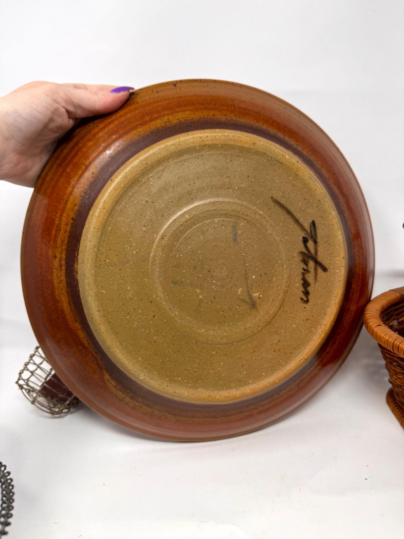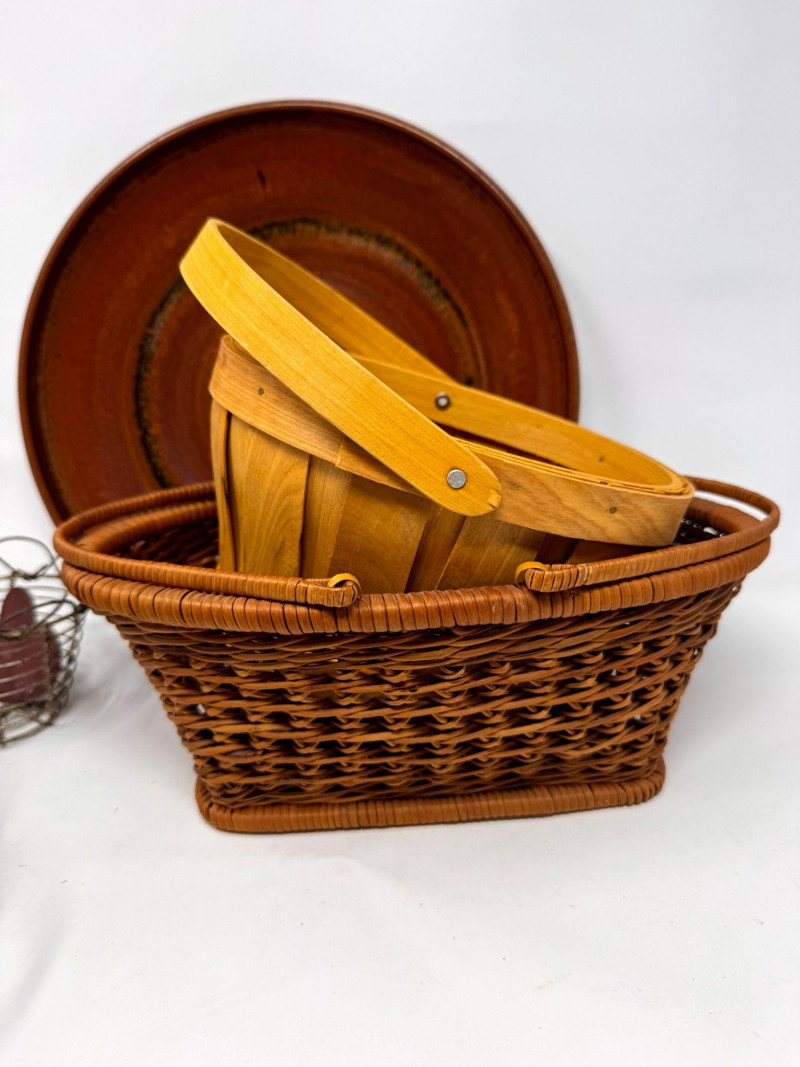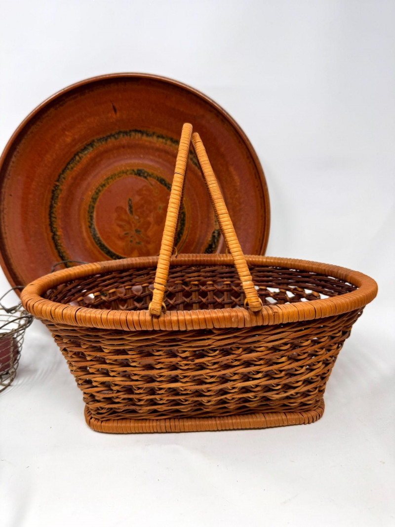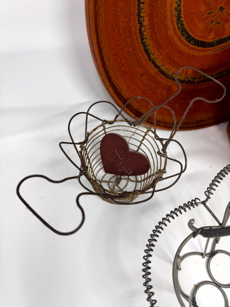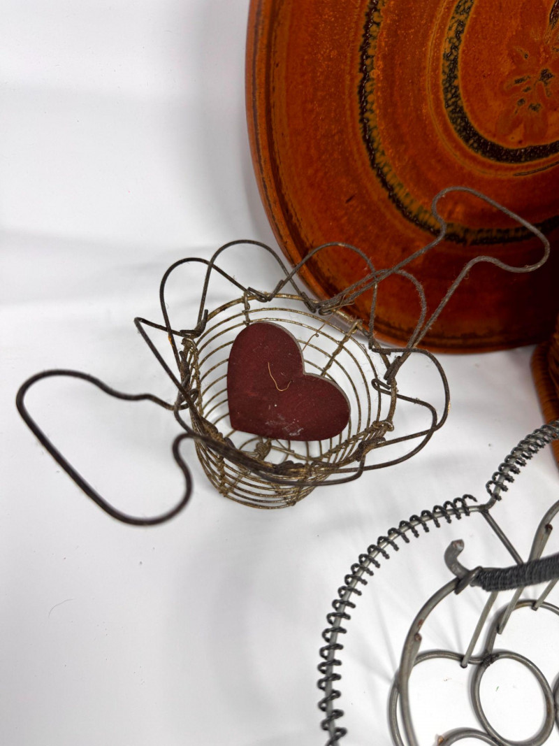 Lot # 129 - Vintage Farmhouse Baskets & Wire Egg Baskets w/ Signed Pottery Plate