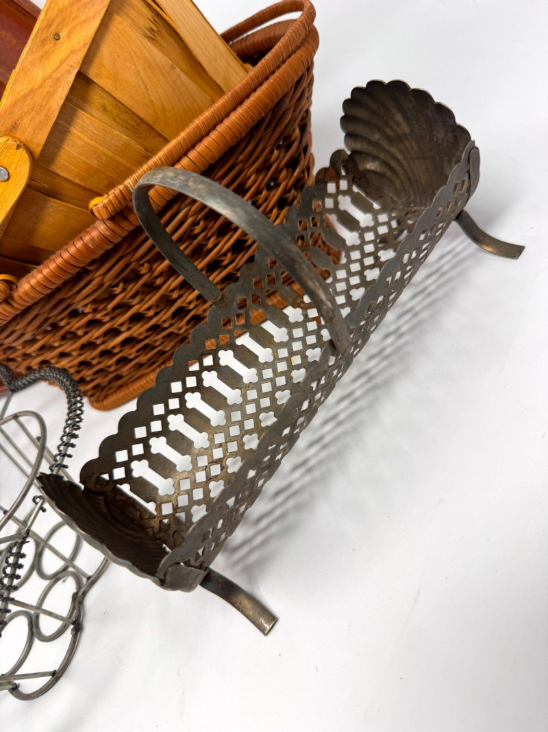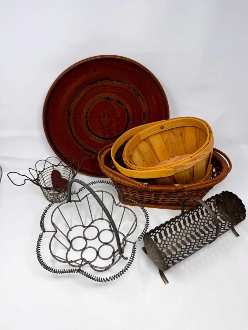 Vintage Farmhouse Baskets & Wire Egg Baskets w/ Signed Pottery Plate.