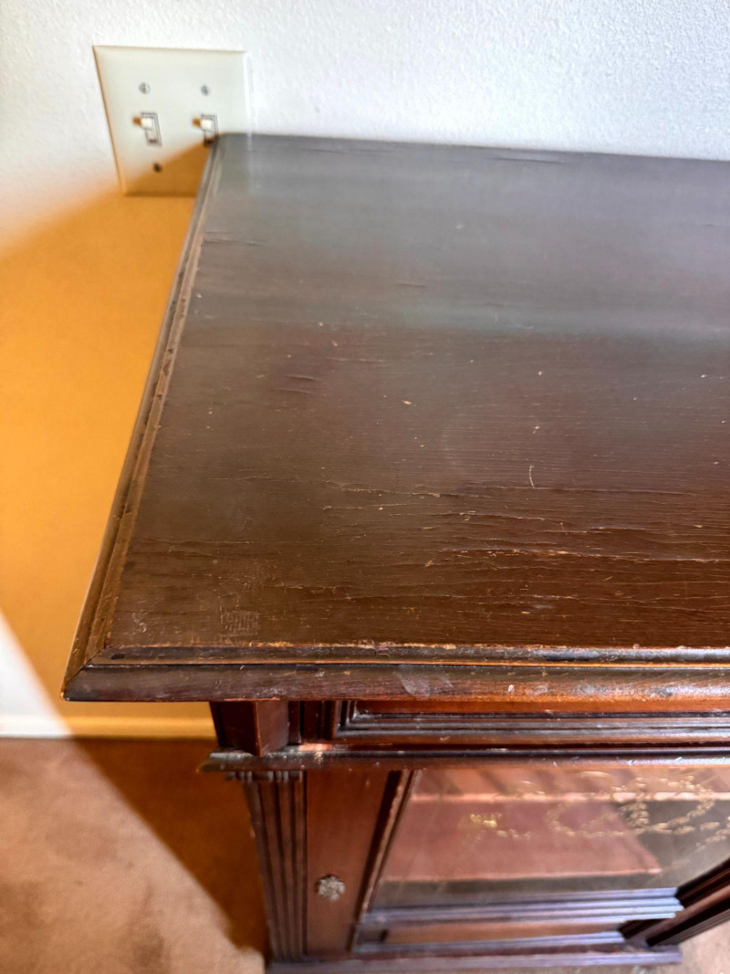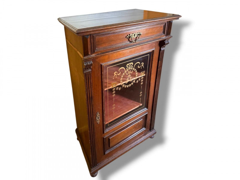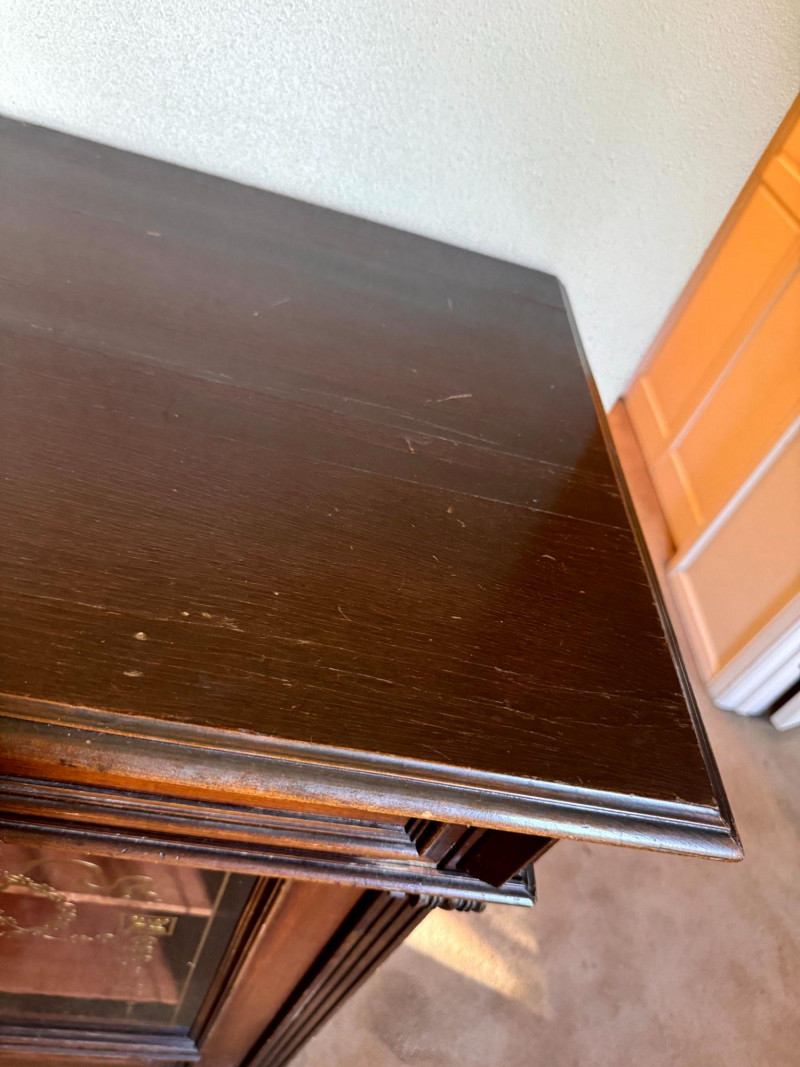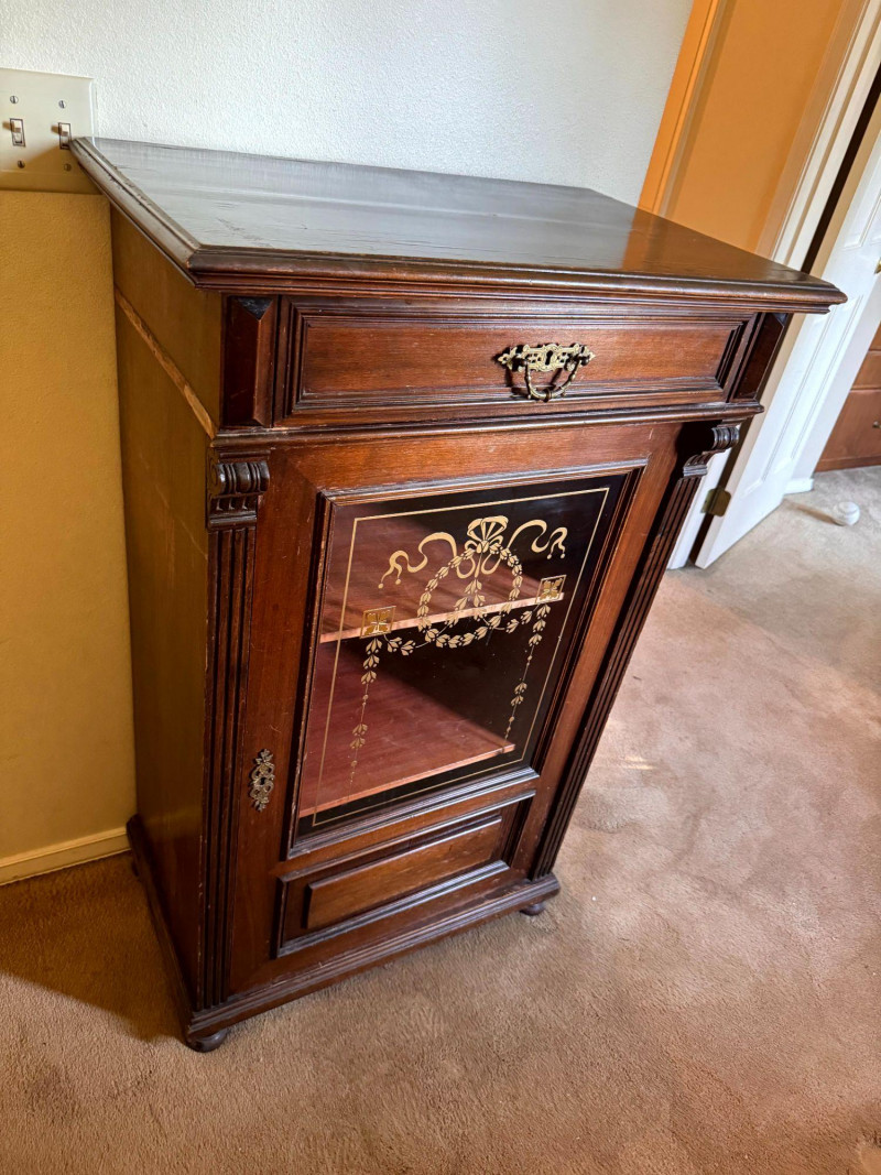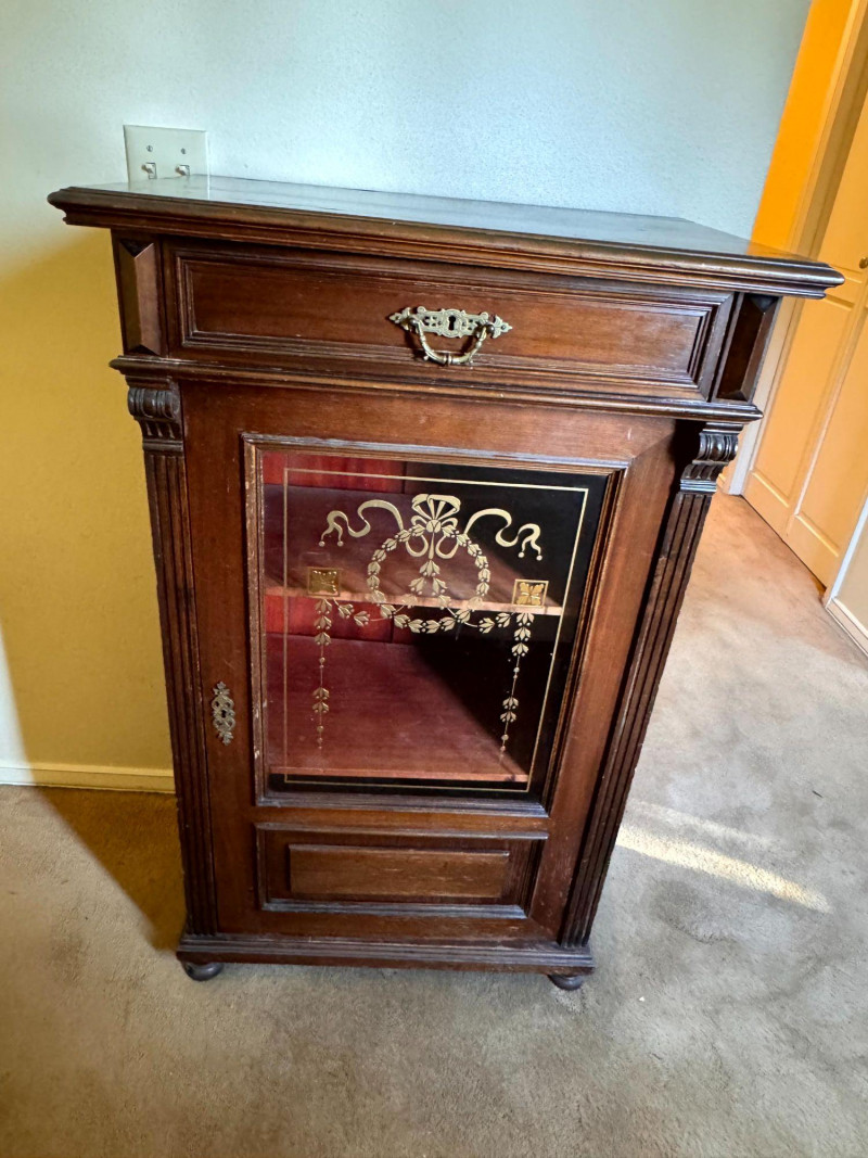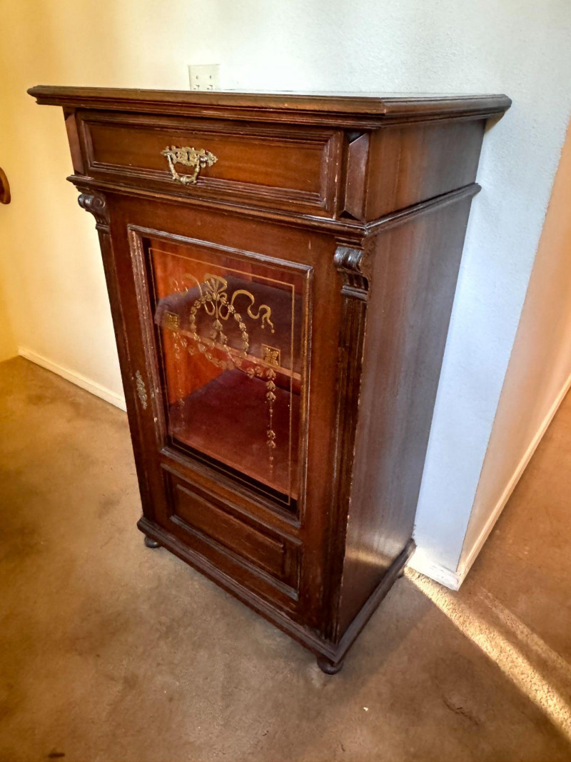 Antique Glass Front Cabinet w/ Gold Embossed Detail & Drawer. Condition notes: