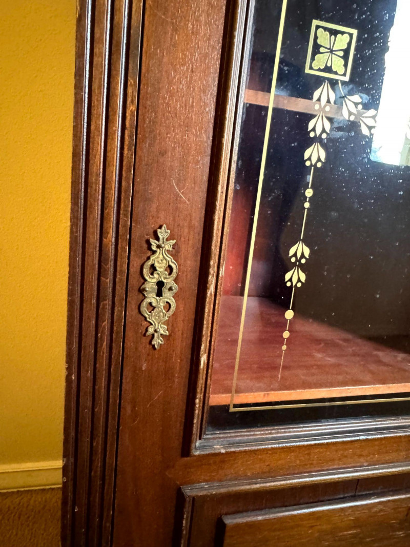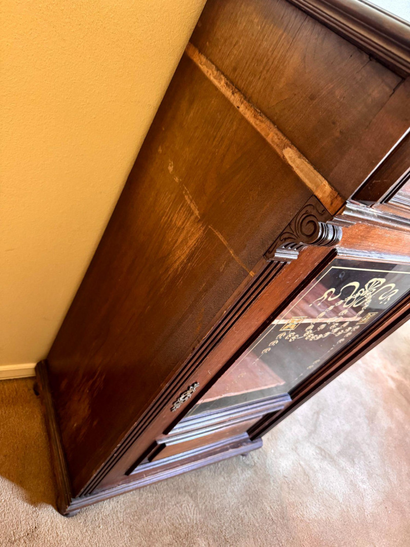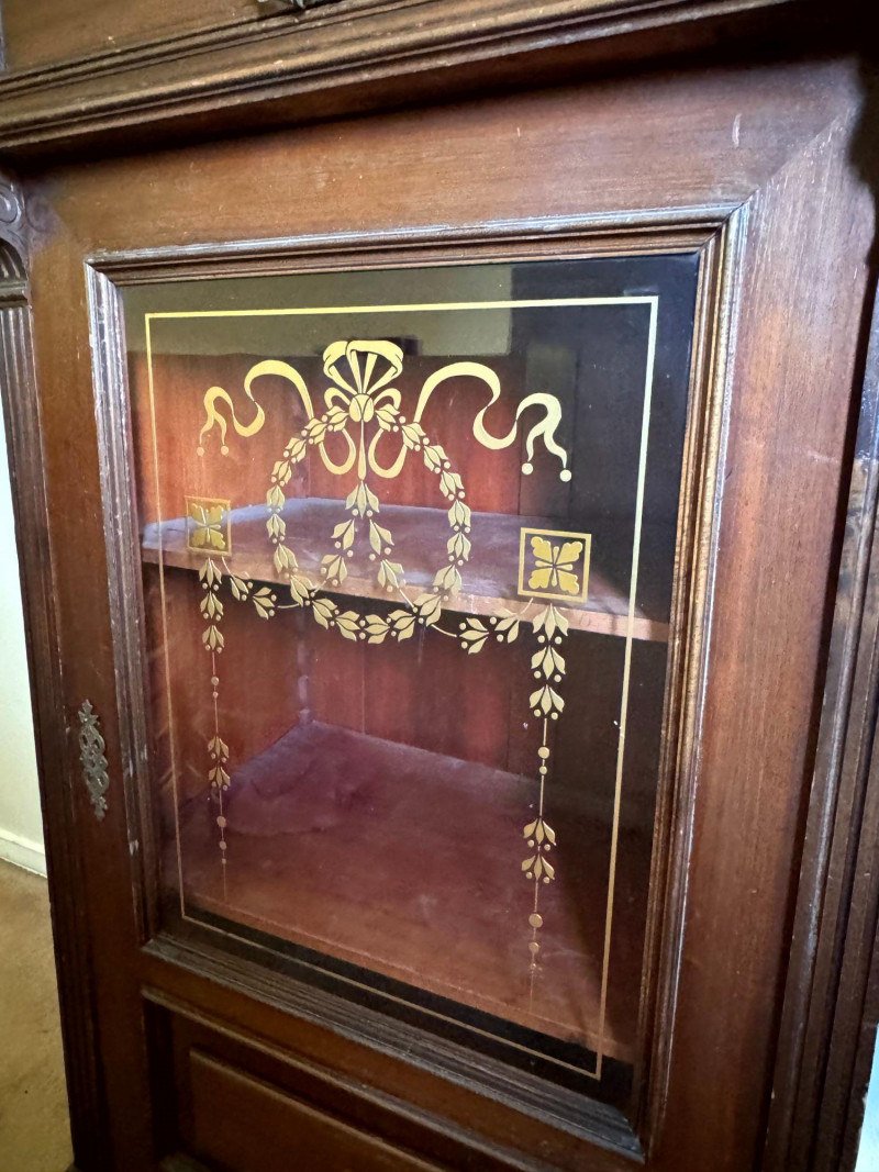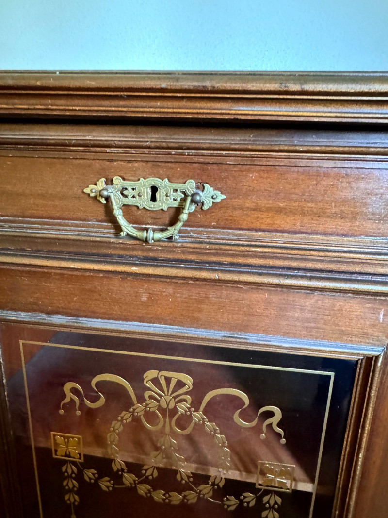 Lot # 138 - Antique Glass Front Cabinet w/ Gold Embossed Detail & Drawer
