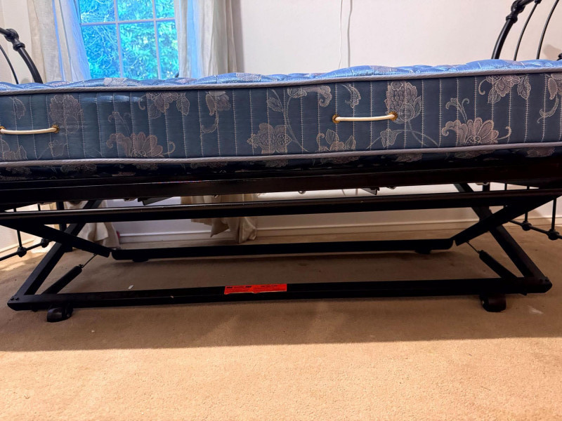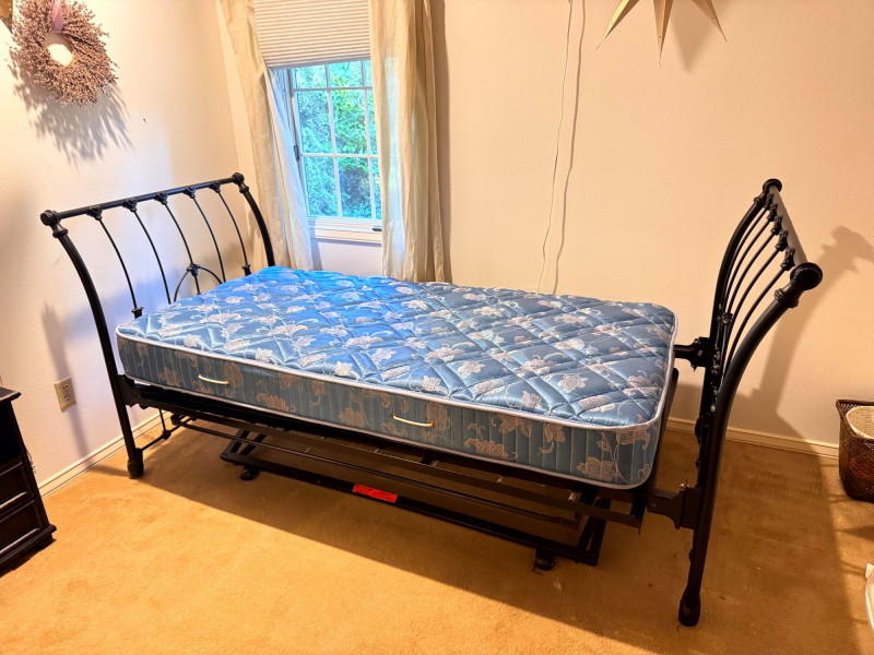 Antique Style Black Metal Twin Trundle Bed. Bidding on this lot is an agreement that: (1.) You will have at least 2 capable, able bodied persons to lift and load at a minimum. (2.) You will bring a hand truck and/or any other tools needed to remove this item. If these steps are not followed your item will be forfeit and no refund given.