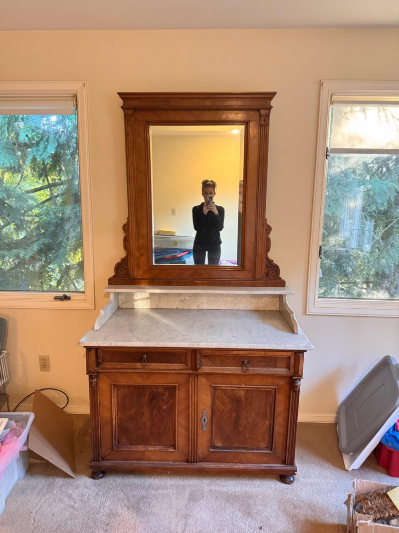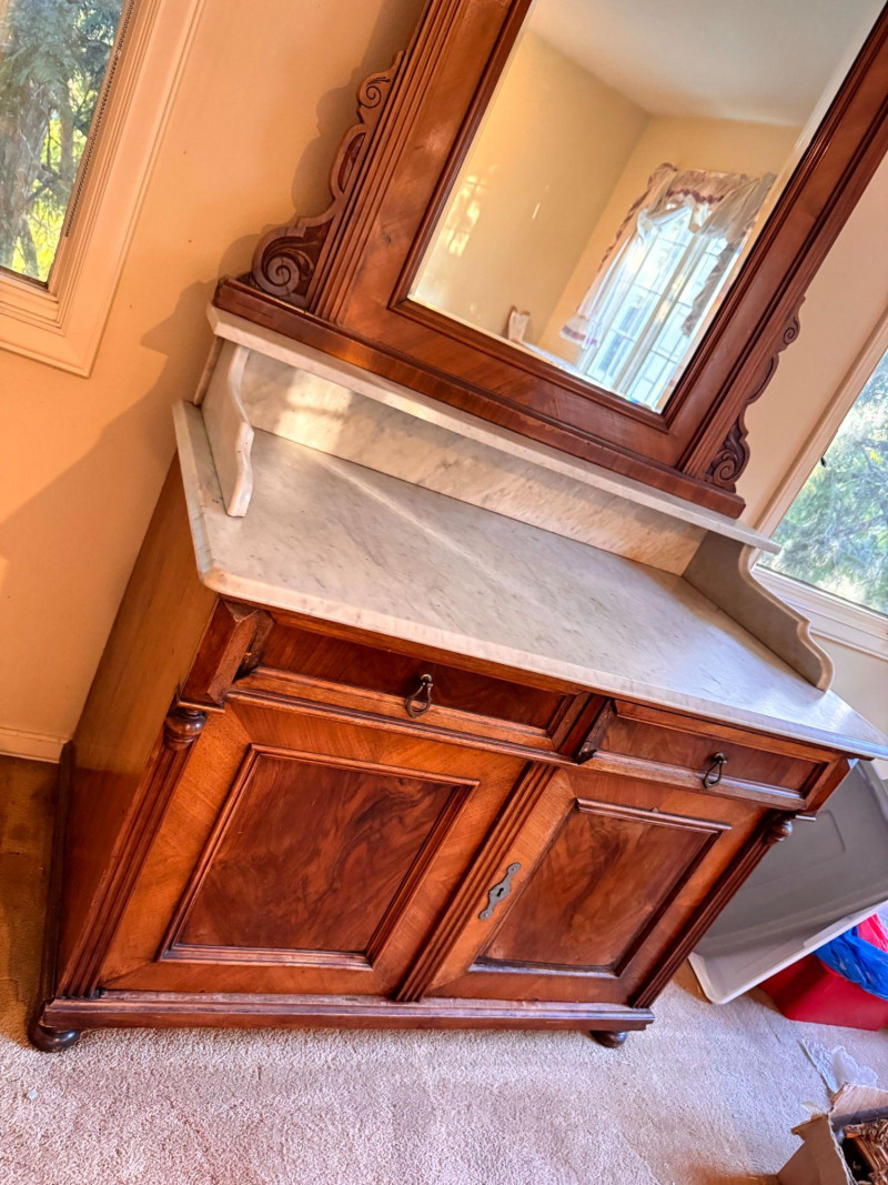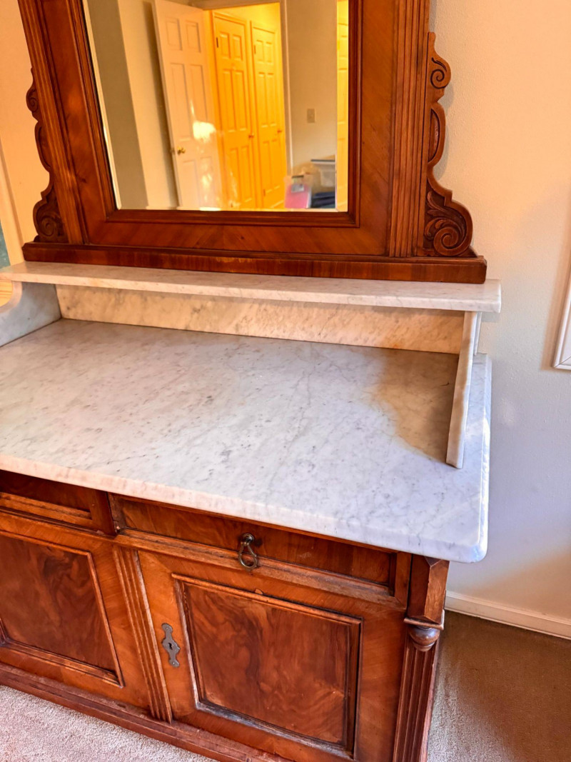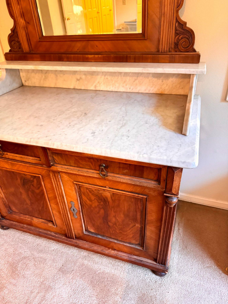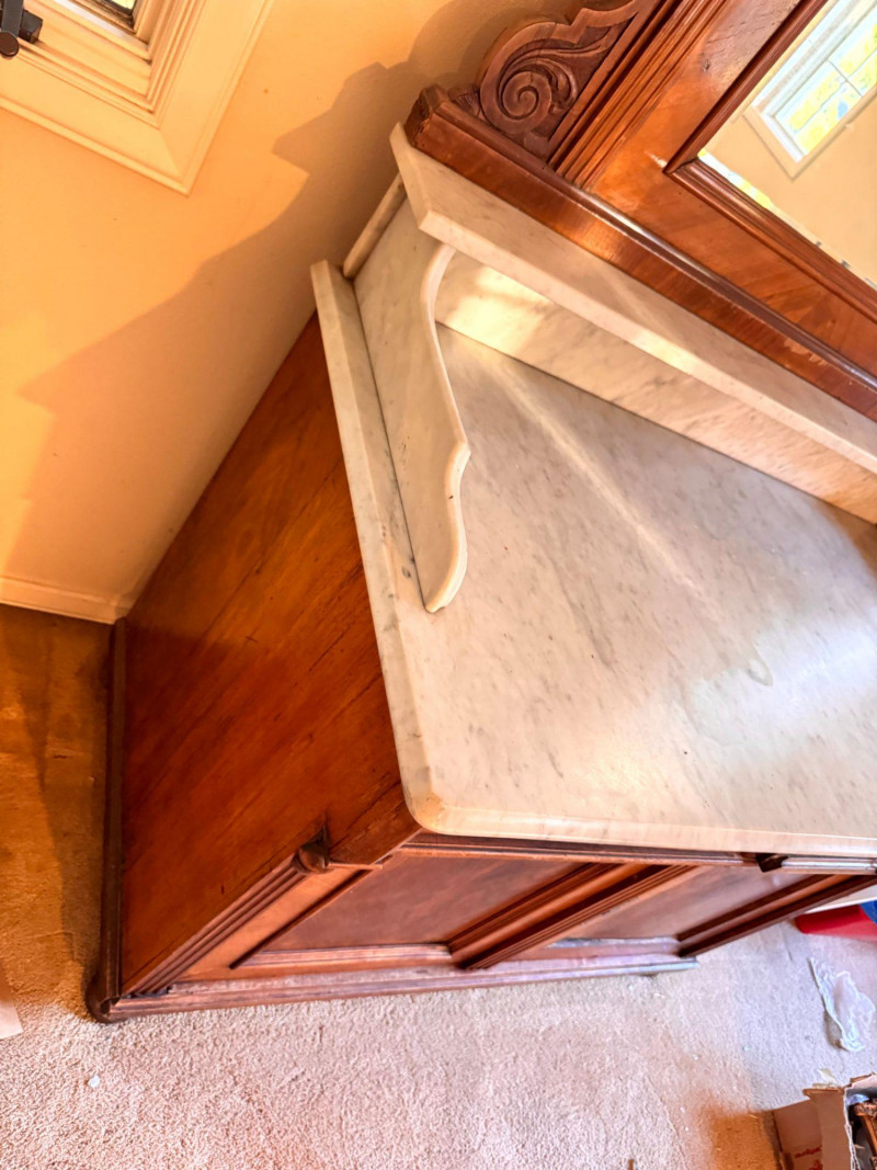 Antique Carved Wood Dresser w/ 2 Drawers, Mirror & Stone Top. Bidding on this lot is an agreement that: (1.) You will have at least 2 capable, able bodied persons to lift and load at a minimum. (2.) You will bring a hand truck and/or any other tools needed to remove this item. If these steps are not followed your item will be forfeit and no refund given.
