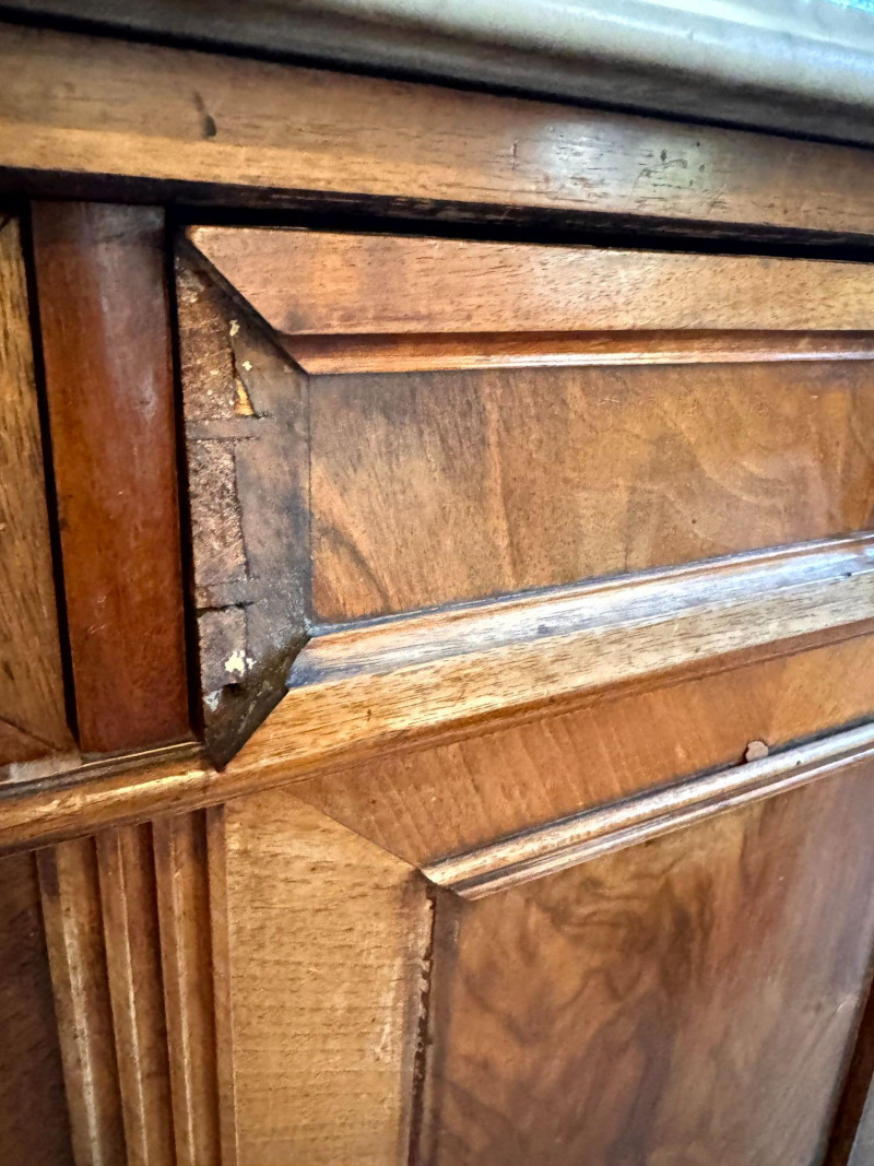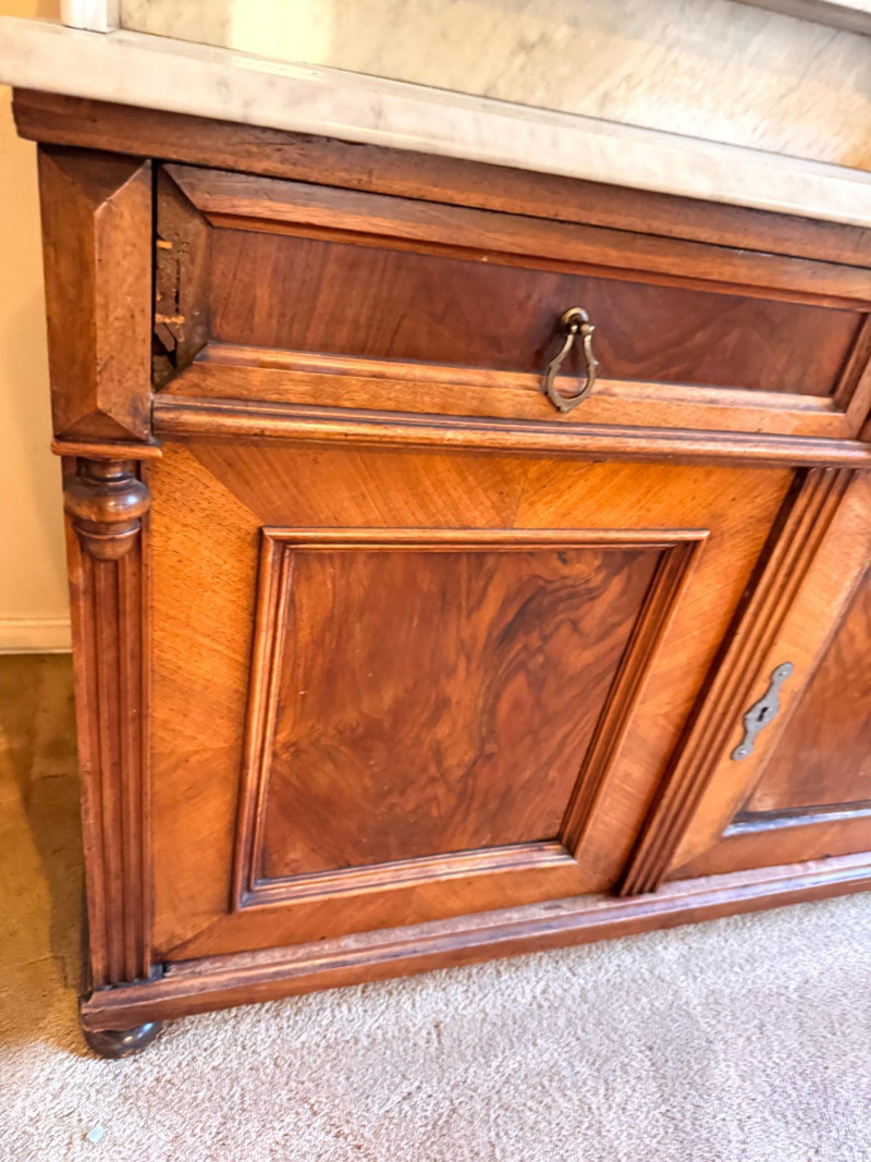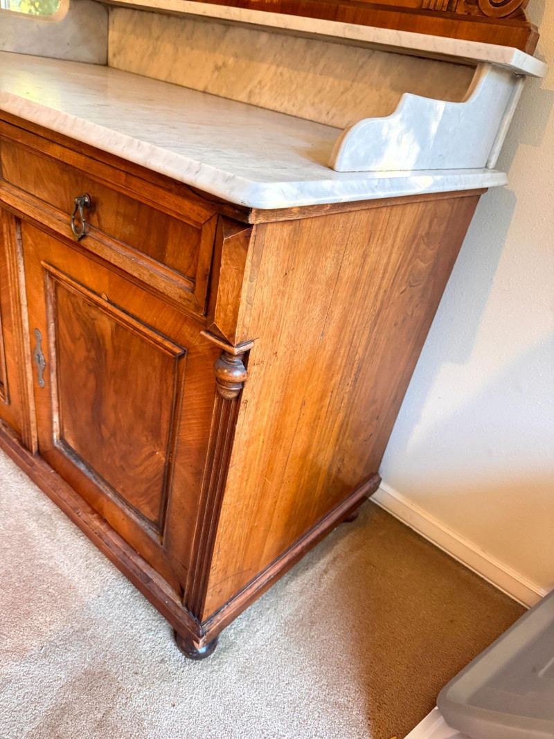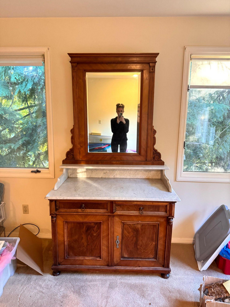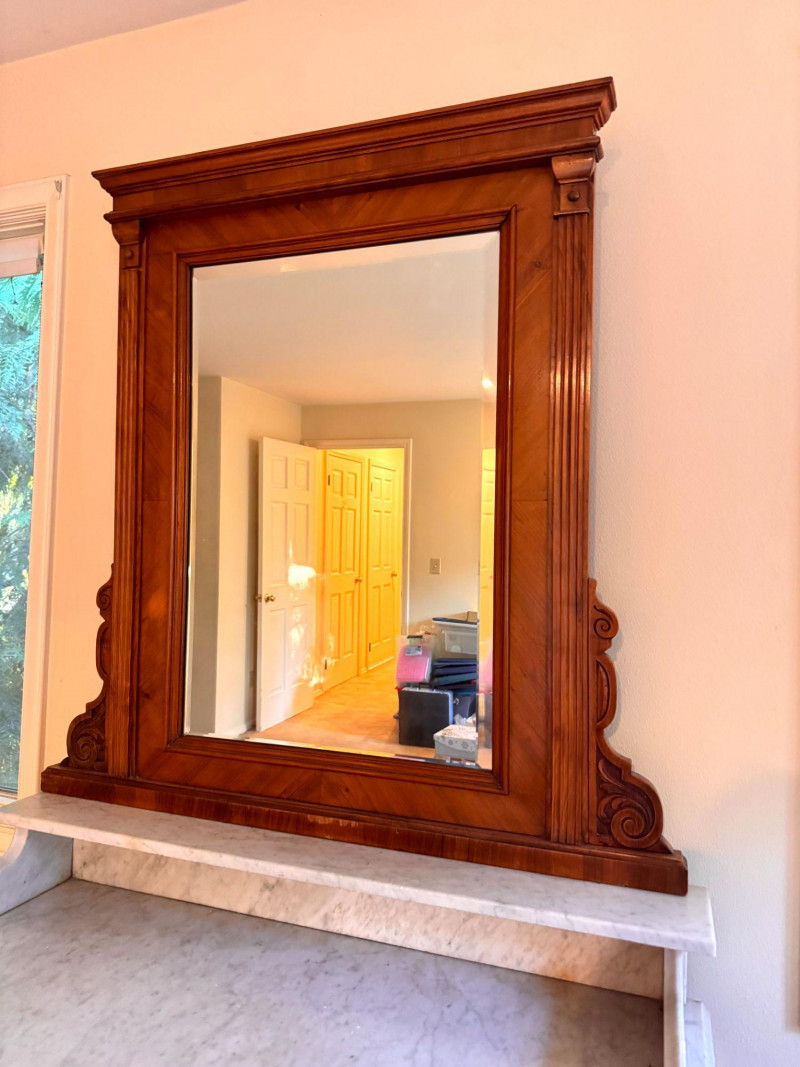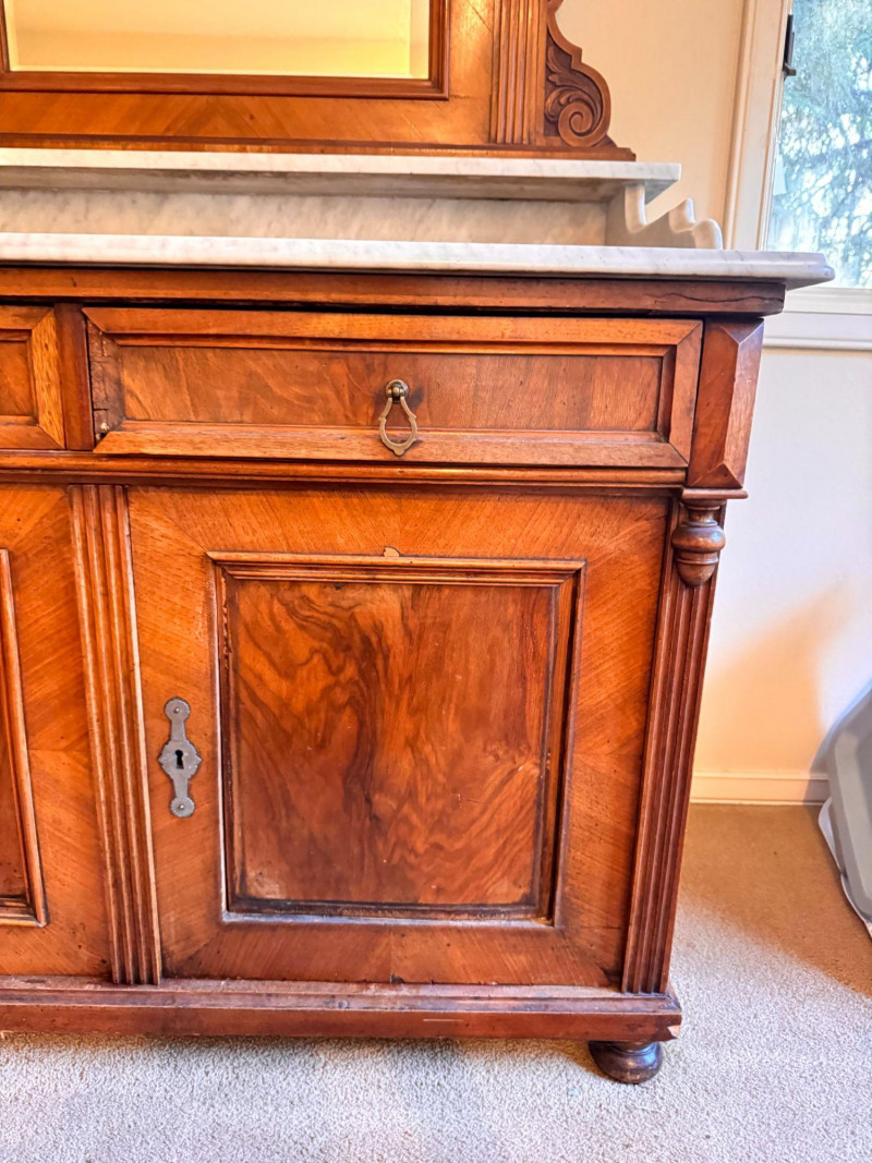 Antique Carved Wood Dresser w/ 2 Drawers, Mirror & Stone Top. Bidding on this lot is an agreement that: (1.) You will have at least 2 capable, able bodied persons to lift and load at a minimum. (2.) You will bring a hand truck and/or any other tools needed to remove this item. If these steps are not followed your item will be forfeit and no refund given.