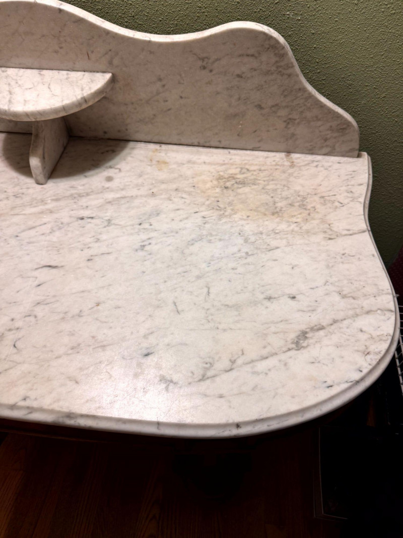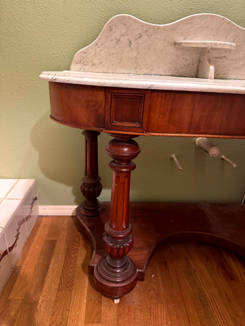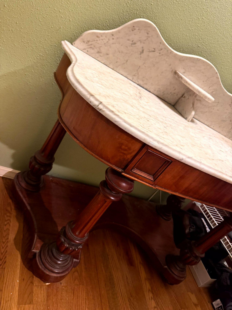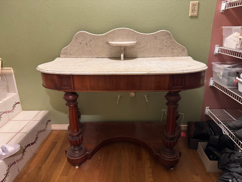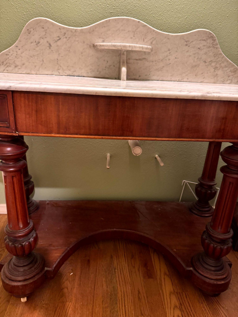 Antique Marble Top Wooden Washstand w/ Backsplash & Turned Legs.