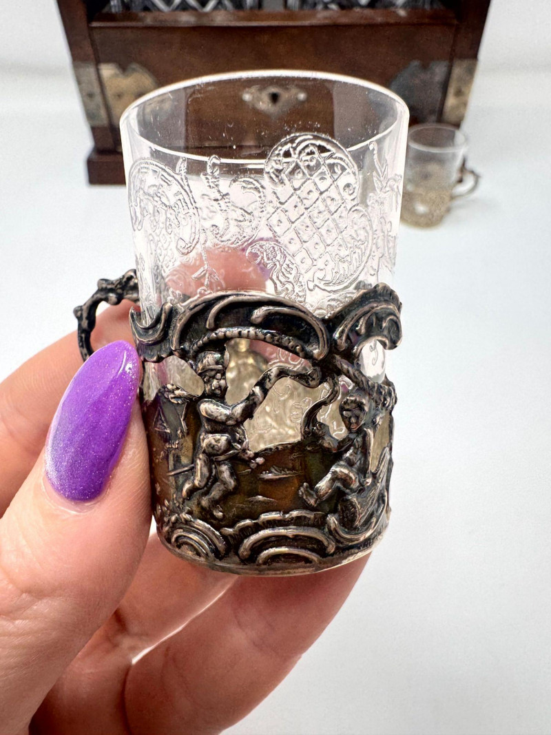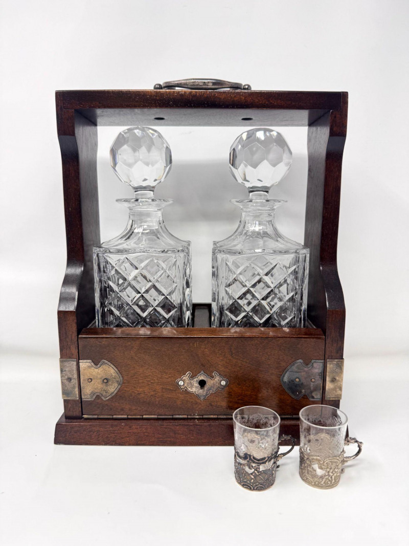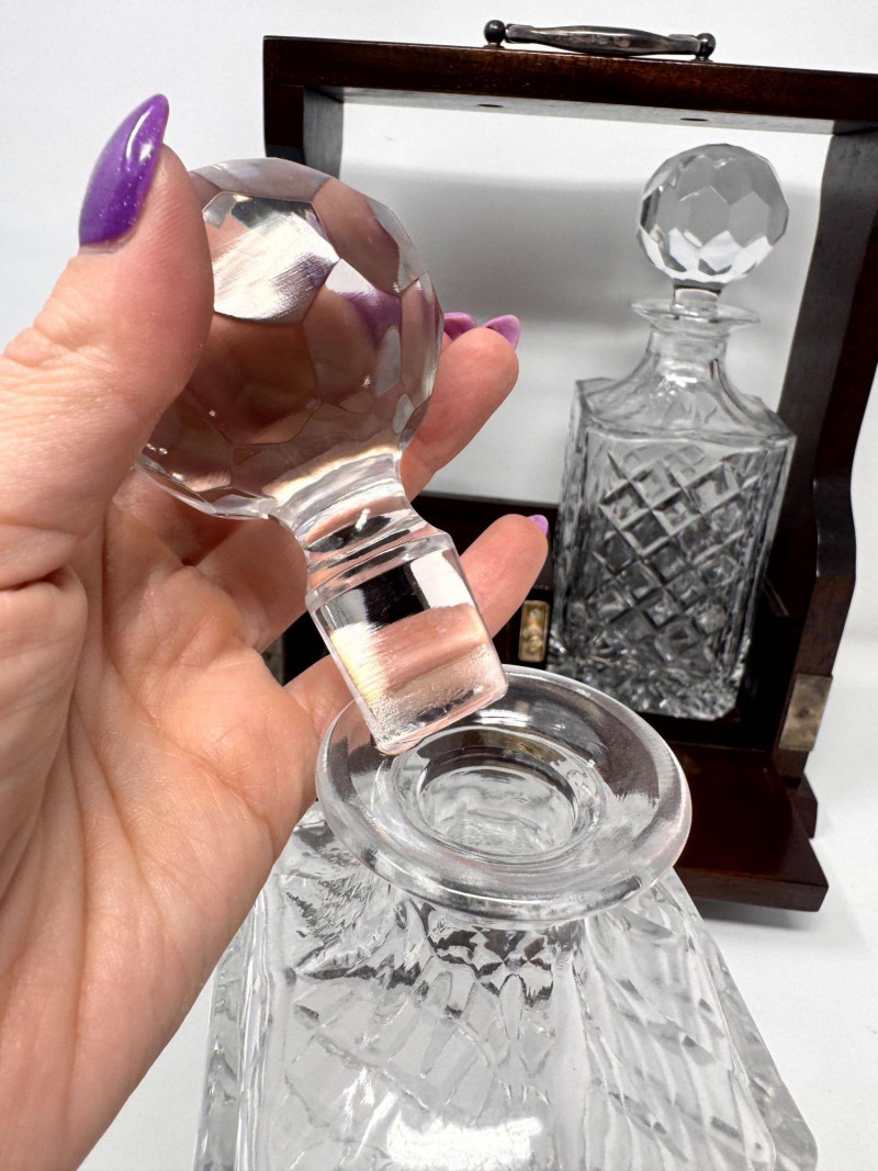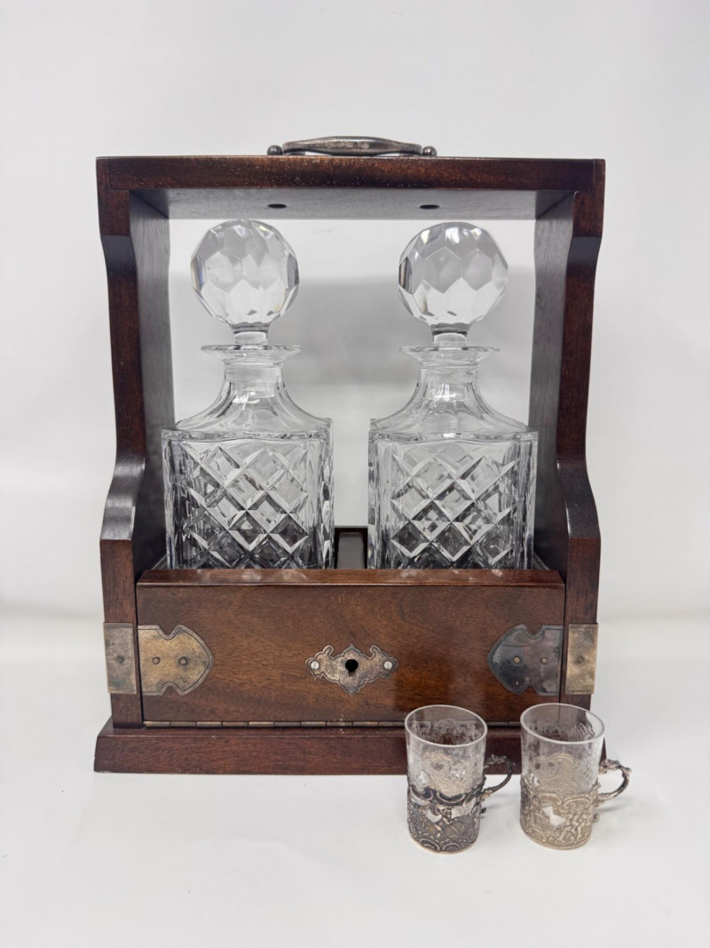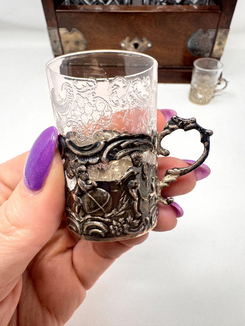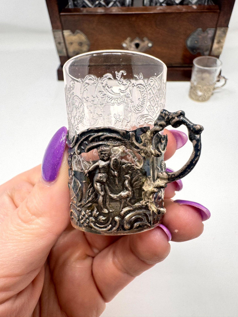 Vintage Decanter Set w/ Wood Caddy & Antique .800 Silver Shot Glasses.