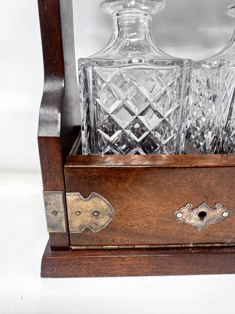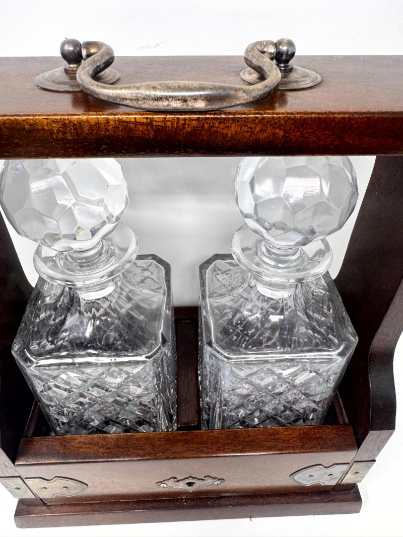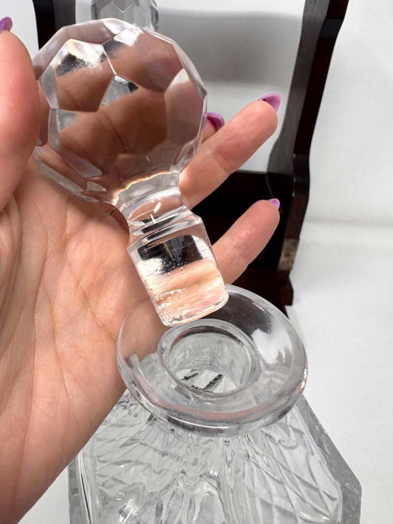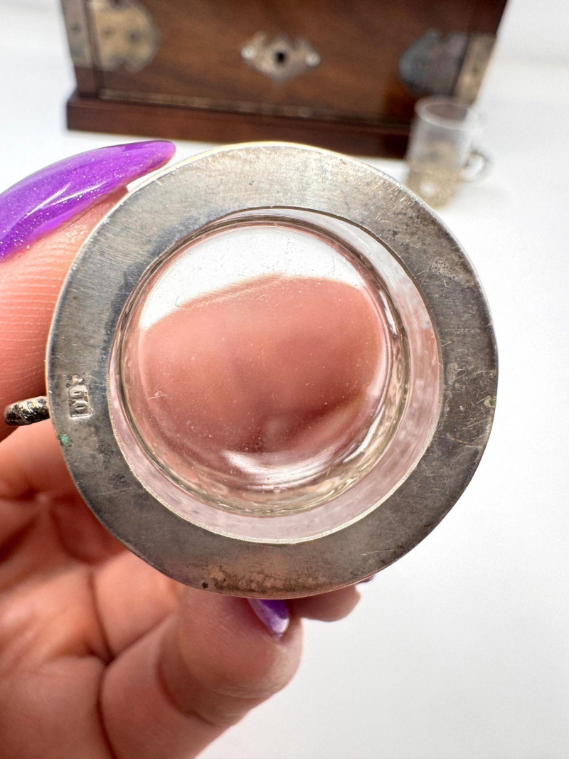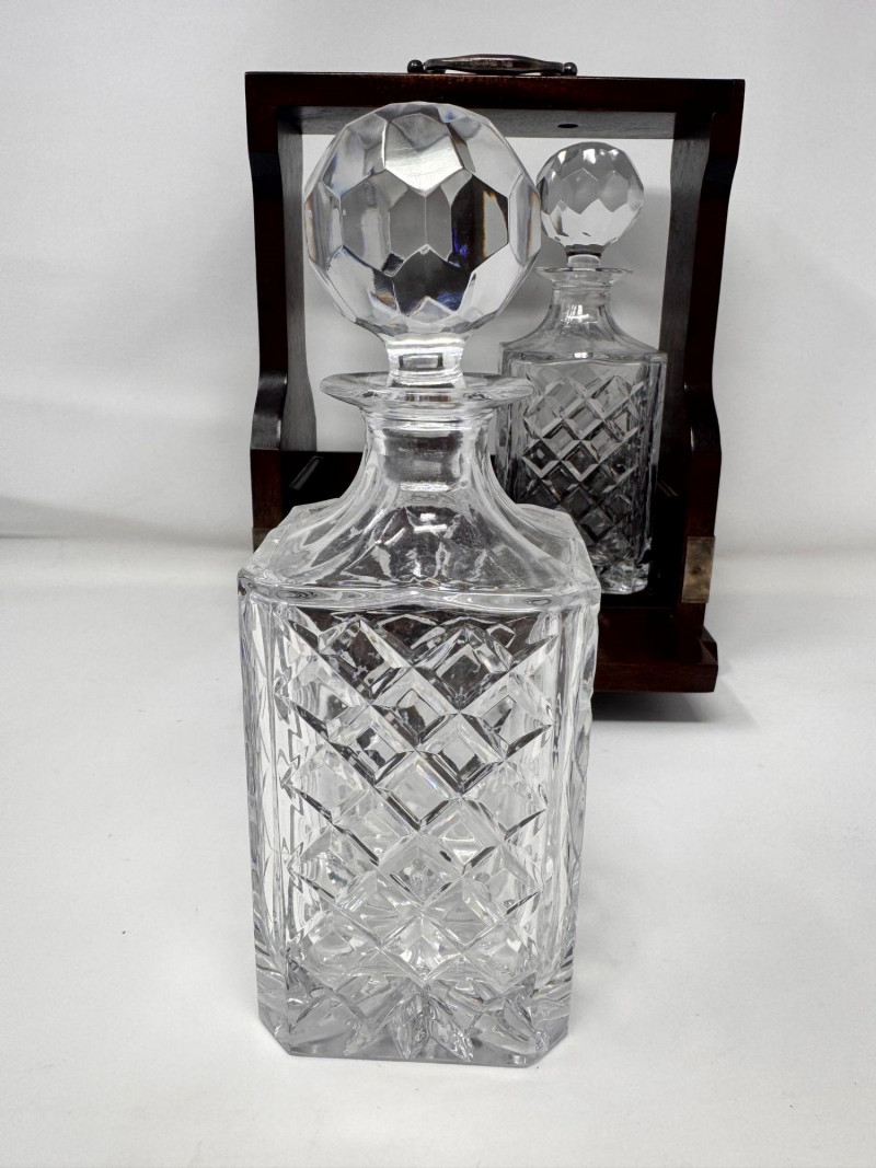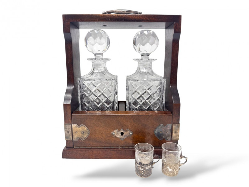 Vintage Decanter Set w/ Wood Caddy & Antique .800 Silver Shot Glasses.