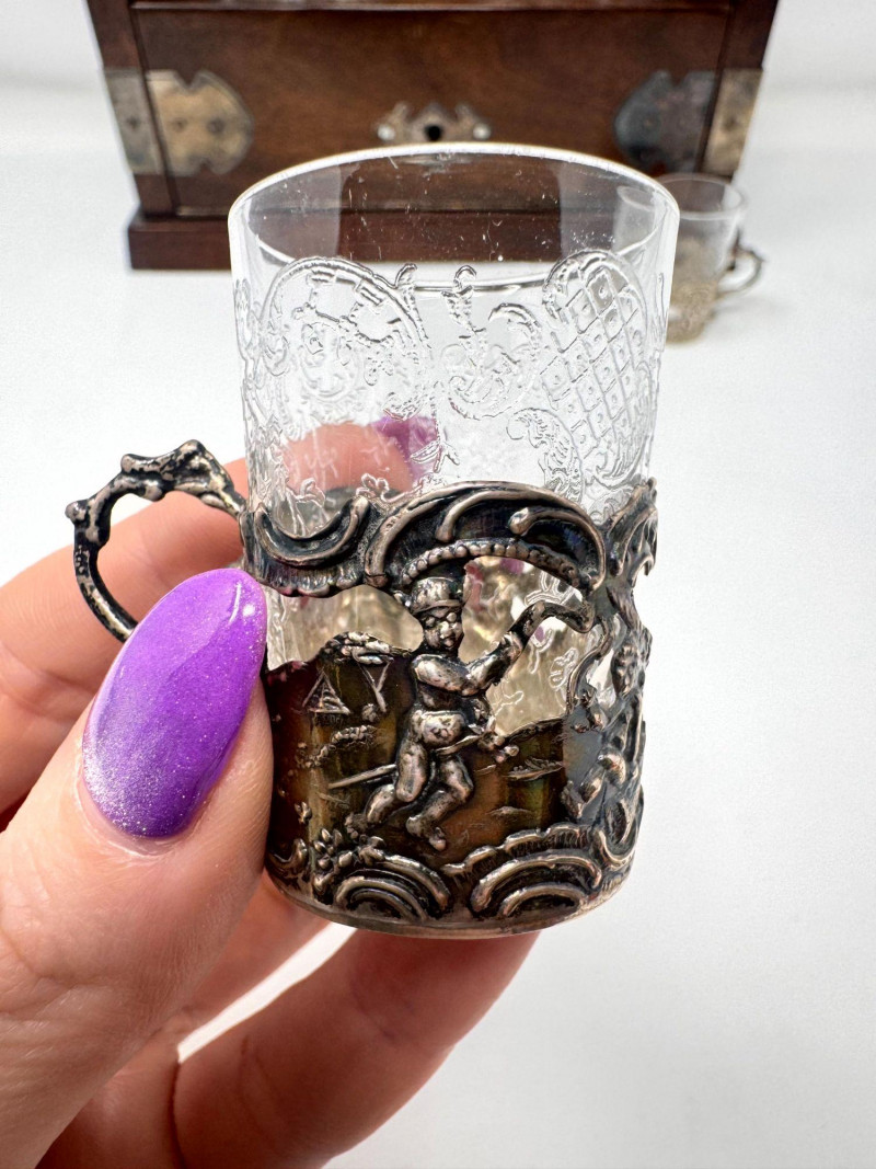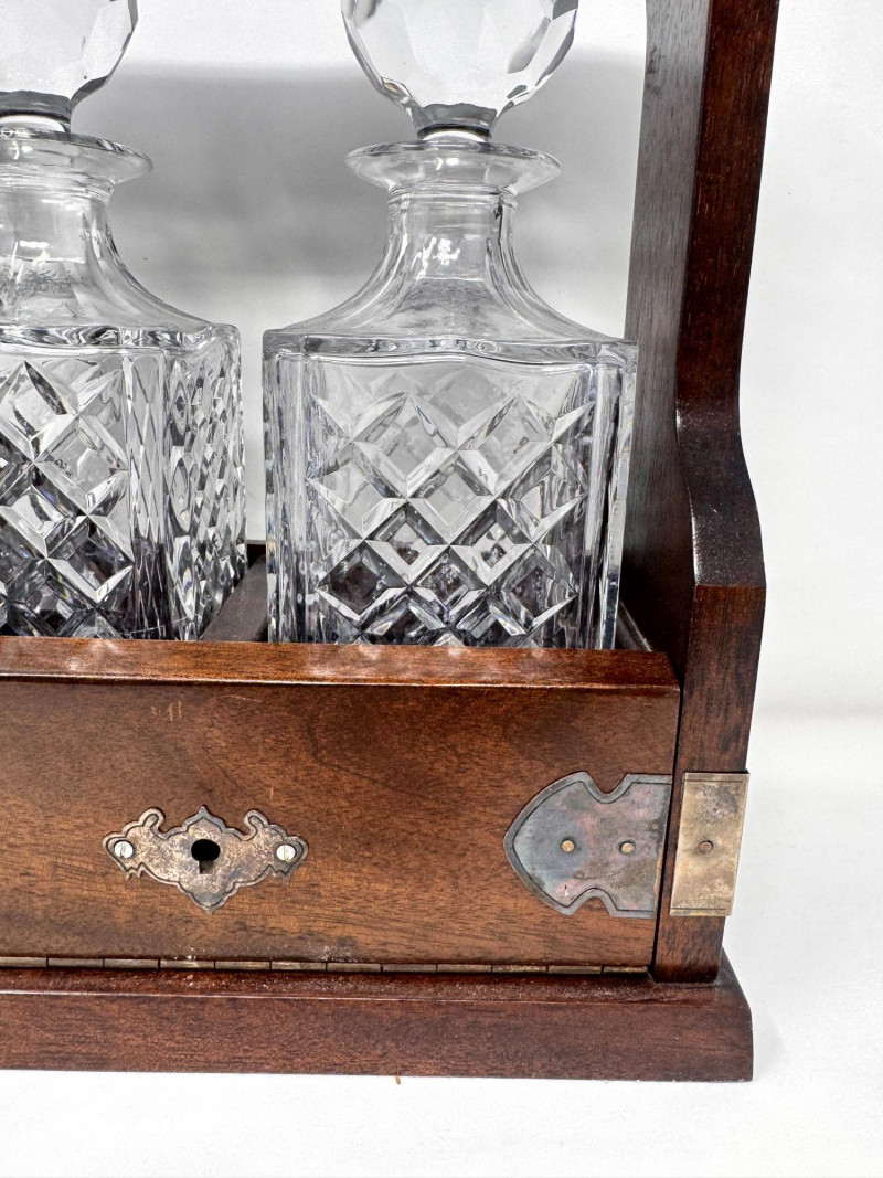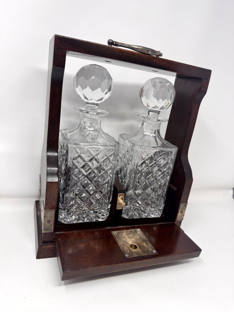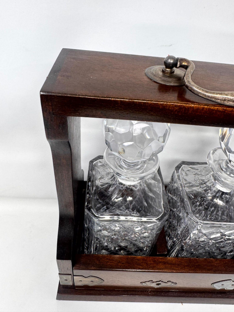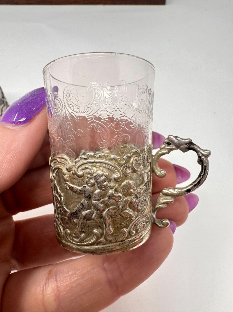 Vintage Decanter Set w/ Wood Caddy & Antique .800 Silver Shot Glasses.