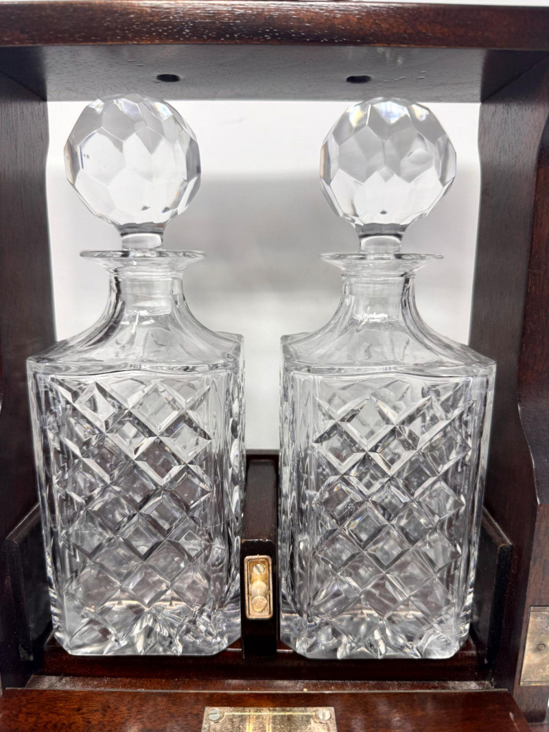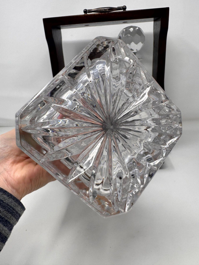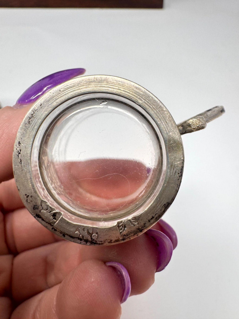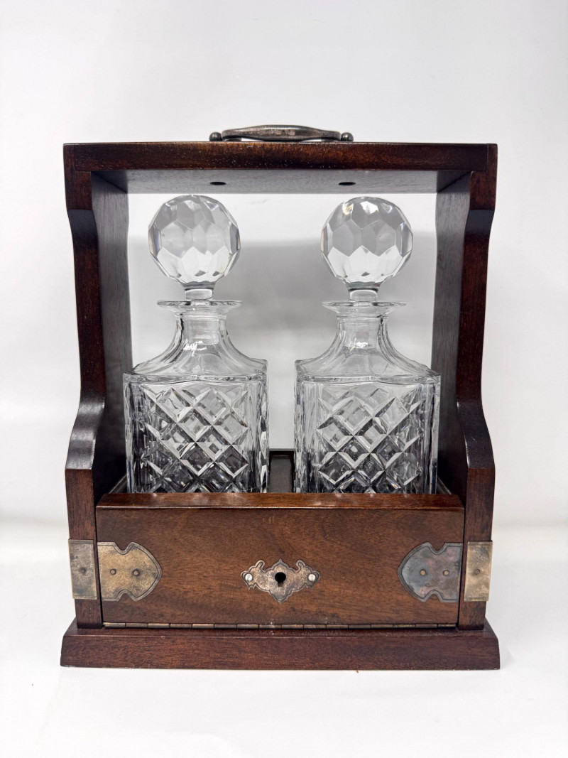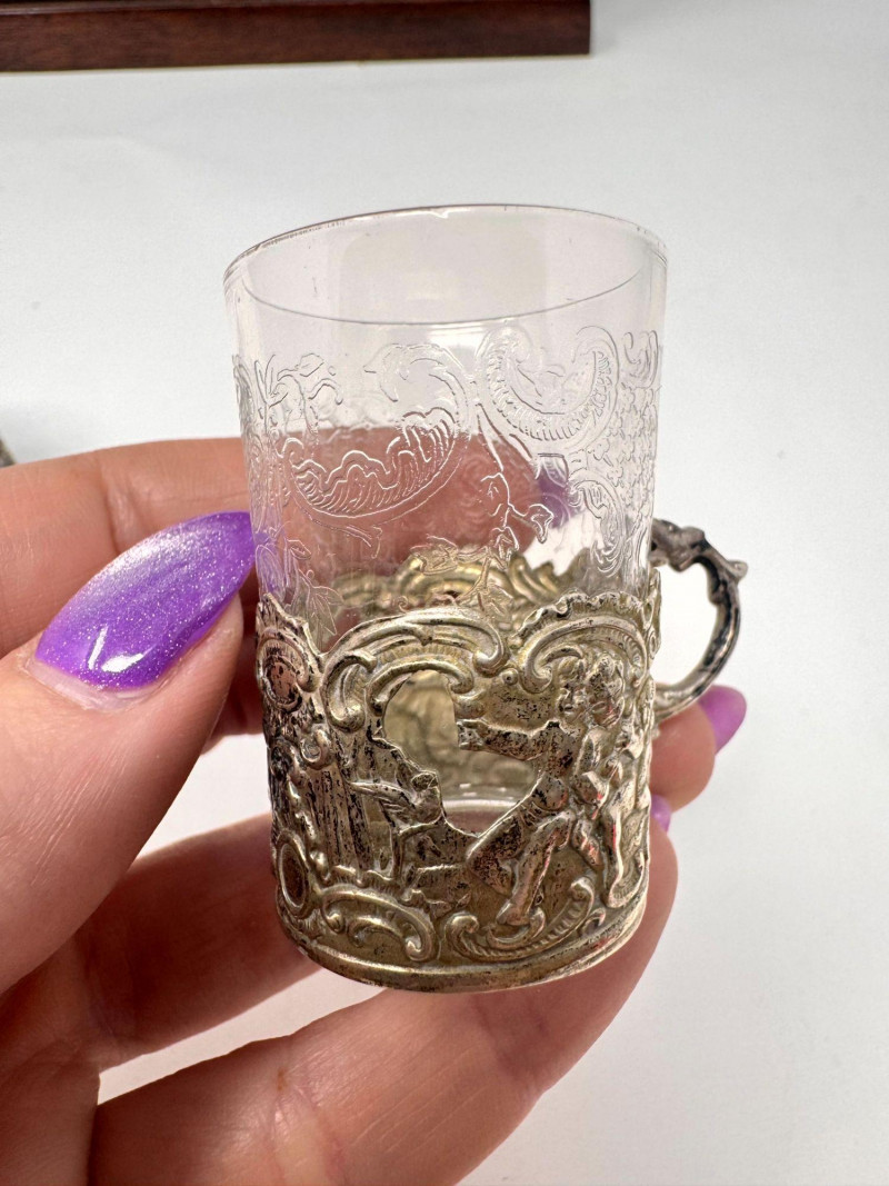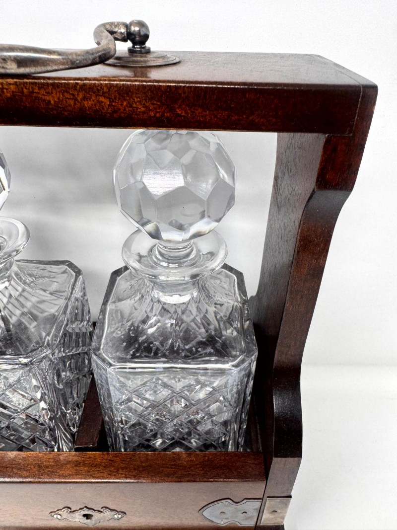 Vintage Decanter Set w/ Wood Caddy & Antique .800 Silver Shot Glasses.