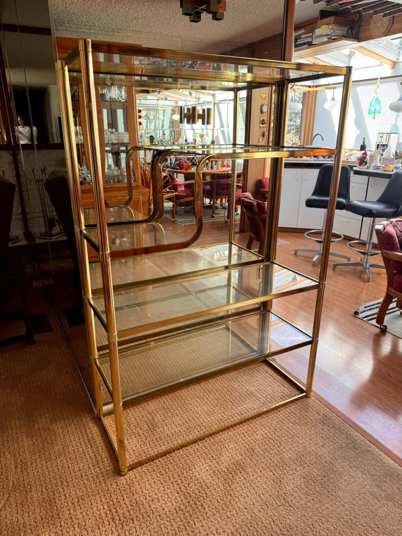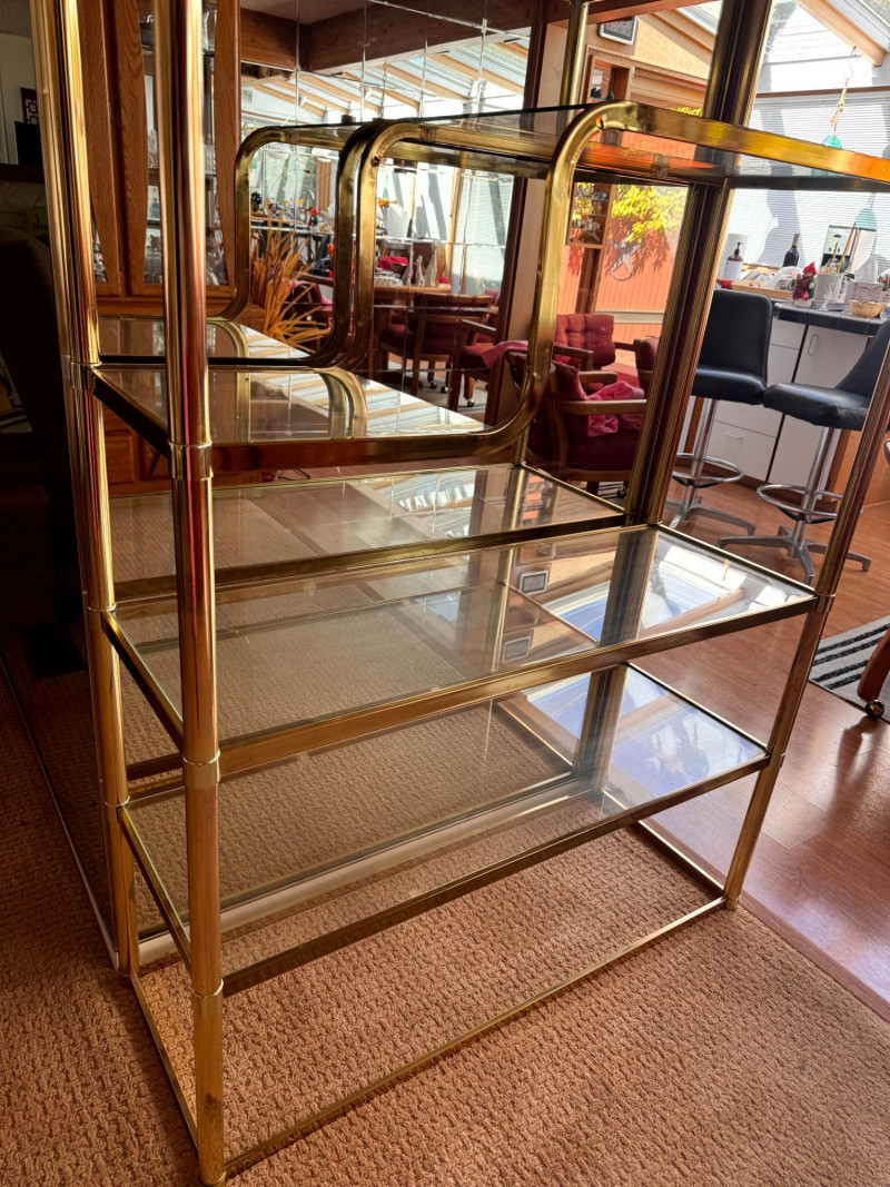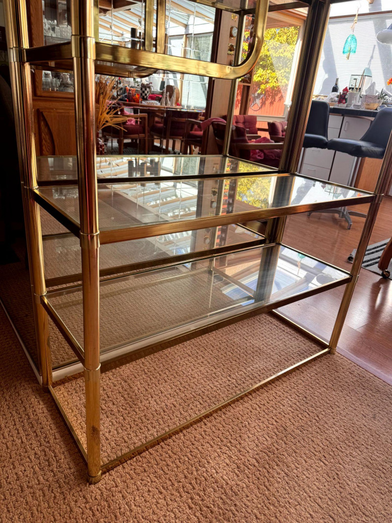 Vintage Gold Tone Etagere Glass Shelves in Milo Baughman Style.