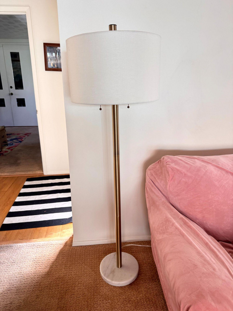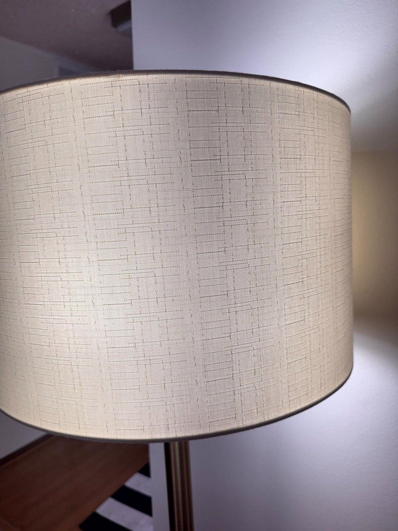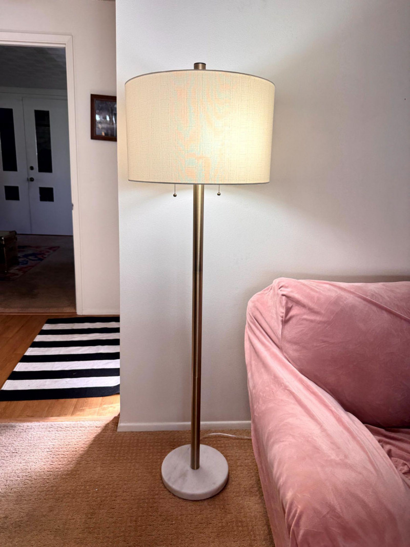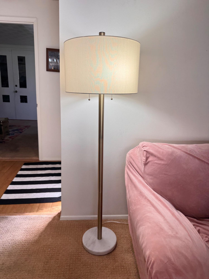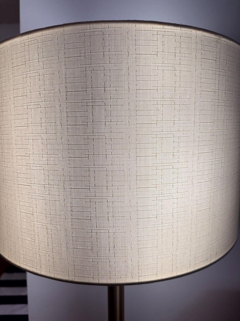 Modern Brass Tall Floor Lamp w/ Marble Base & Large Drum Shade.