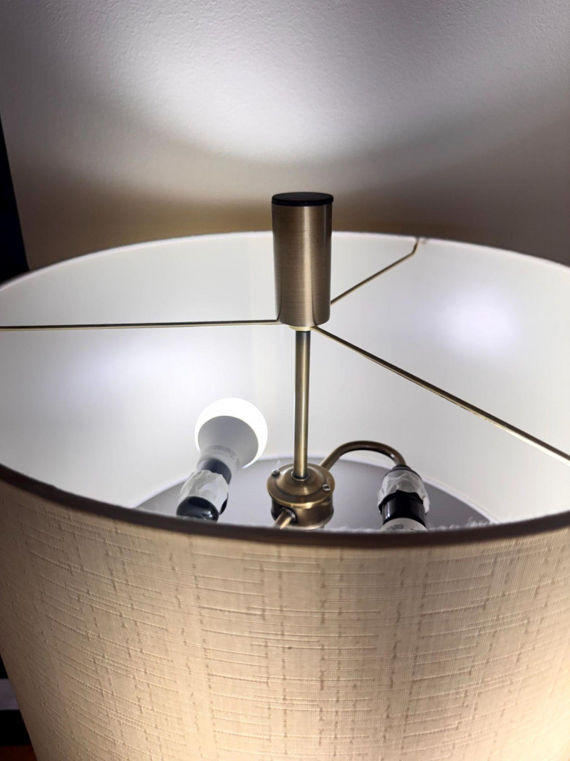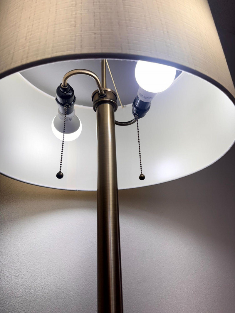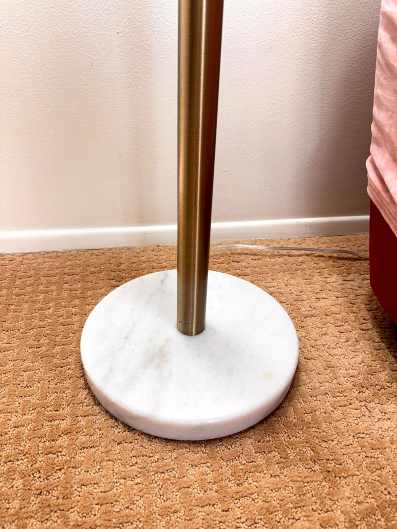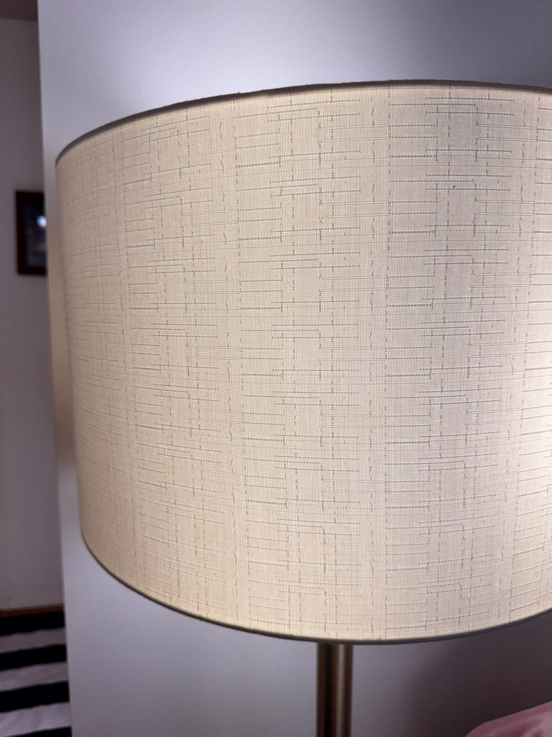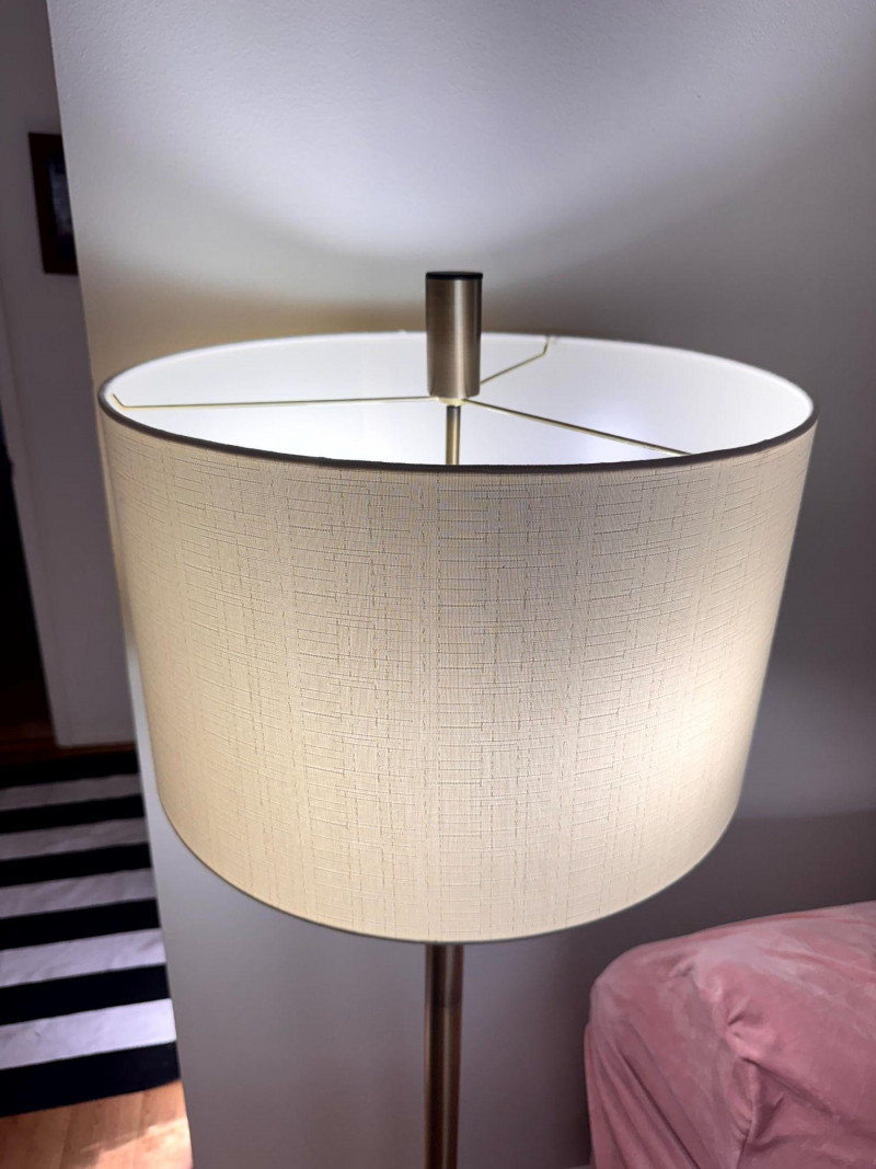 Modern Brass Tall Floor Lamp w/ Marble Base & Large Drum Shade.